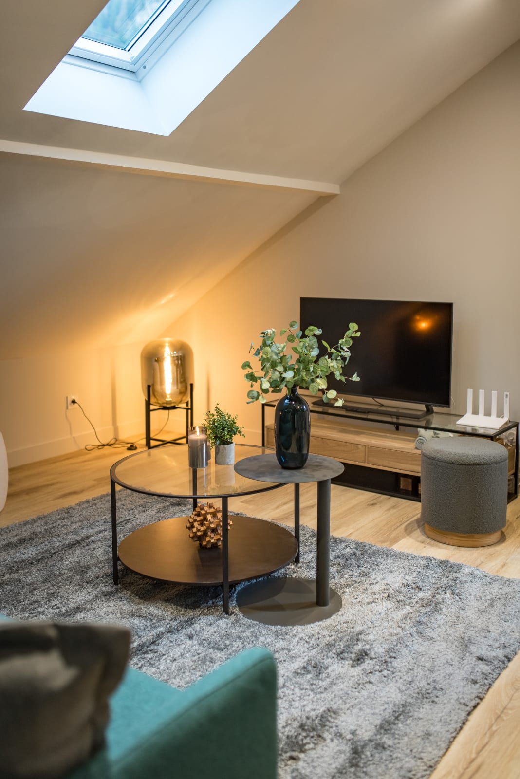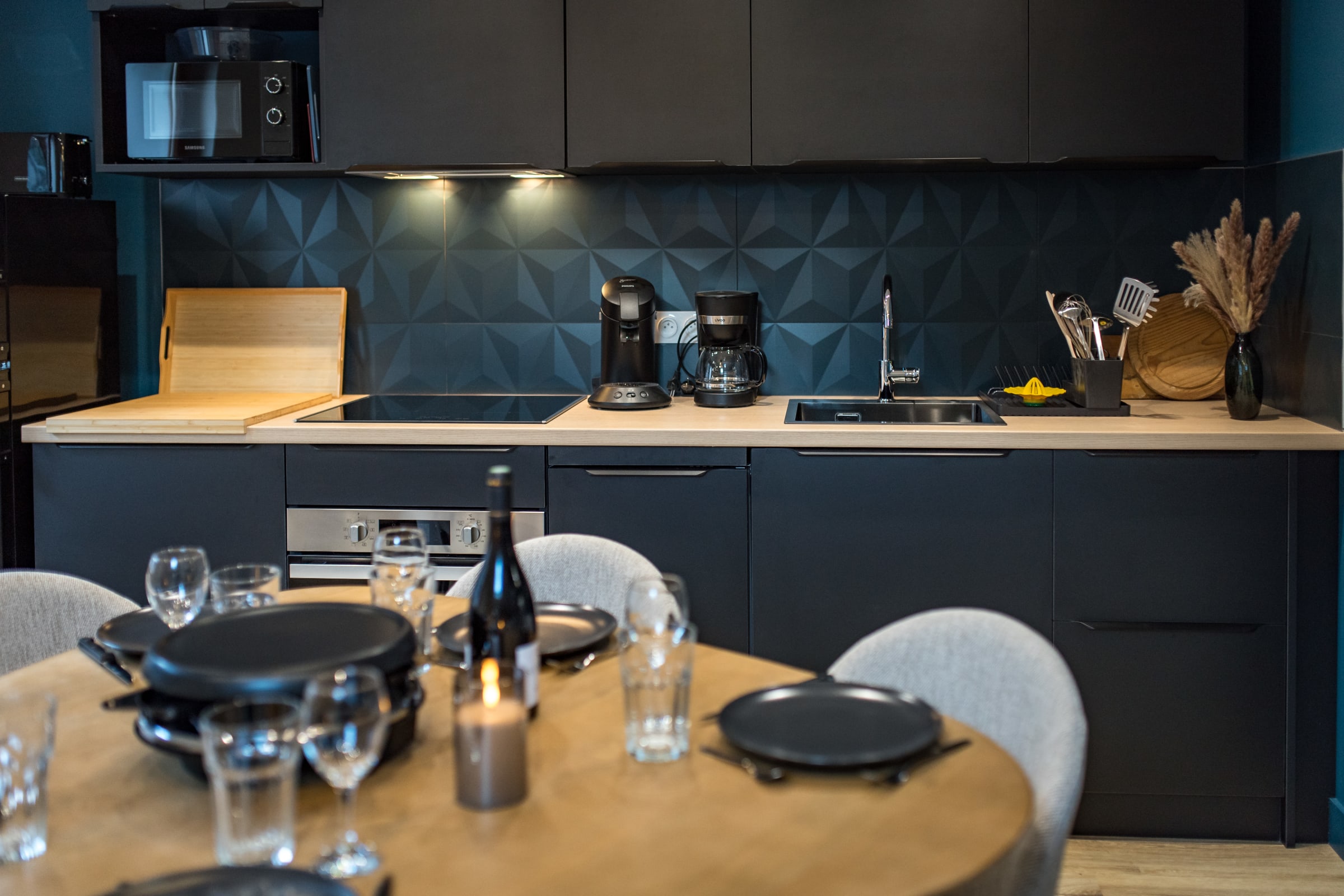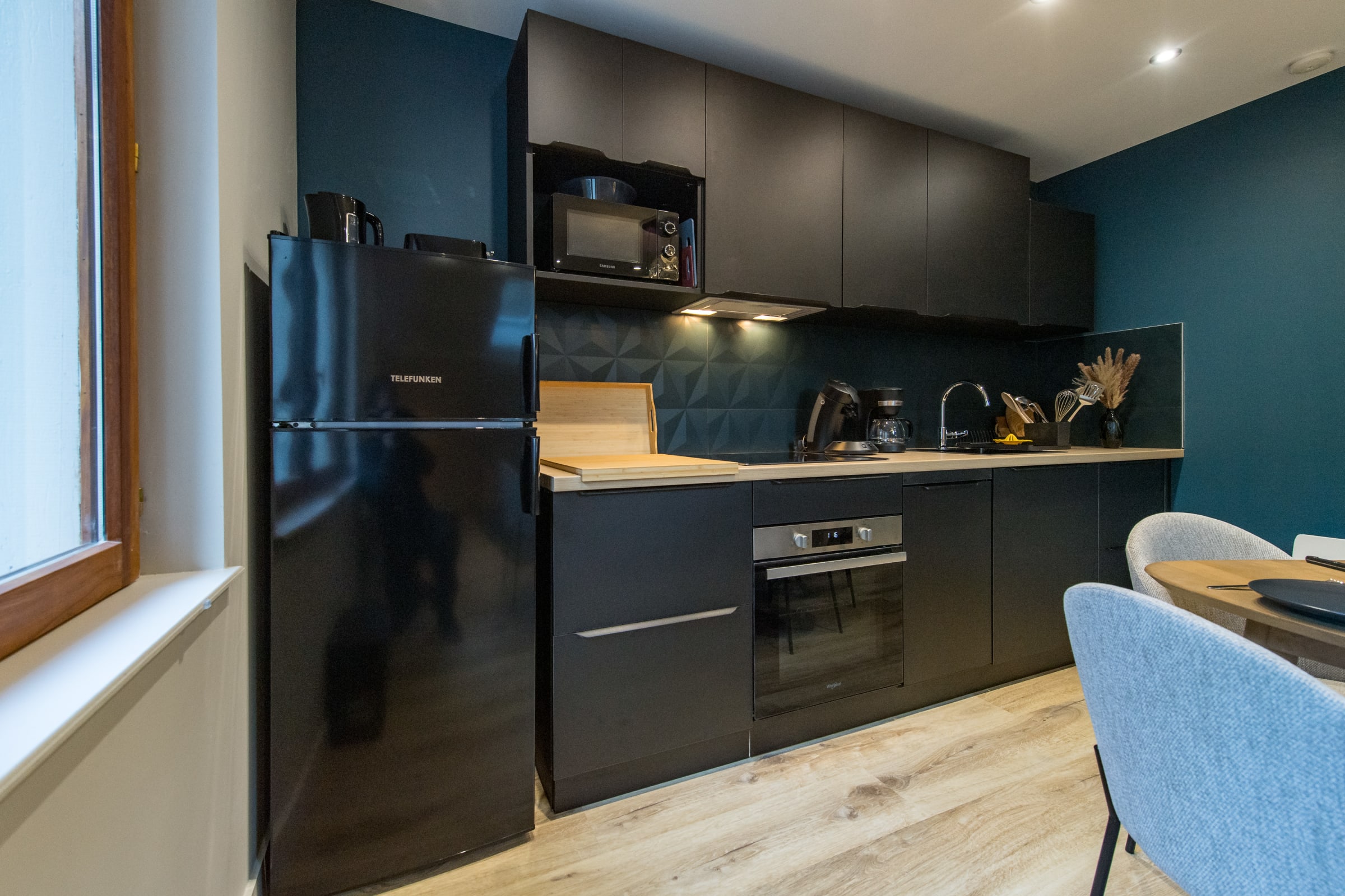 The living room includes a comfortable queen-size sofa bed (160 x 200 cm), perfect after a day on the slopes or riding through the mountains. The open-plan kitchen is fully equipped: fridge, oven, microwave, dishwasher, filter and pod coffee machines, raclette set, kettle, and toaster. A Smart TV is available for watching the news or streaming content.