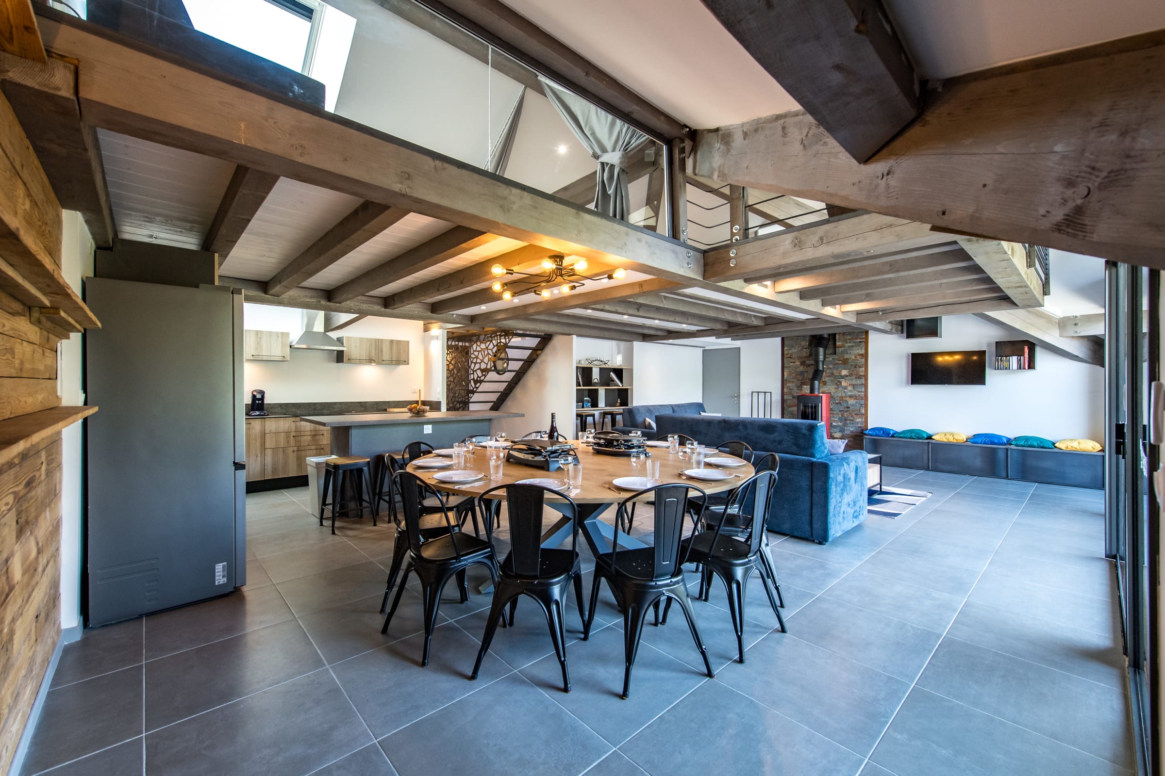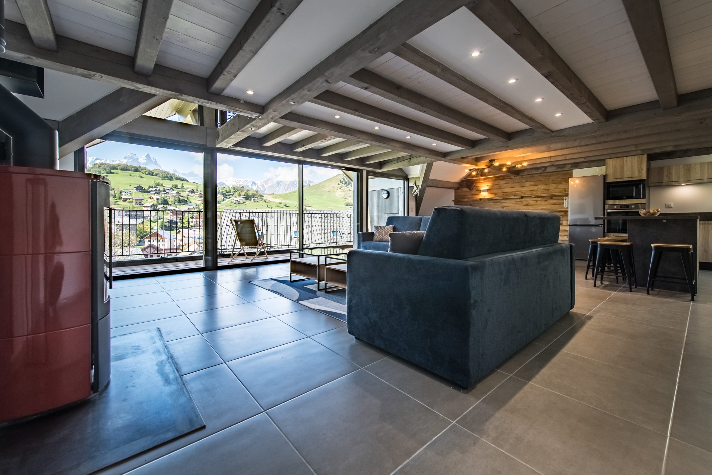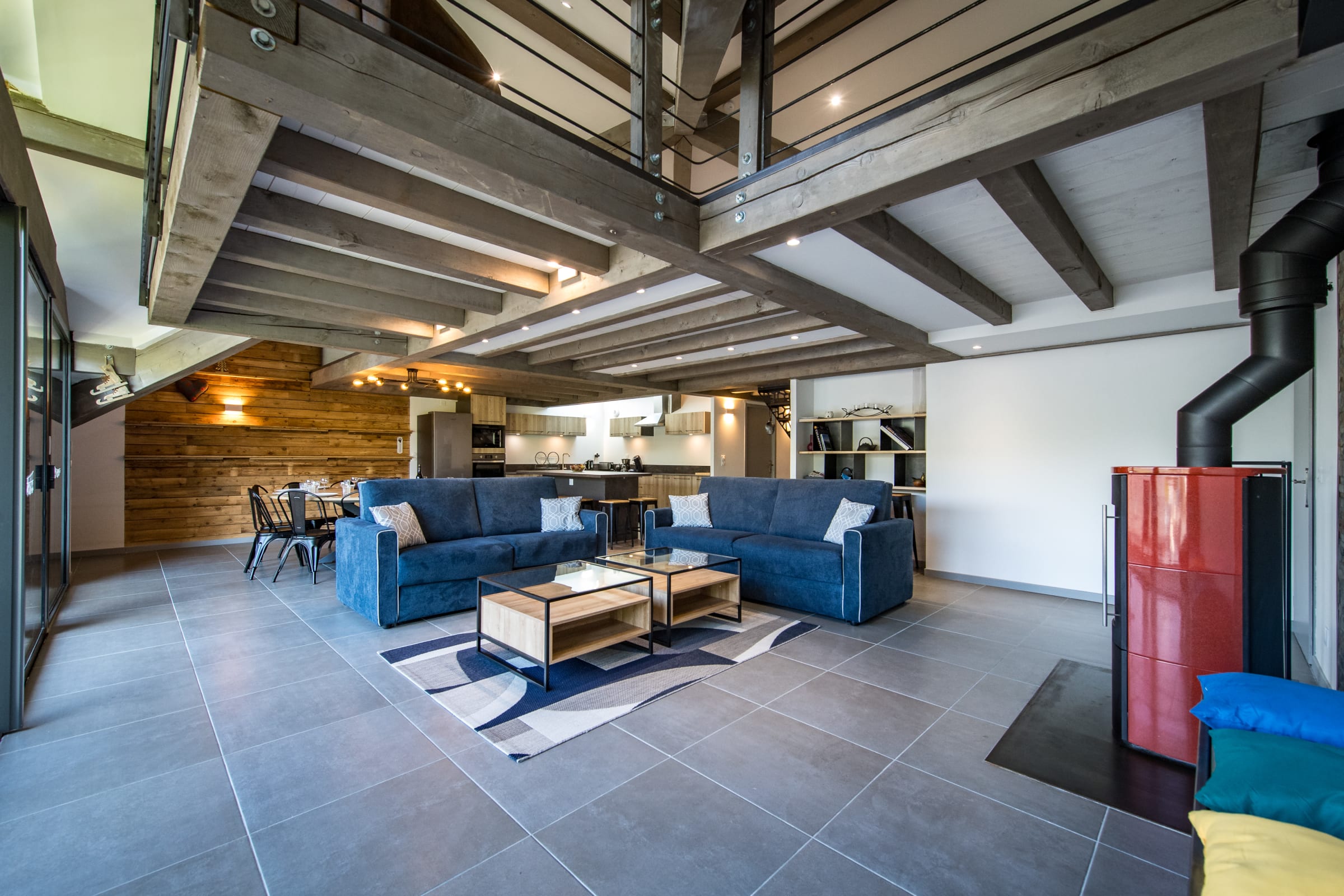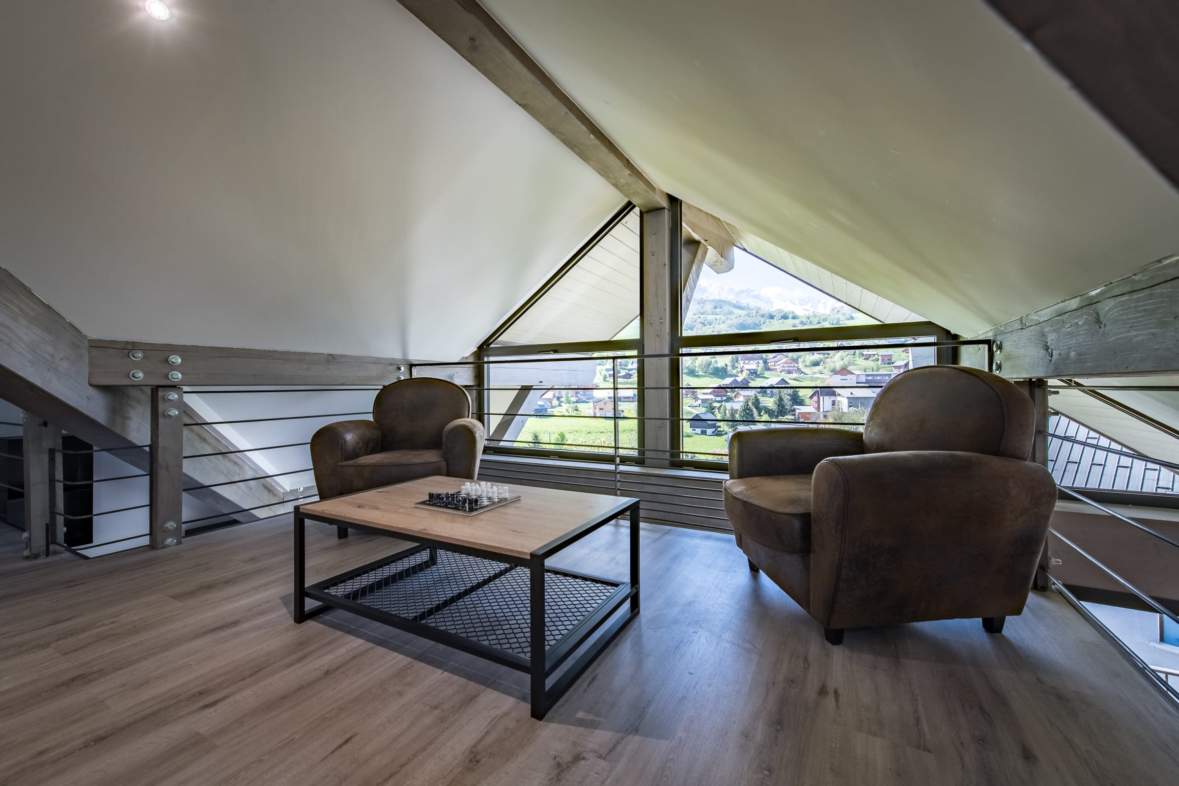 The bright living room opens onto an 11 m² balcony offering stunning mountain views. It is equipped with a TV and dining area. The open-plan kitchen is fully equipped with an oven, microwave, and coffee machine. Upstairs, a large mezzanine with armchairs provides the perfect spot to relax after a day outdoors.
