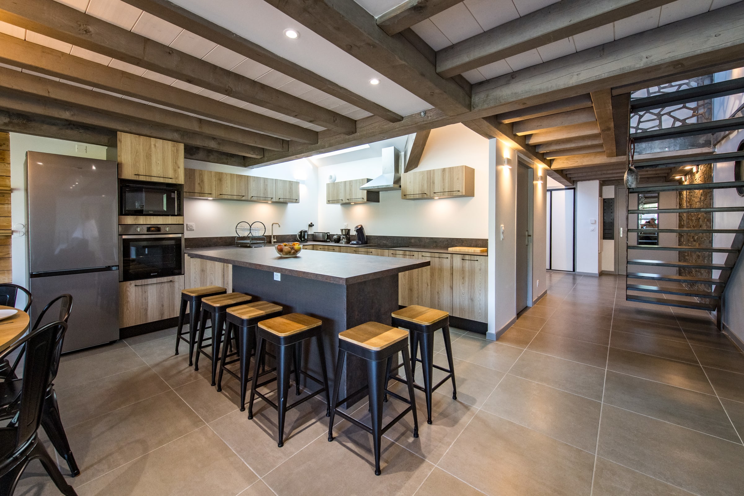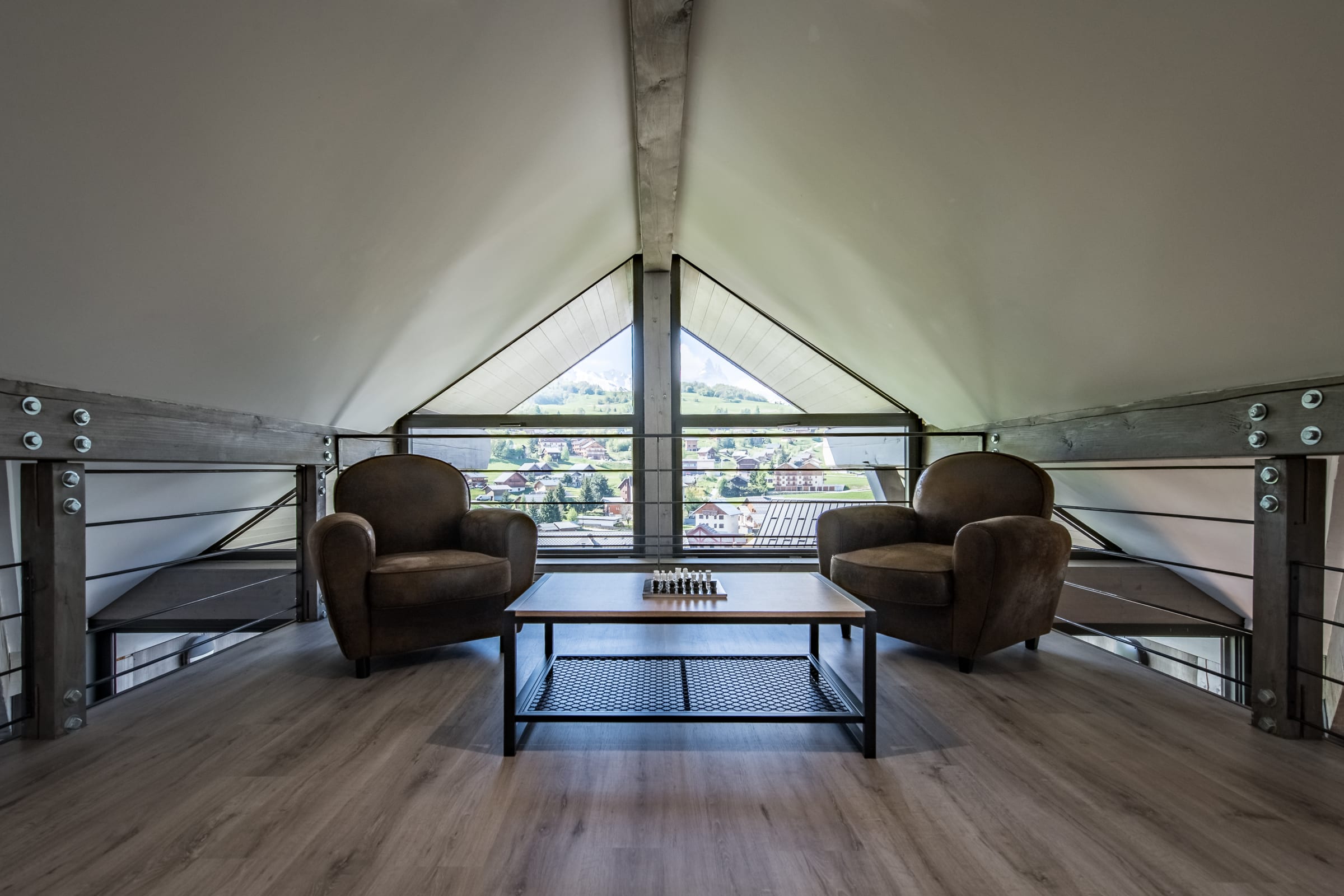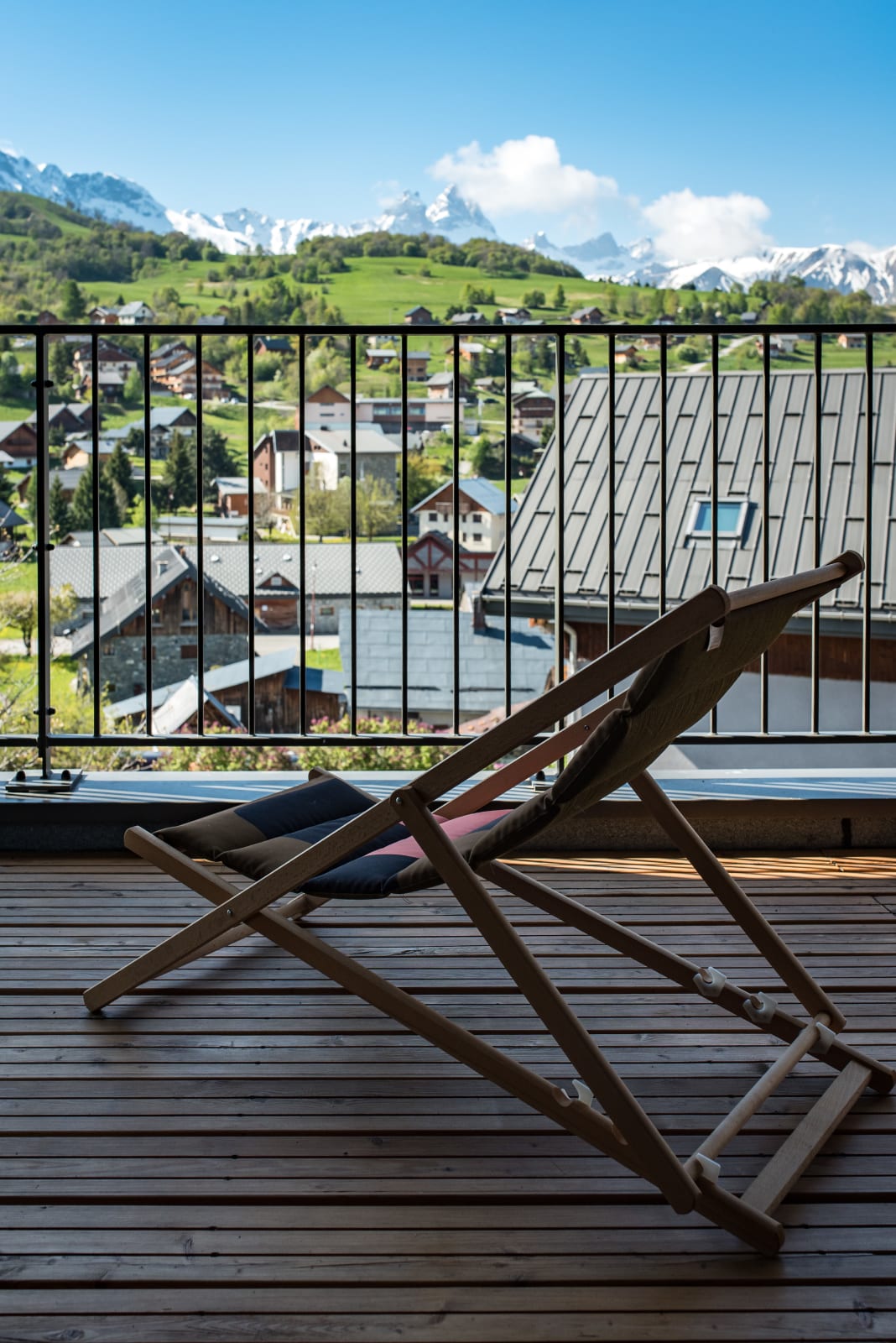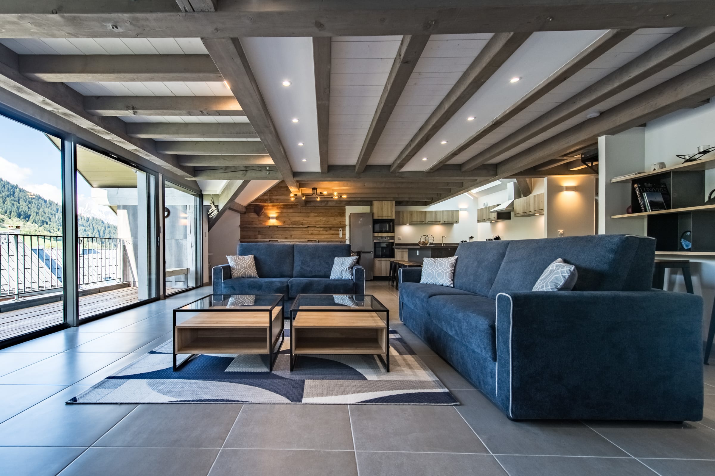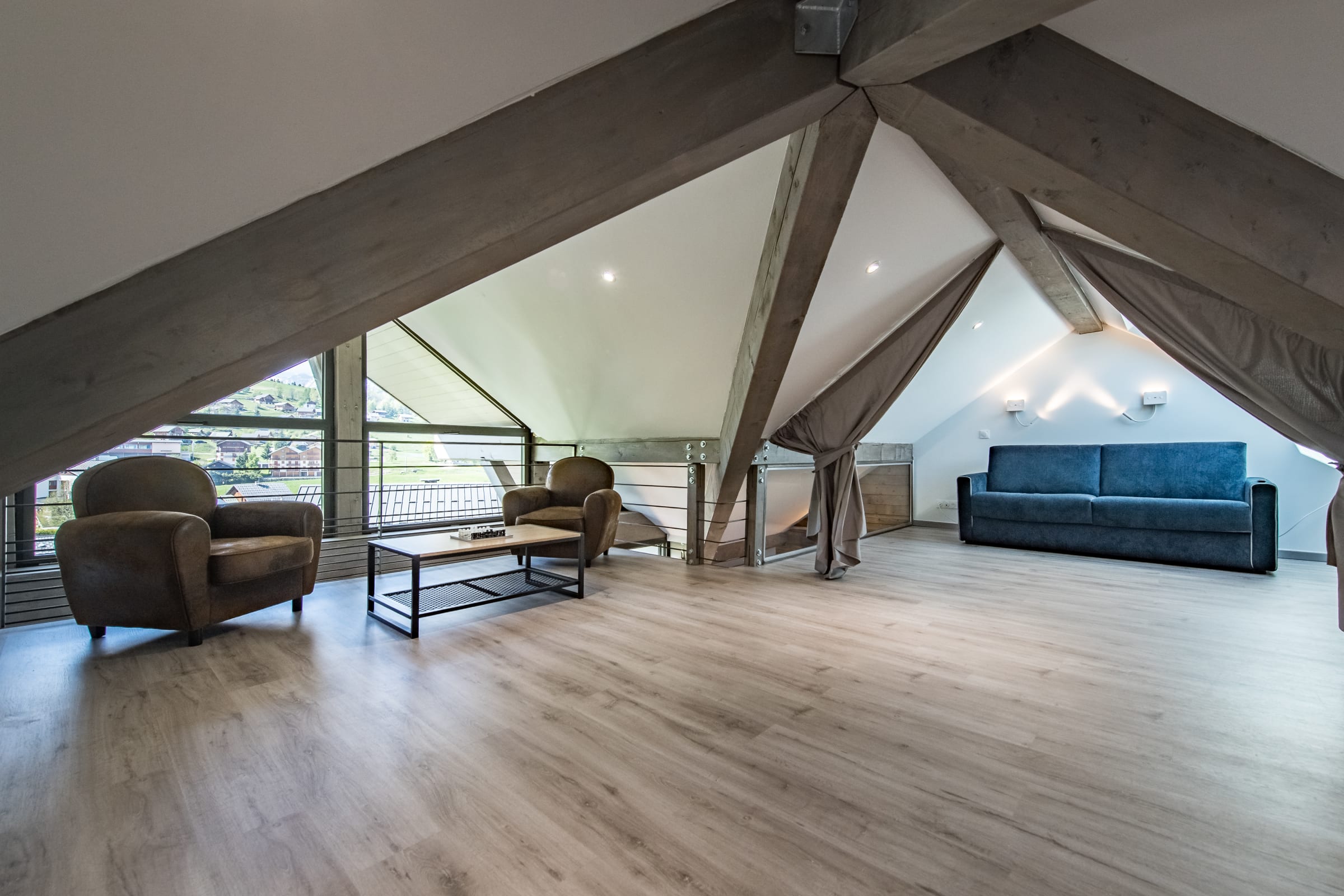 The bright living room opens onto an 11 m² balcony offering stunning mountain views. It is equipped with a TV and dining area. The open-plan kitchen is fully equipped with an oven, microwave, and coffee machine. Upstairs, a large mezzanine with armchairs provides the perfect spot to relax after a day outdoors.