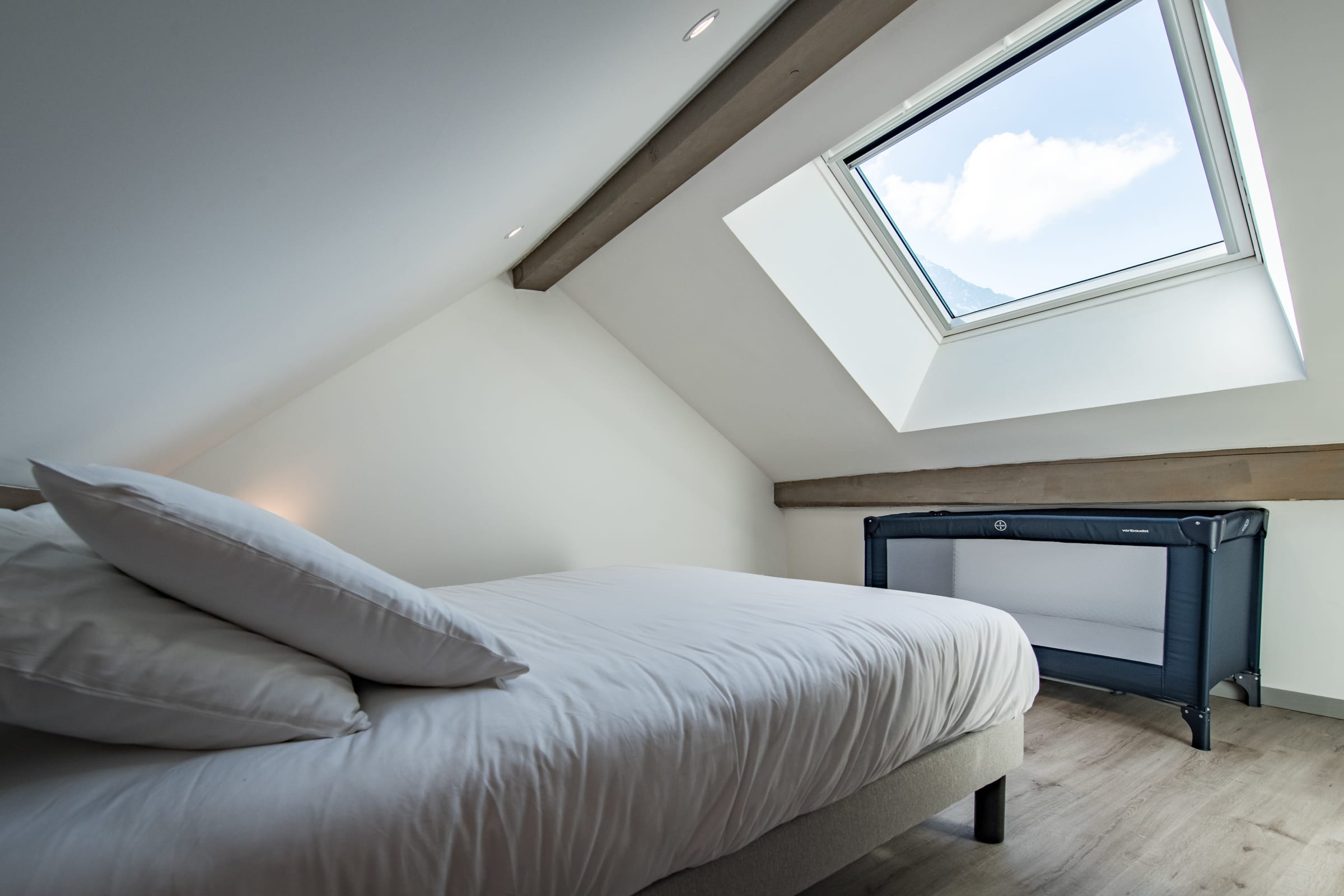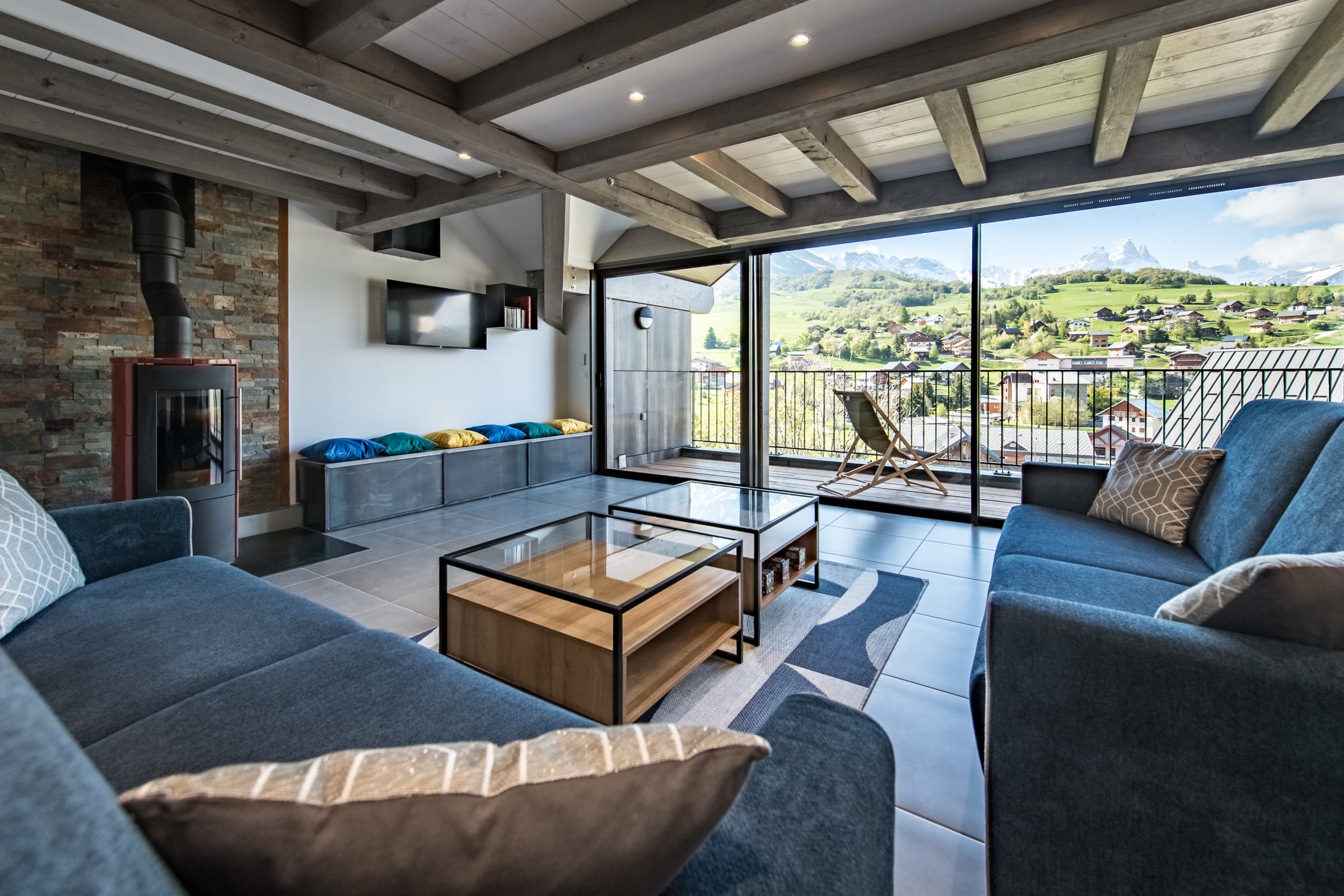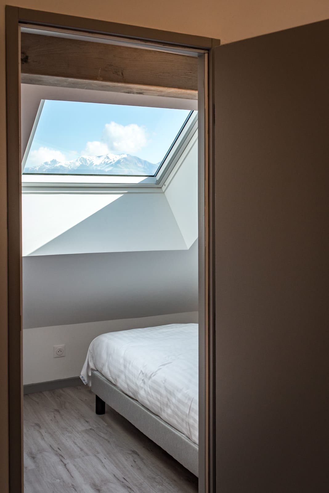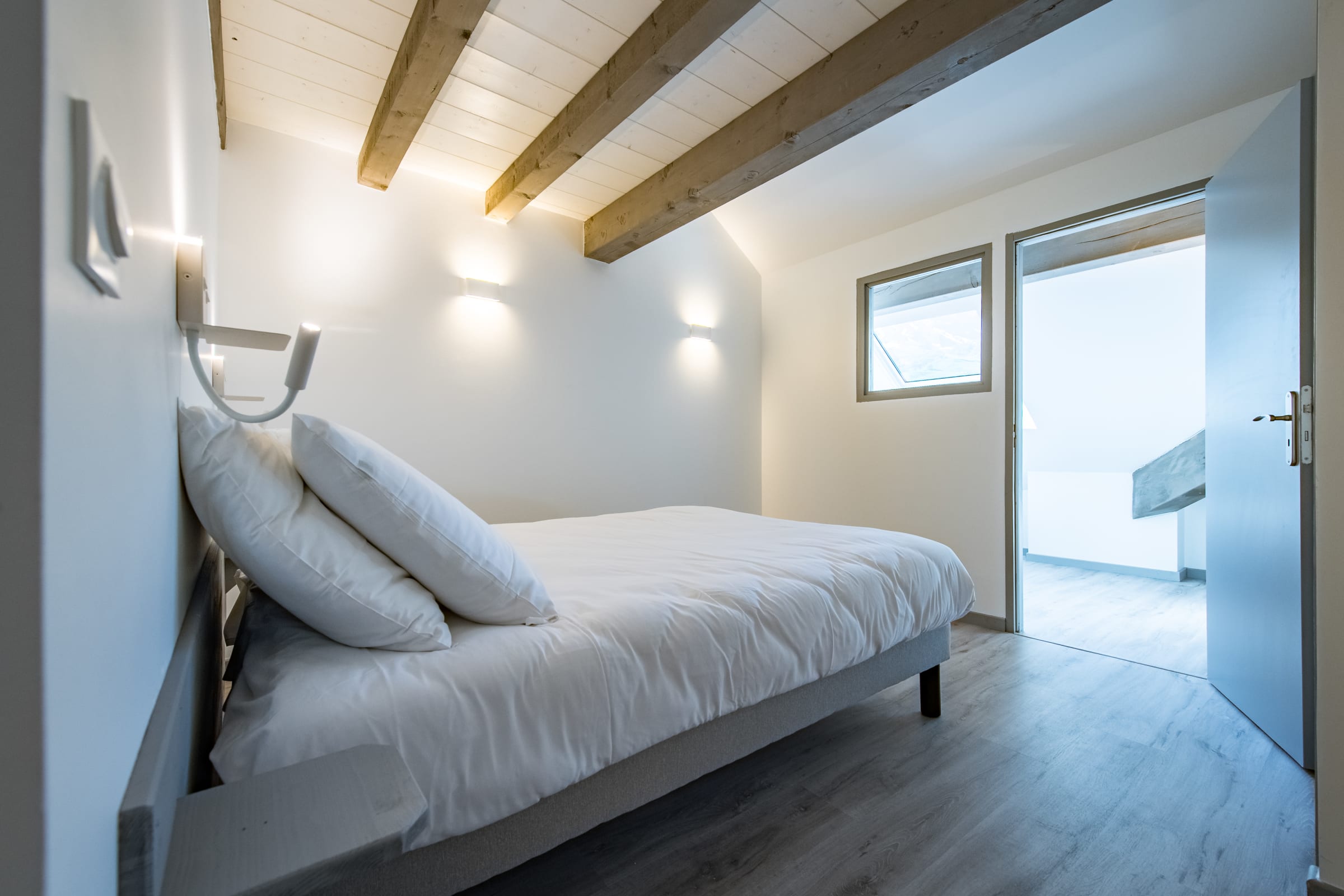 The bright living room opens onto an 11 m² balcony offering stunning mountain views. It is equipped with a TV and dining area. The open-plan kitchen is fully equipped with an oven, microwave, and coffee machine. Upstairs, a large mezzanine with armchairs provides the perfect spot to relax after a day outdoors.