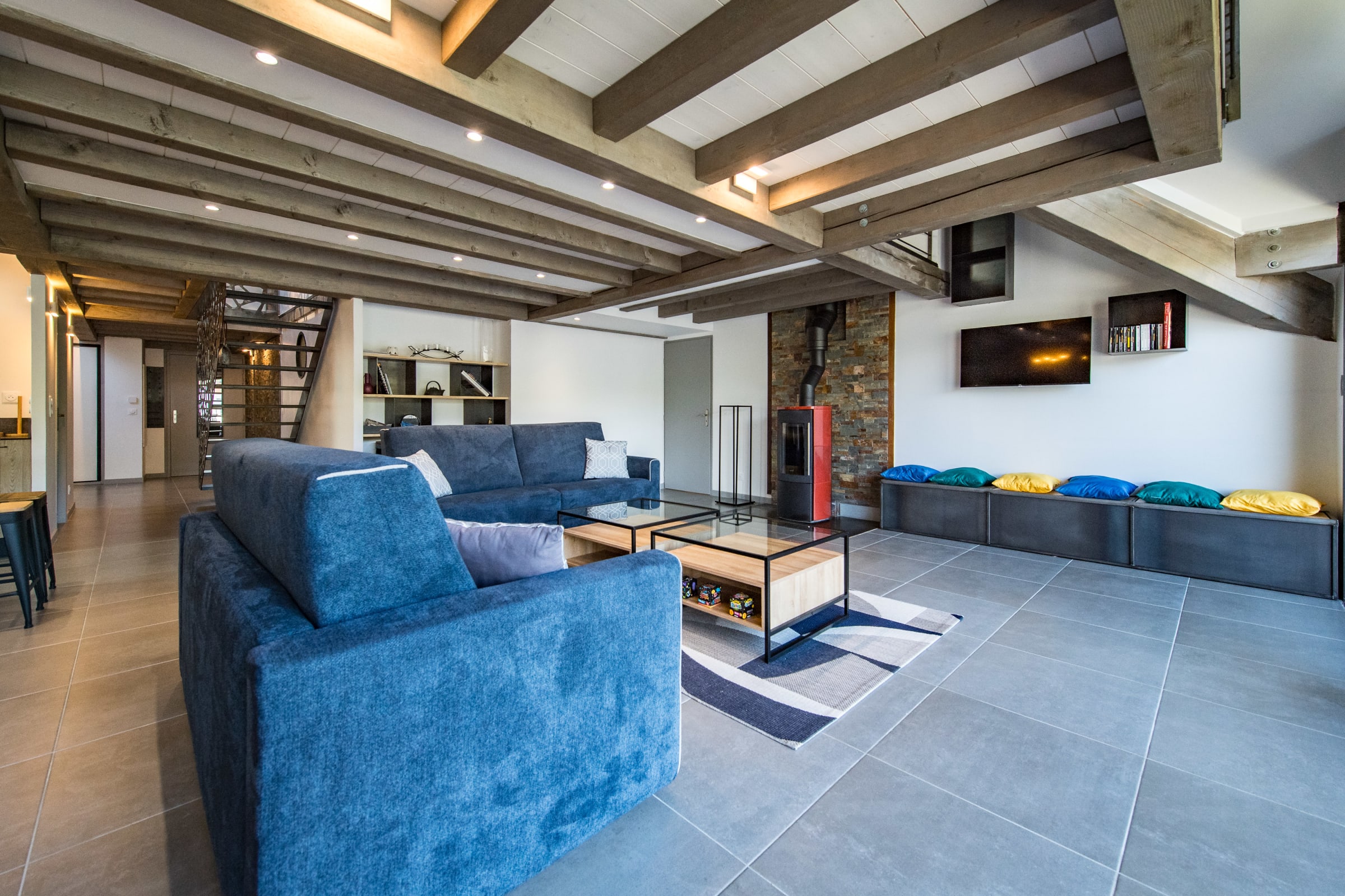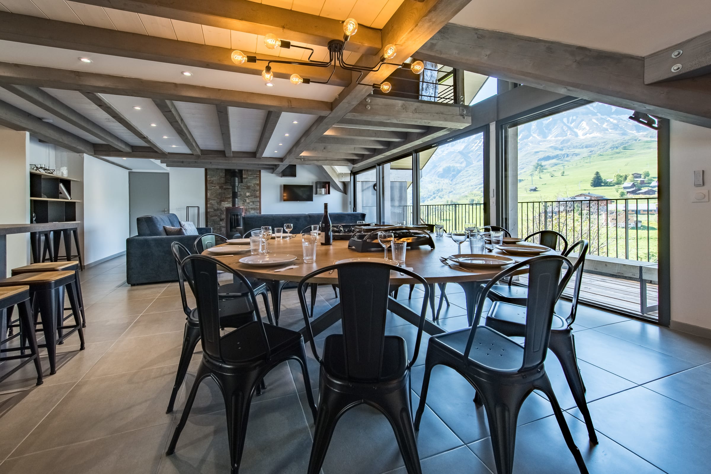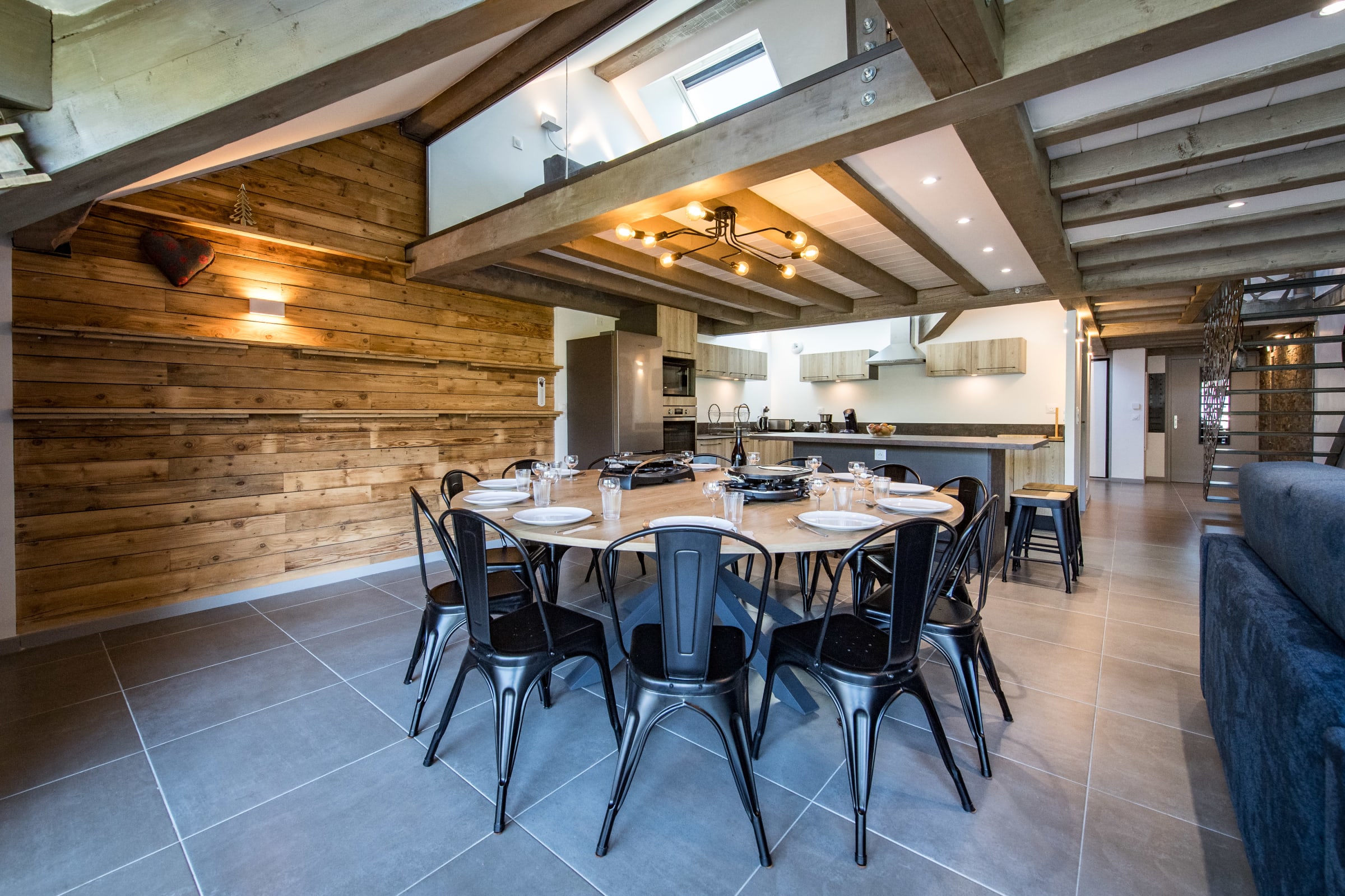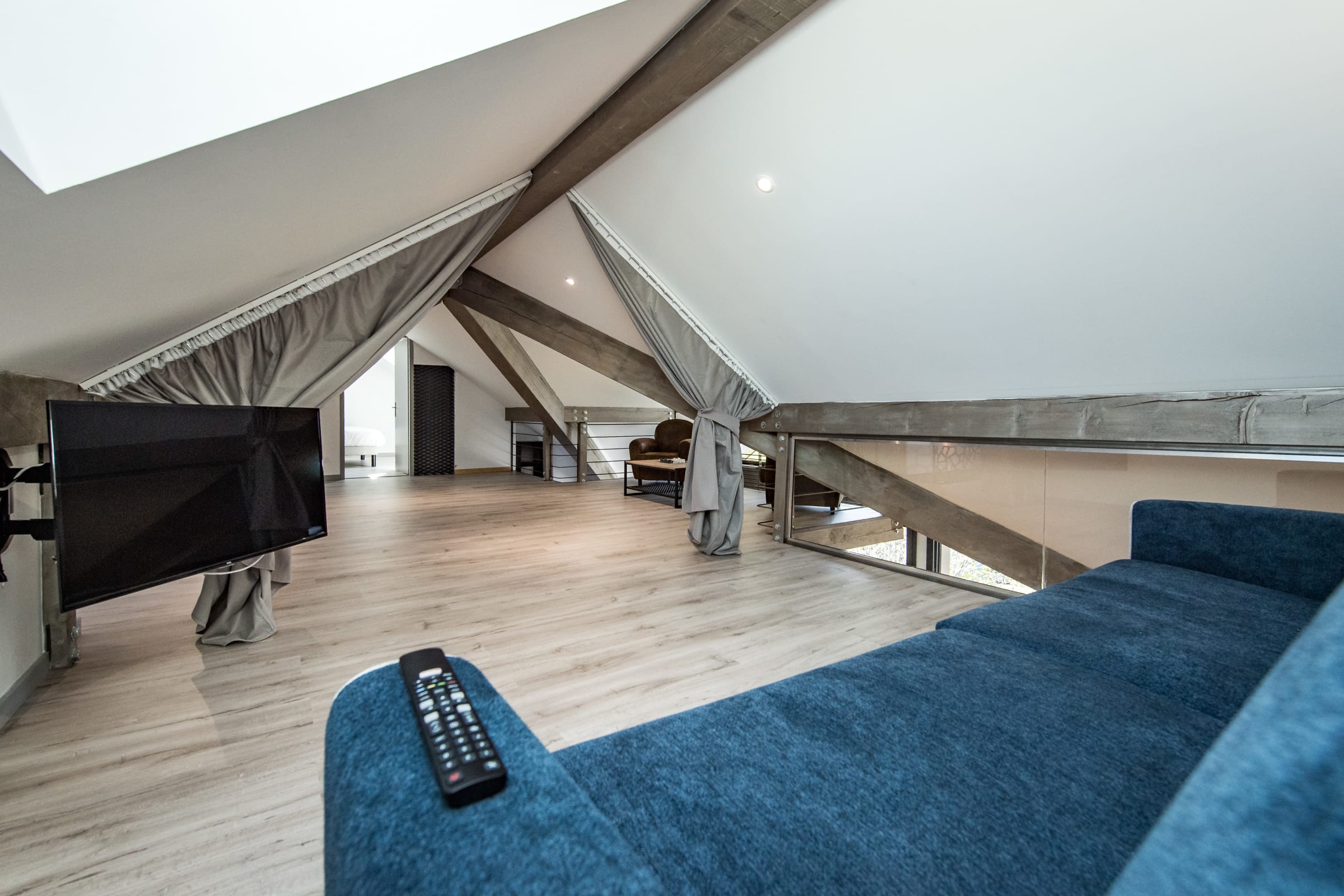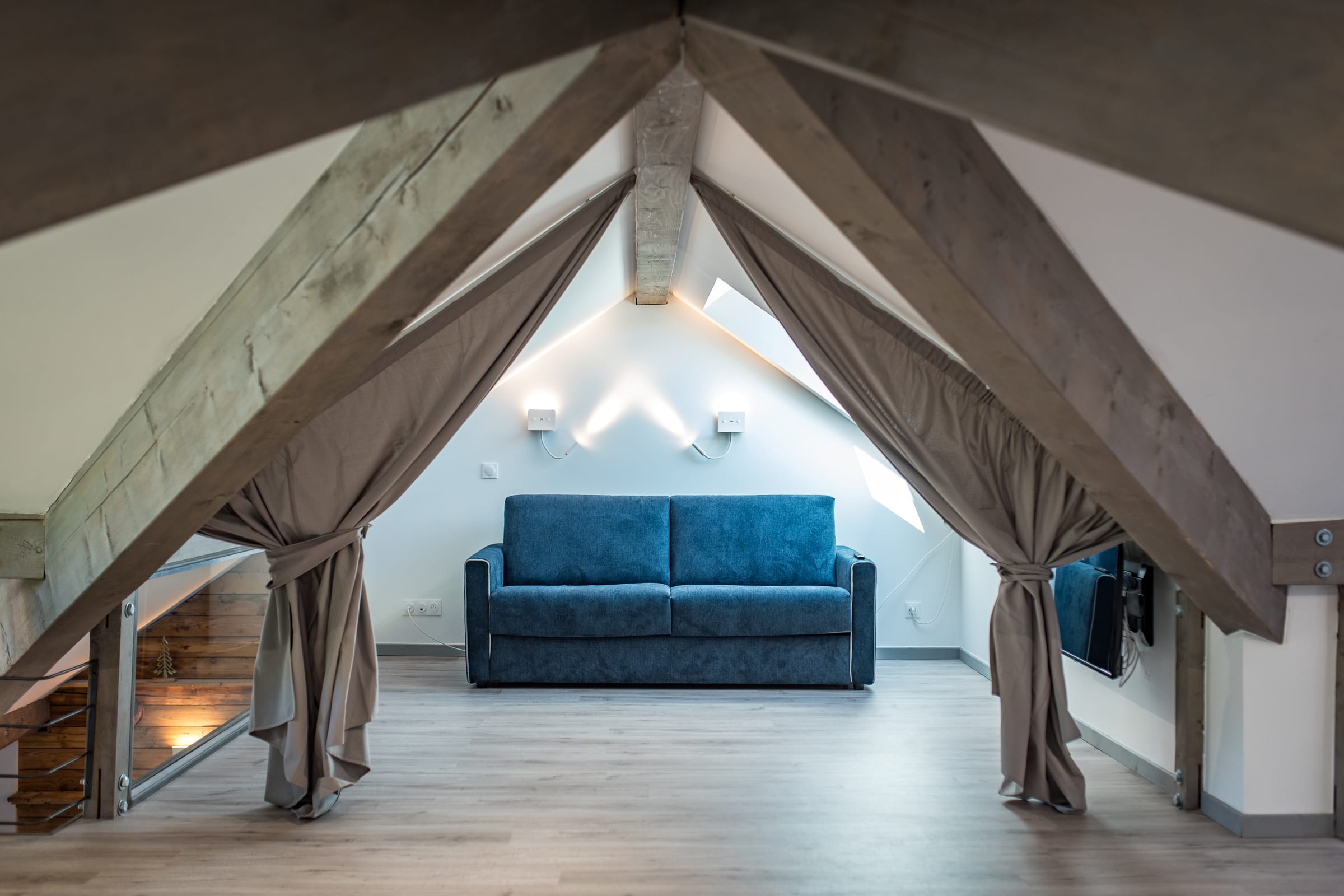 The bright living room opens onto an 11 m² balcony offering stunning mountain views. It is equipped with a TV and dining area. The open-plan kitchen is fully equipped with an oven, microwave, and coffee machine. Upstairs, a large mezzanine with armchairs provides the perfect spot to relax after a day outdoors.