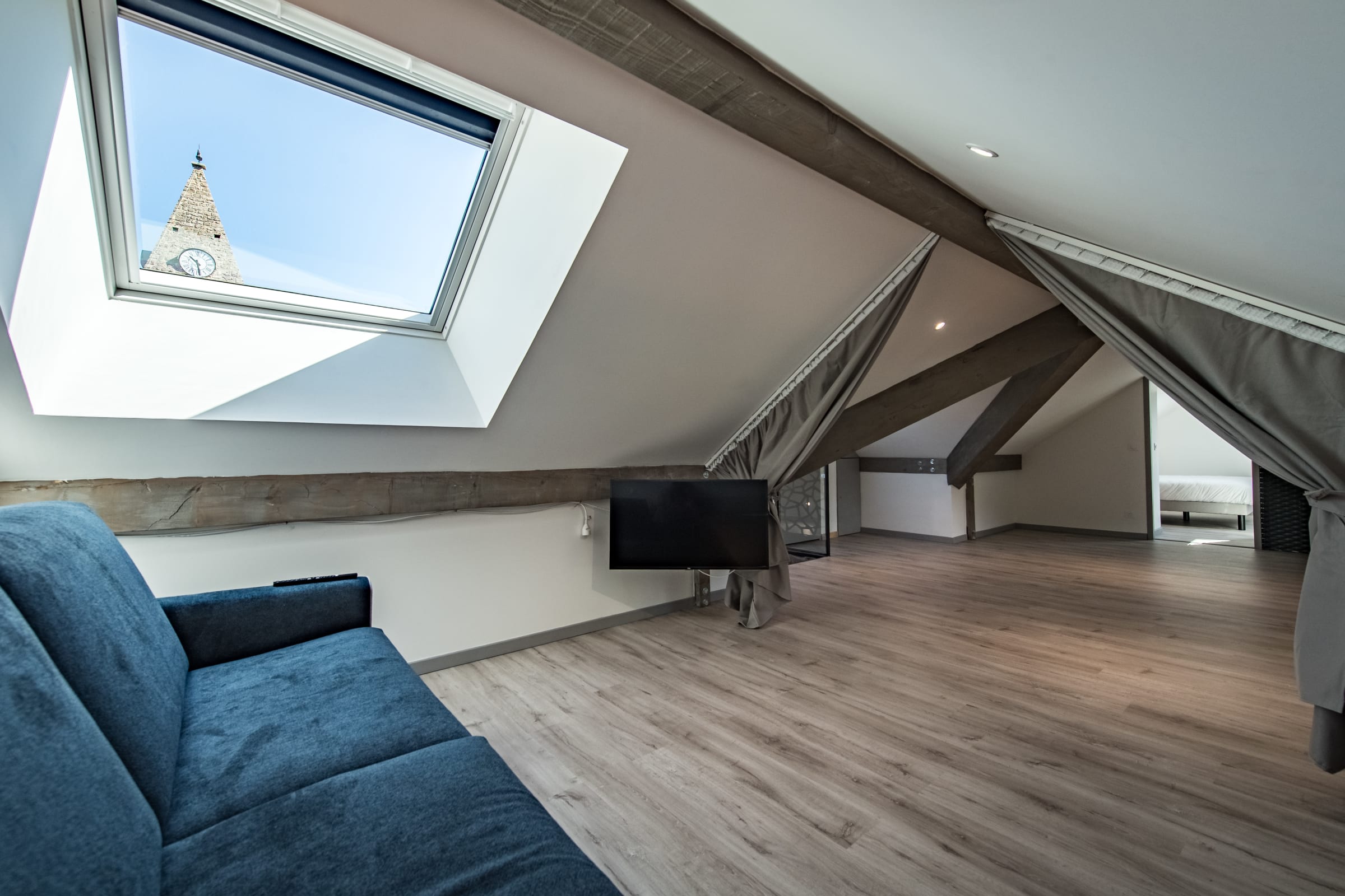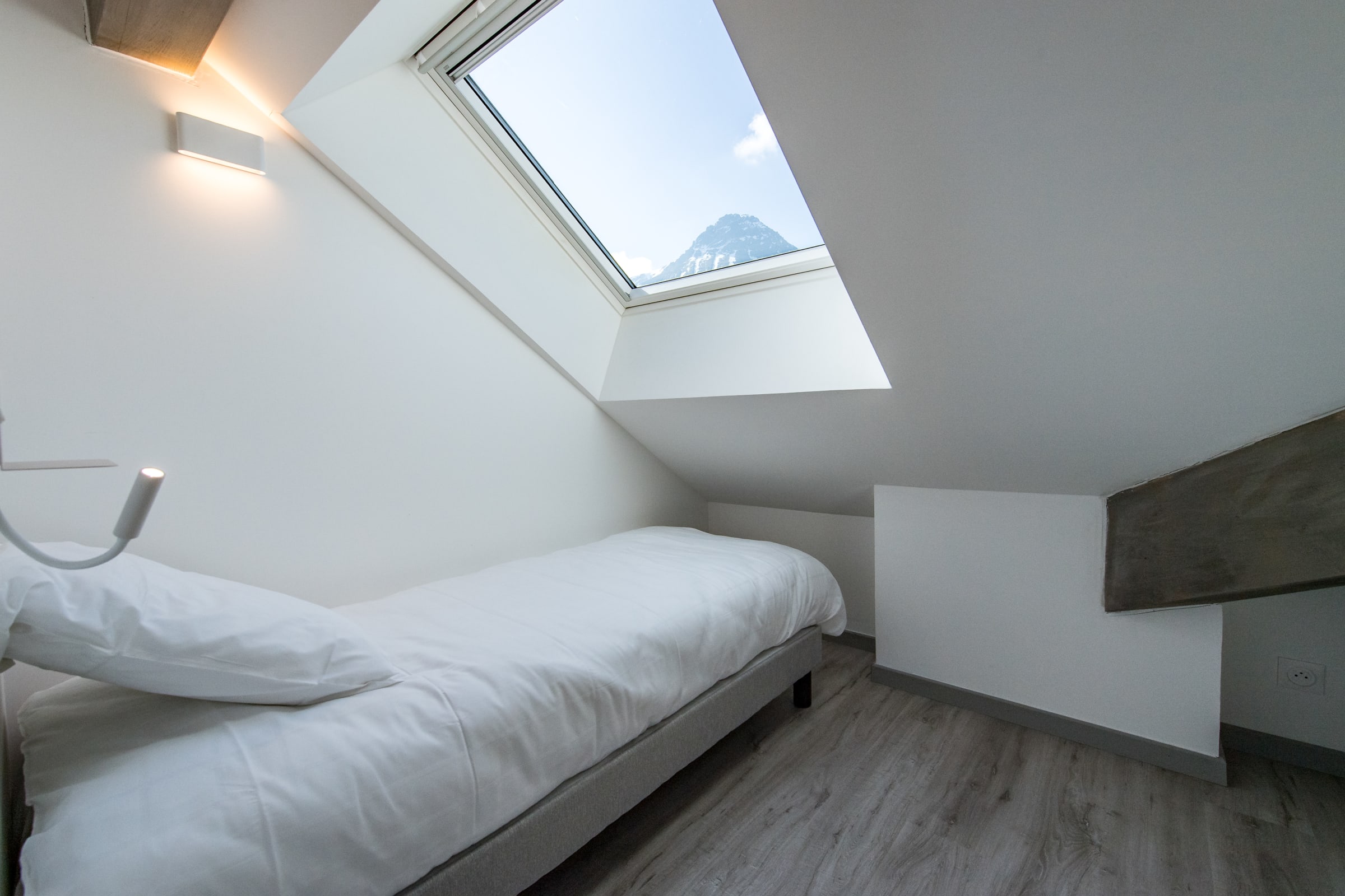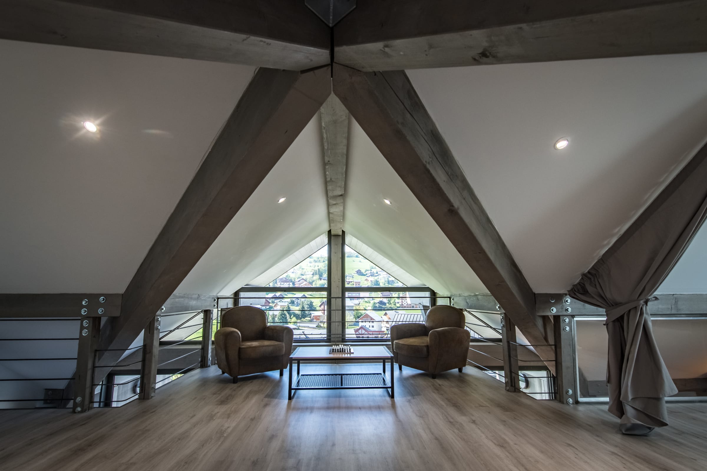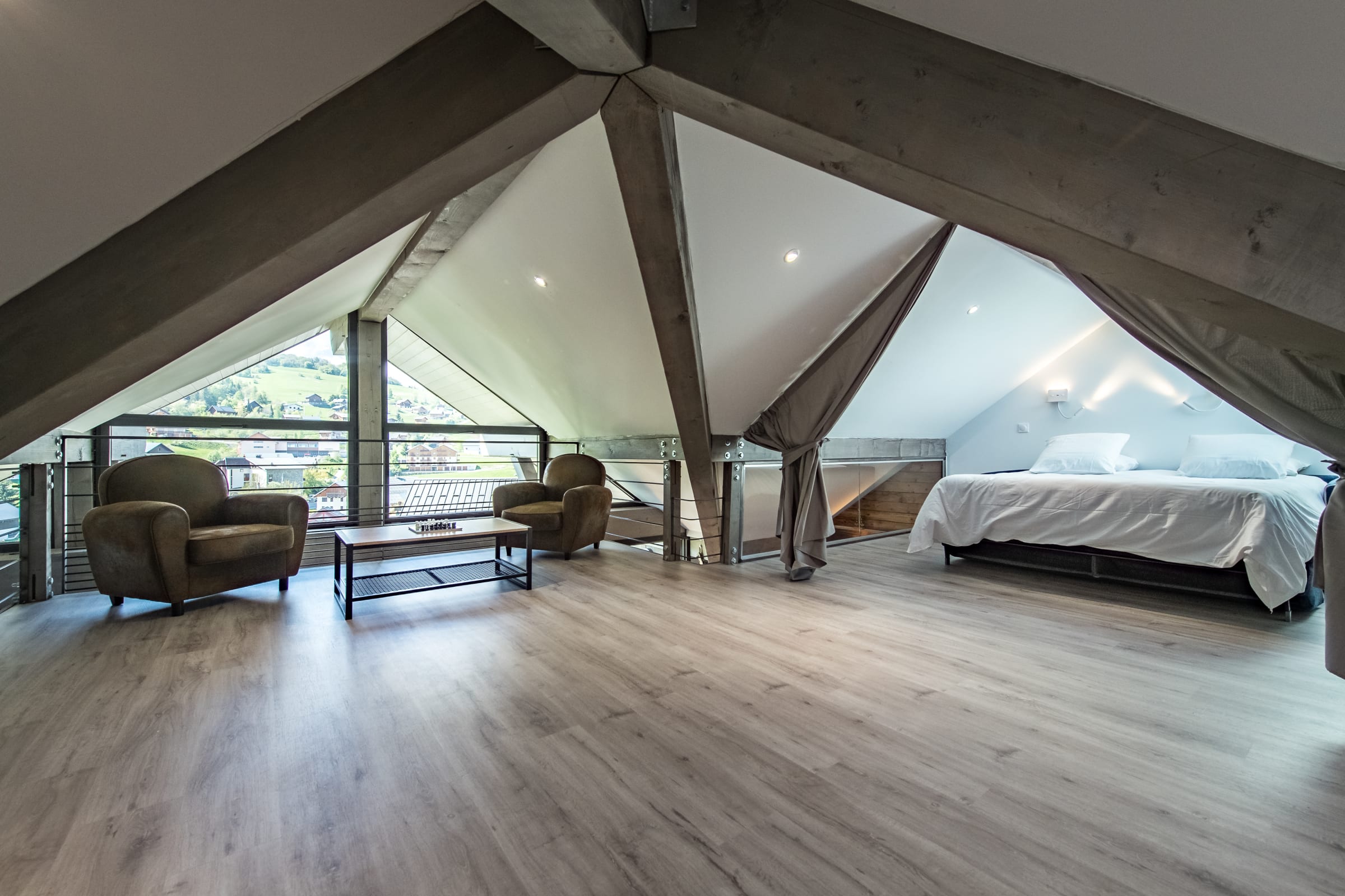 The bright living room opens onto an 11 m² balcony offering stunning mountain views. It is equipped with a TV and dining area. The open-plan kitchen is fully equipped with an oven, microwave, and coffee machine. Upstairs, a large mezzanine with armchairs provides the perfect spot to relax after a day outdoors.