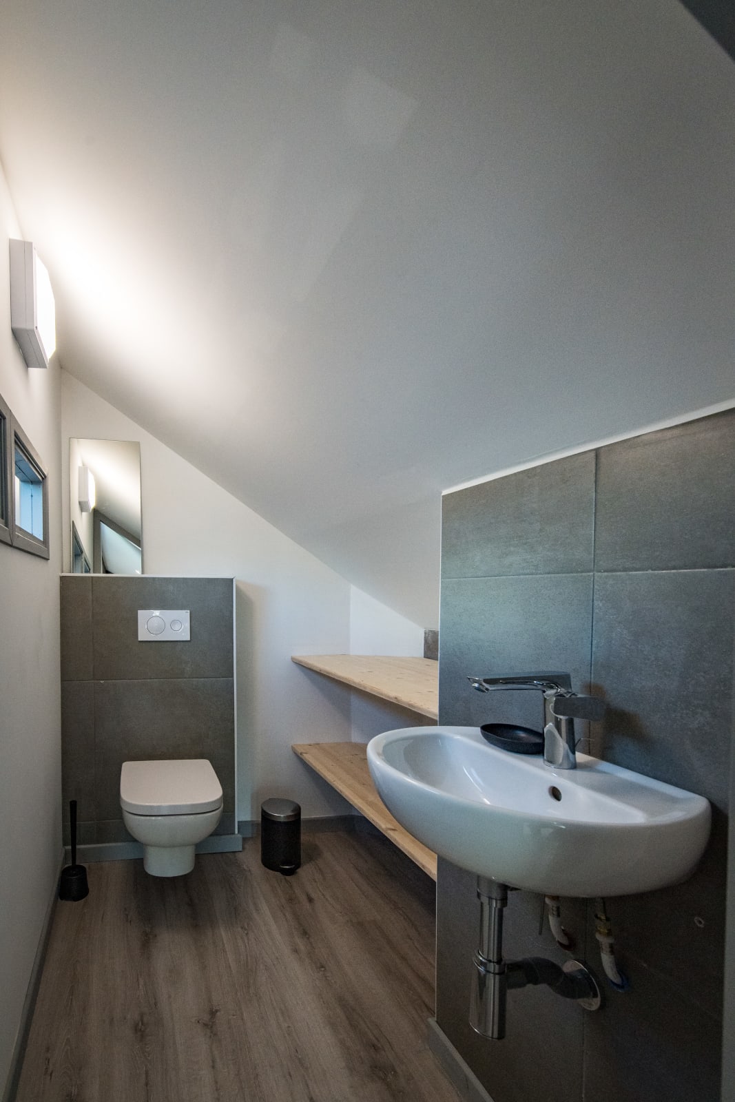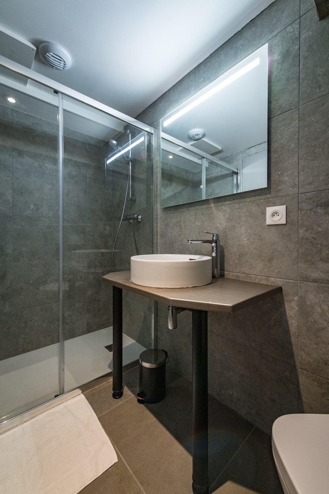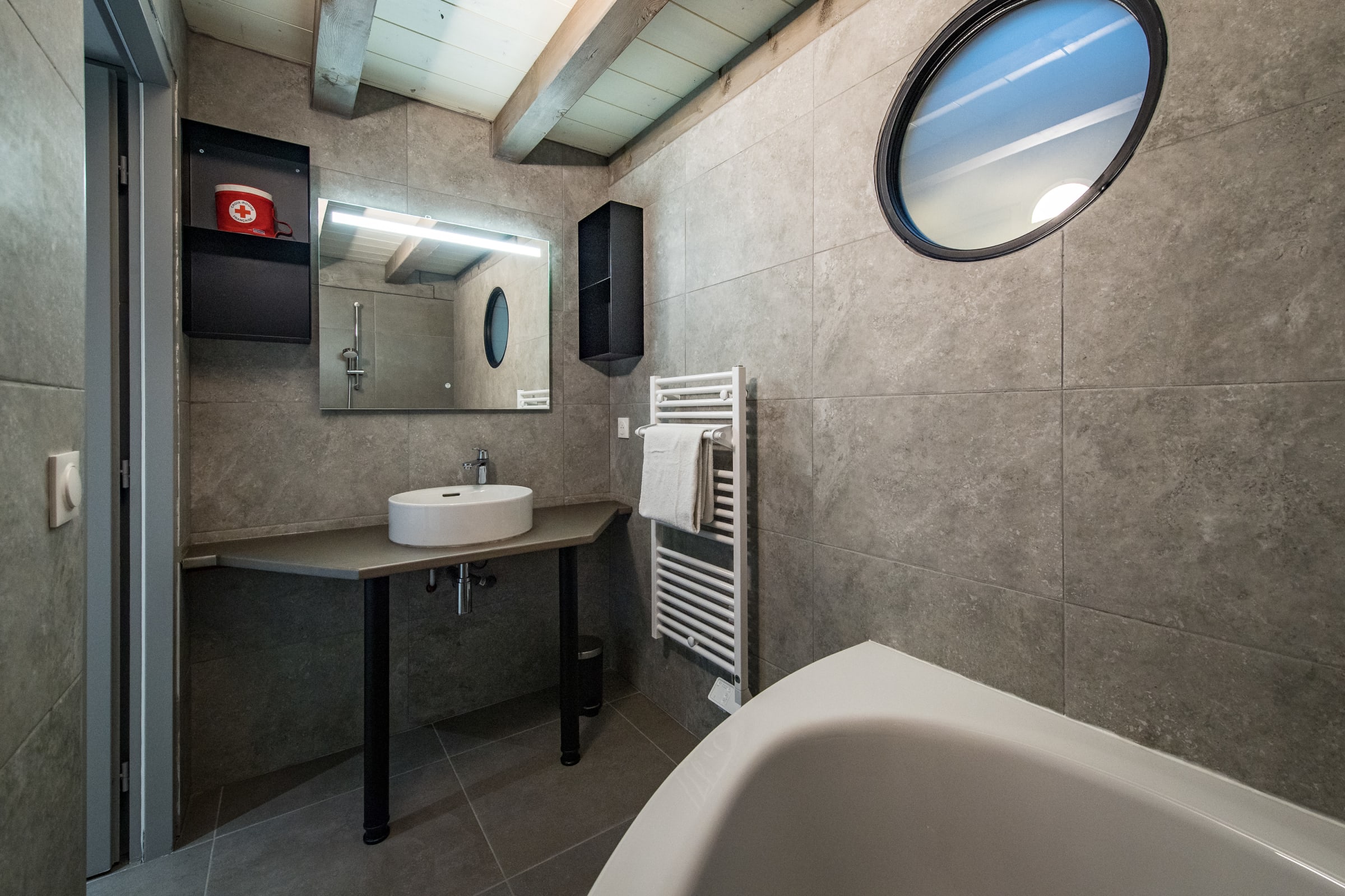 There are 2 modern bathrooms: one with a shower and the other with a bathtub.
