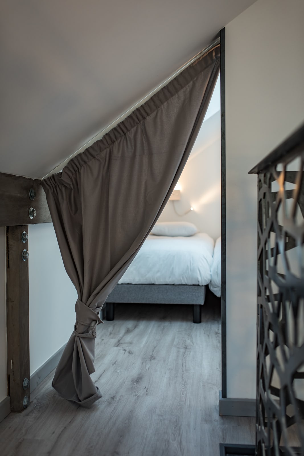 Upstairs: 1 bedroom with a queen-size bed (160 x 200 cm), and a curtained-off area with 2 single beds (80 x 180 cm).