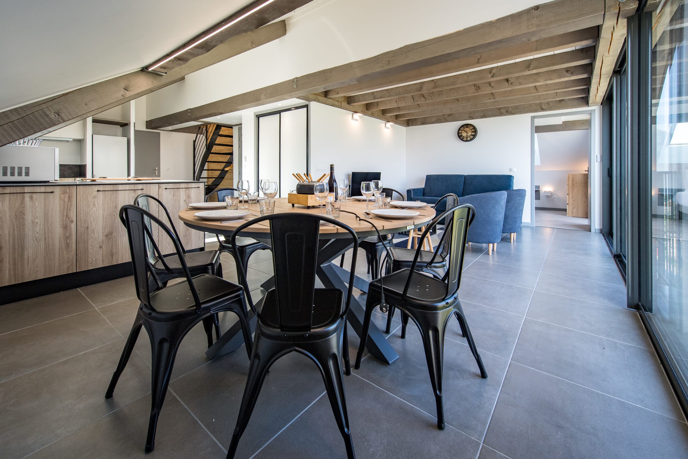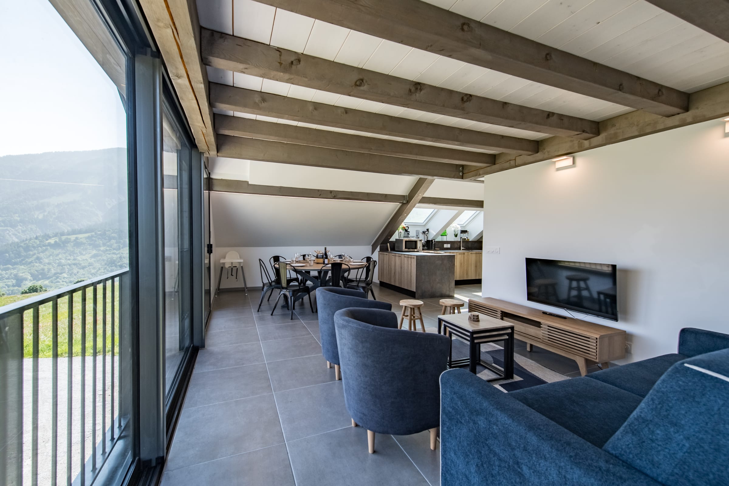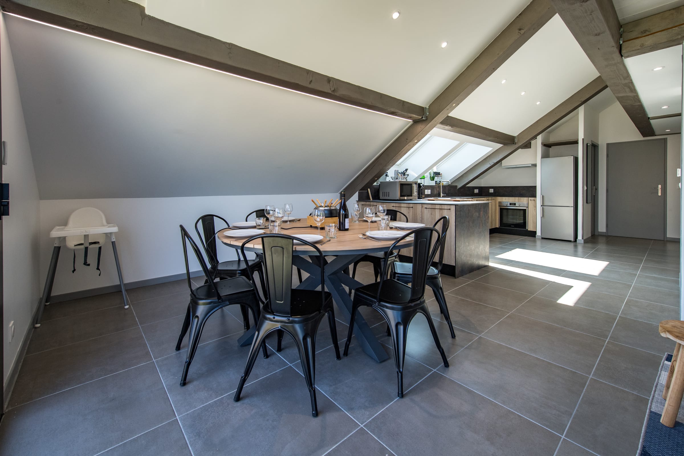 The large, bright living area features a cozy lounge with a TV, a welcoming dining space, and a fully equipped open kitchen (oven, coffee machine, etc.) to prepare delicious meals after a day on the slopes. The sofa is convertible.