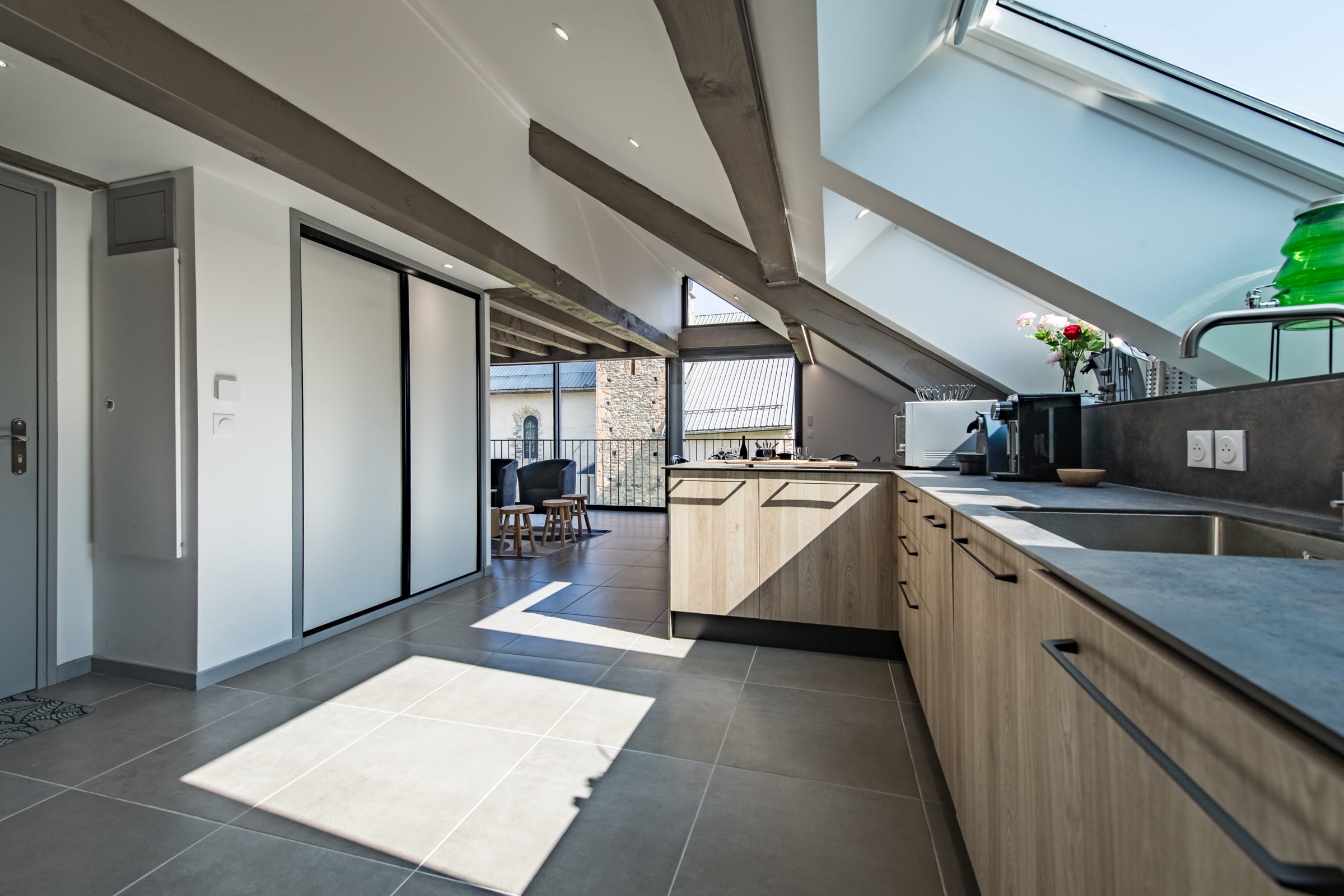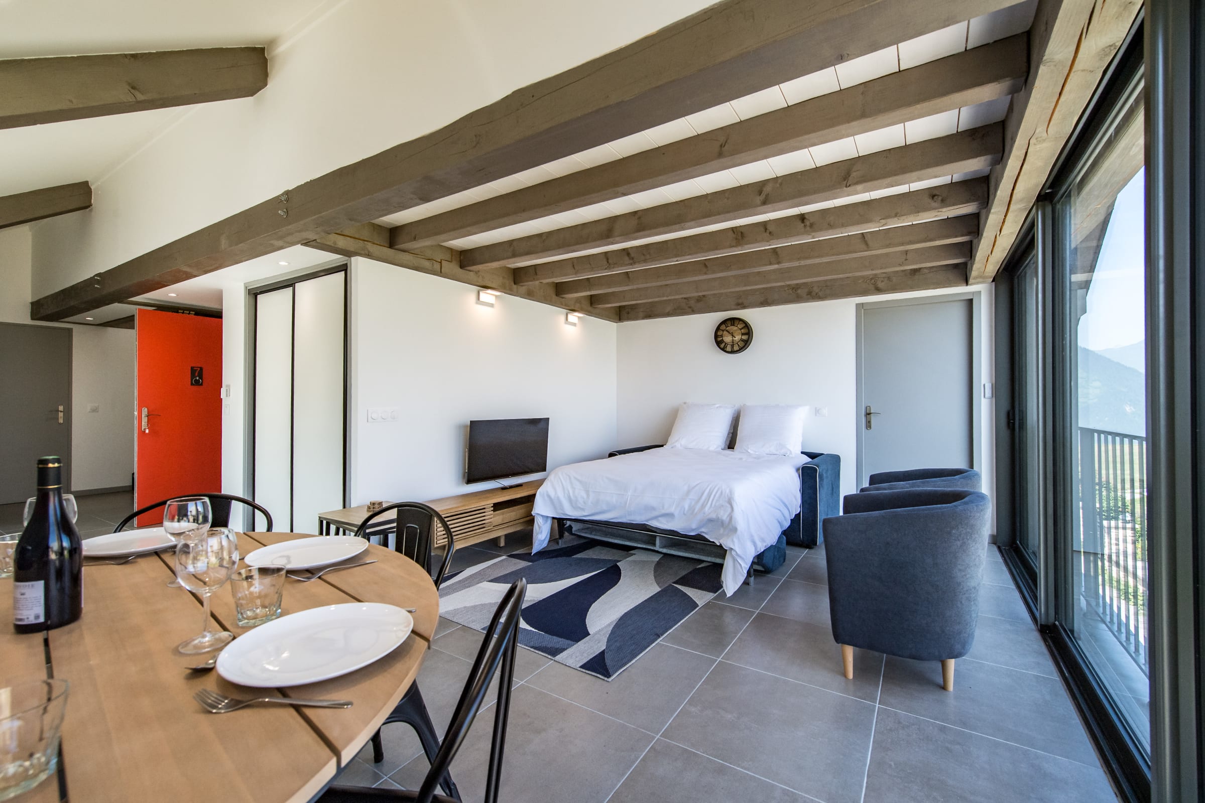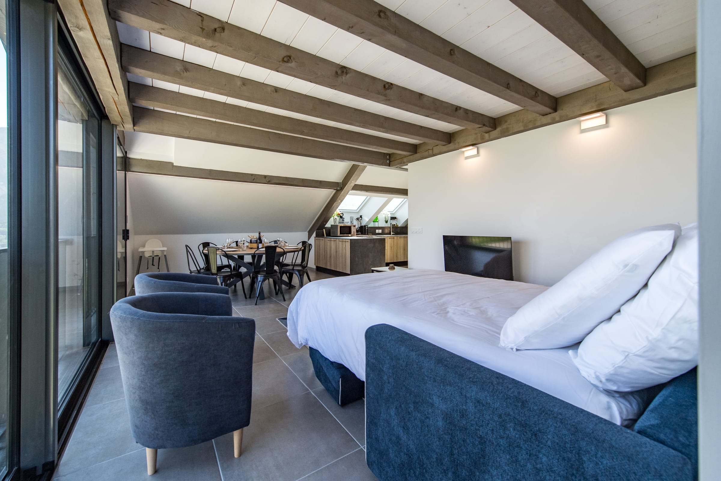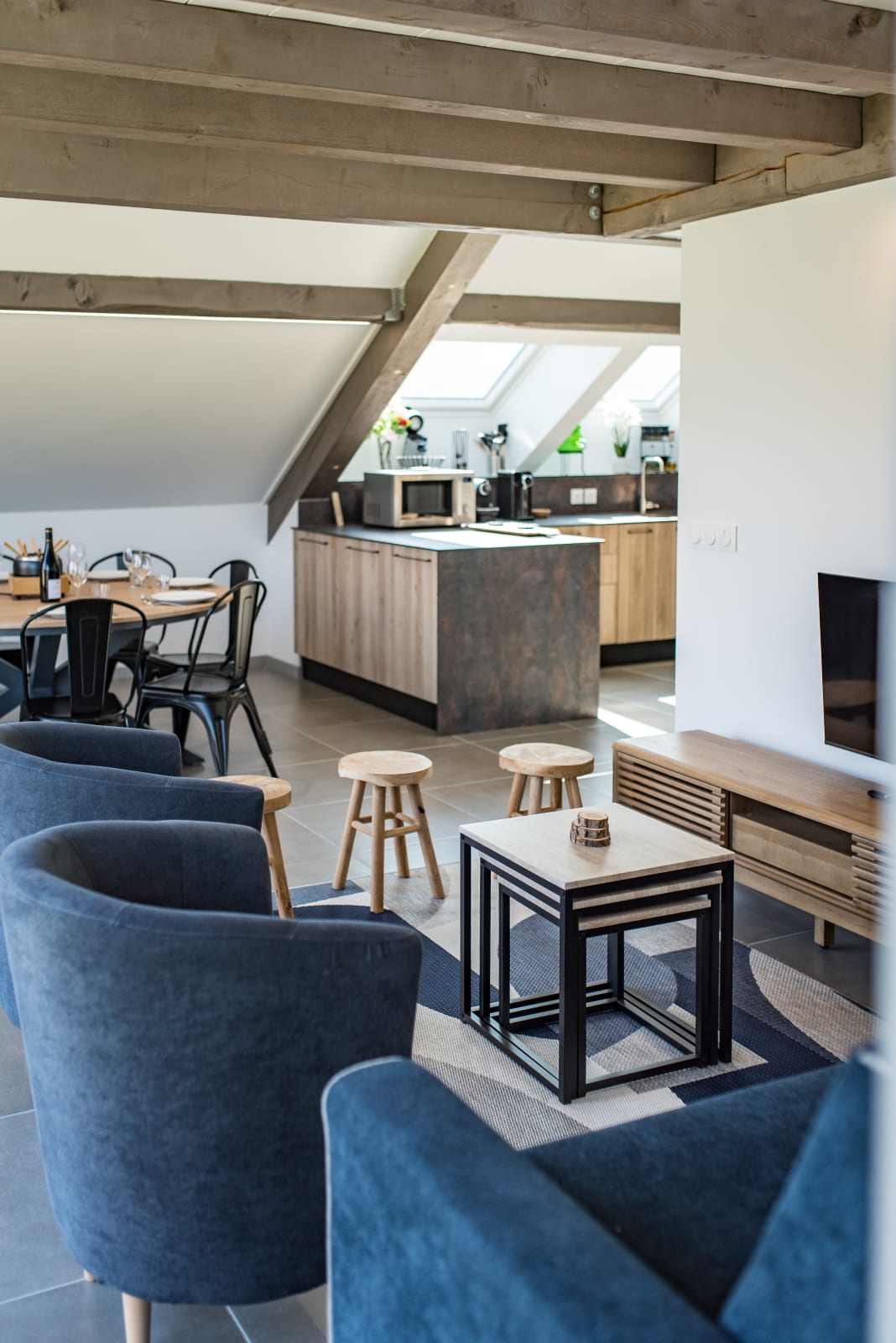 The large, bright living area features a cozy lounge with a TV, a welcoming dining space, and a fully equipped open kitchen (oven, coffee machine, etc.) to prepare delicious meals after a day on the slopes. The sofa is convertible.