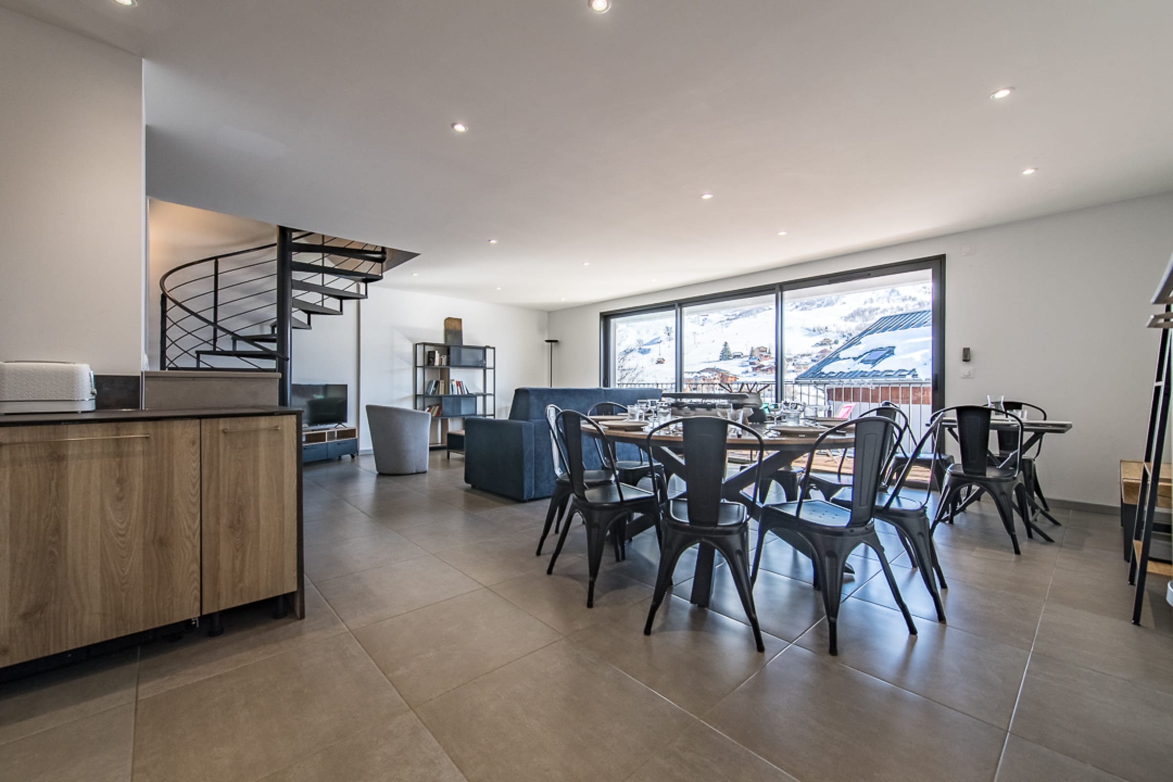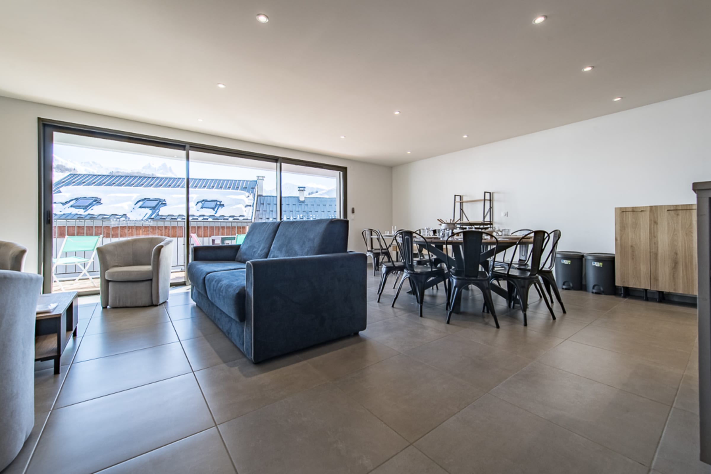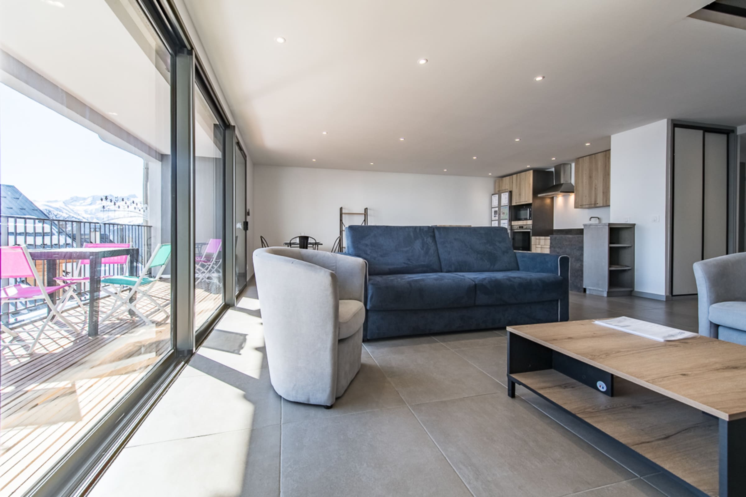 The bright living room opens onto a 12 m² terrace offering a breathtaking view of the ski slopes and the surrounding mountains. It is furnished with a comfortable sofa bed (160 x 200 cm), a television, and a cozy dining area. The open-plan kitchen is fully equipped with an oven, a coffee maker (filter), and everything you need to prepare delicious meals.