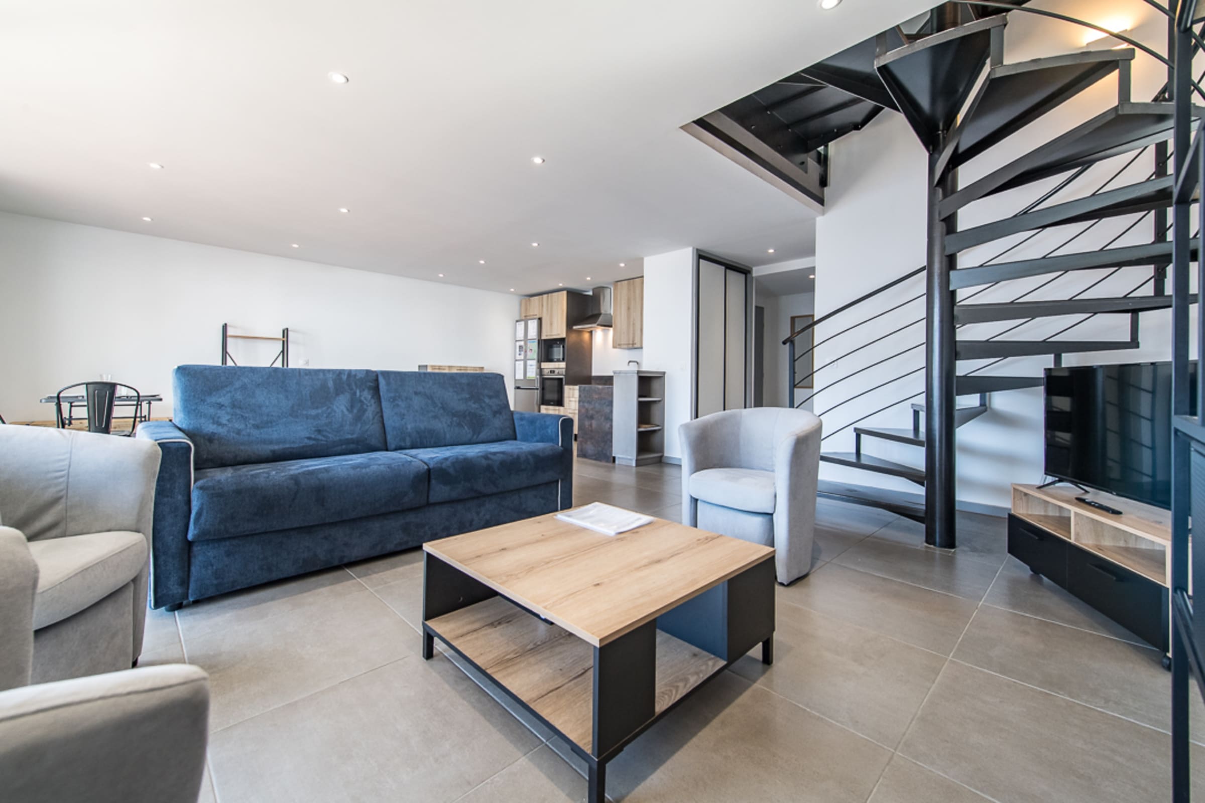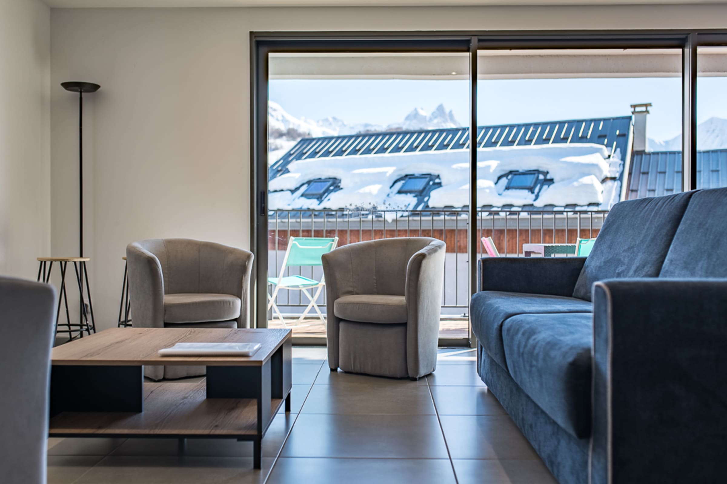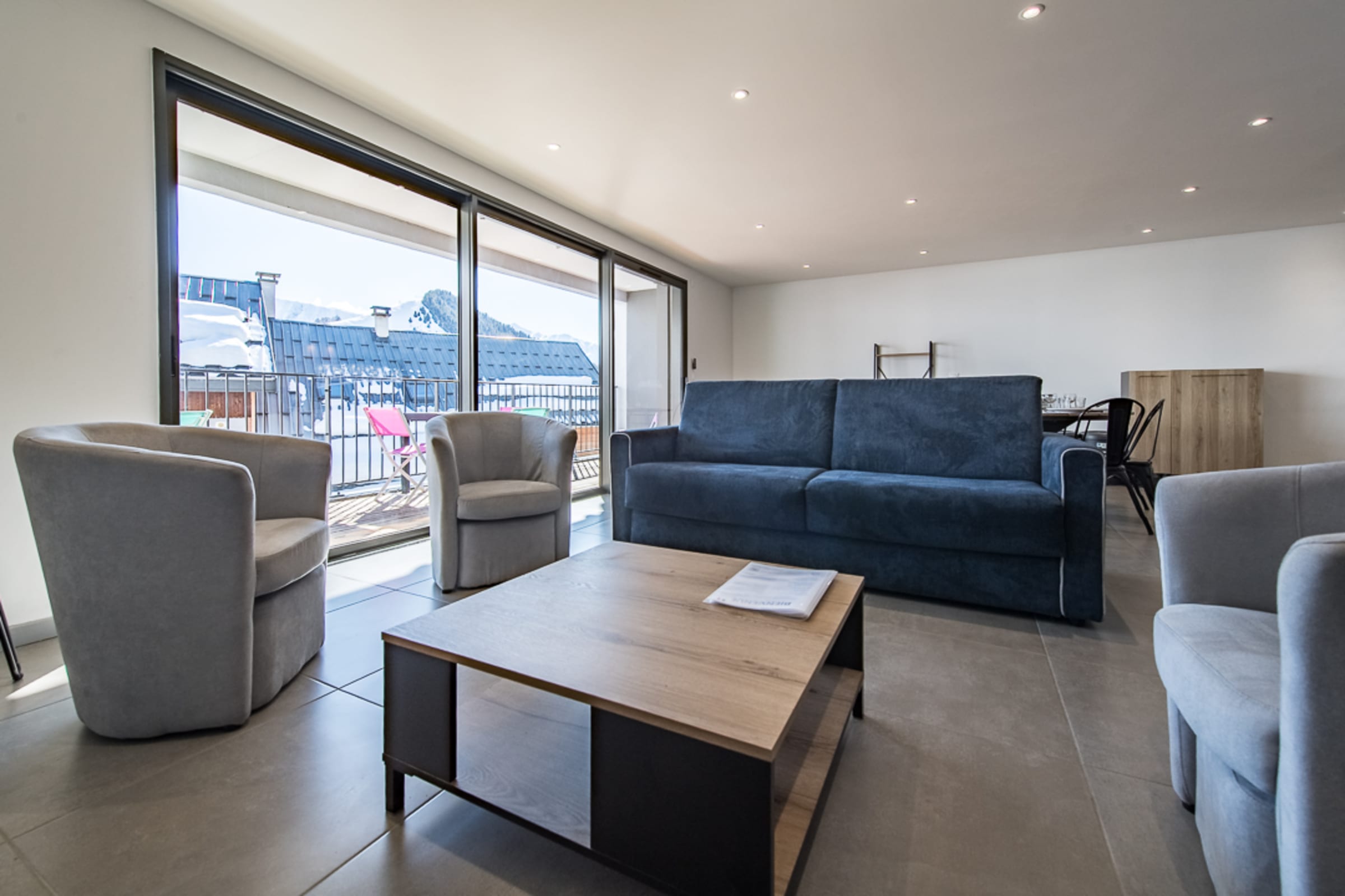 The bright living room opens onto a 12 m² terrace offering a breathtaking view of the ski slopes and the surrounding mountains. It is furnished with a comfortable sofa bed (160 x 200 cm), a television, and a cozy dining area. The open-plan kitchen is fully equipped with an oven, a coffee maker (filter), and everything you need to prepare delicious meals.