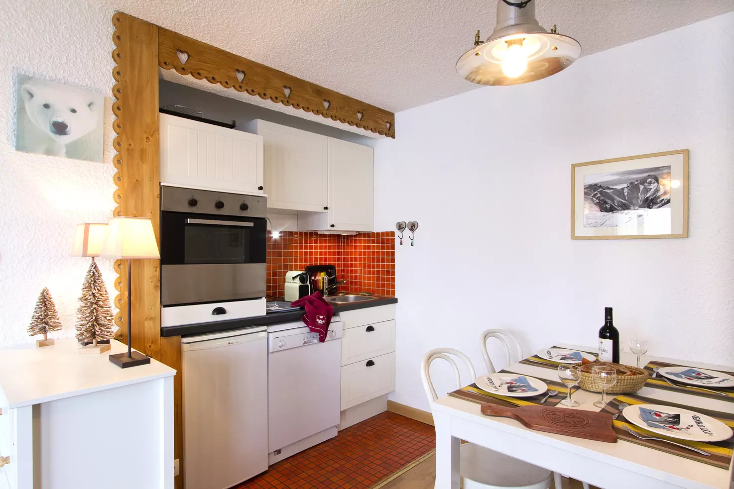 A kitchen equipped with a top fridge with freezer, an oven, a microwave, a 2-burner ceramic hob, toaster, kettle, Nespresso coffee maker, raclette machine and a dishwasher
