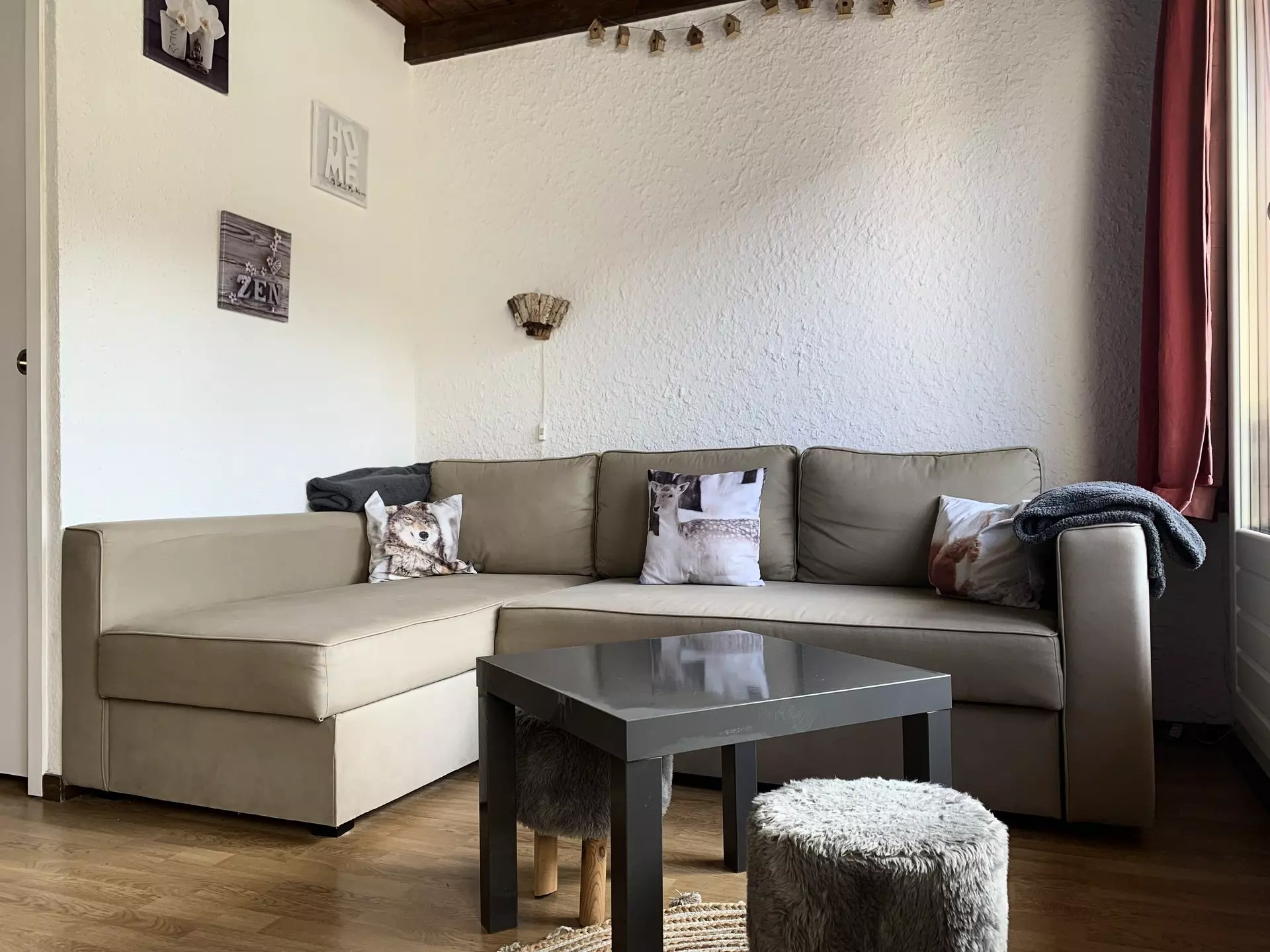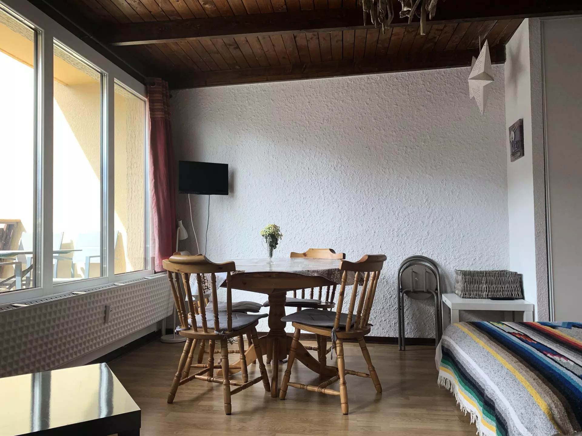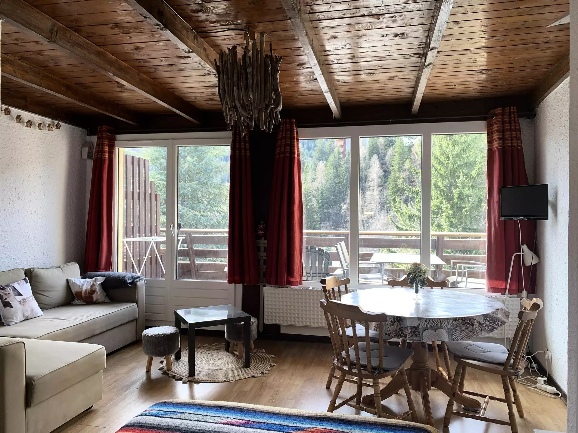 * Living room: 1 convertible corner sofa, 1 140x190 bed, round table with chairs, television, balcony access and outdoor furniture;