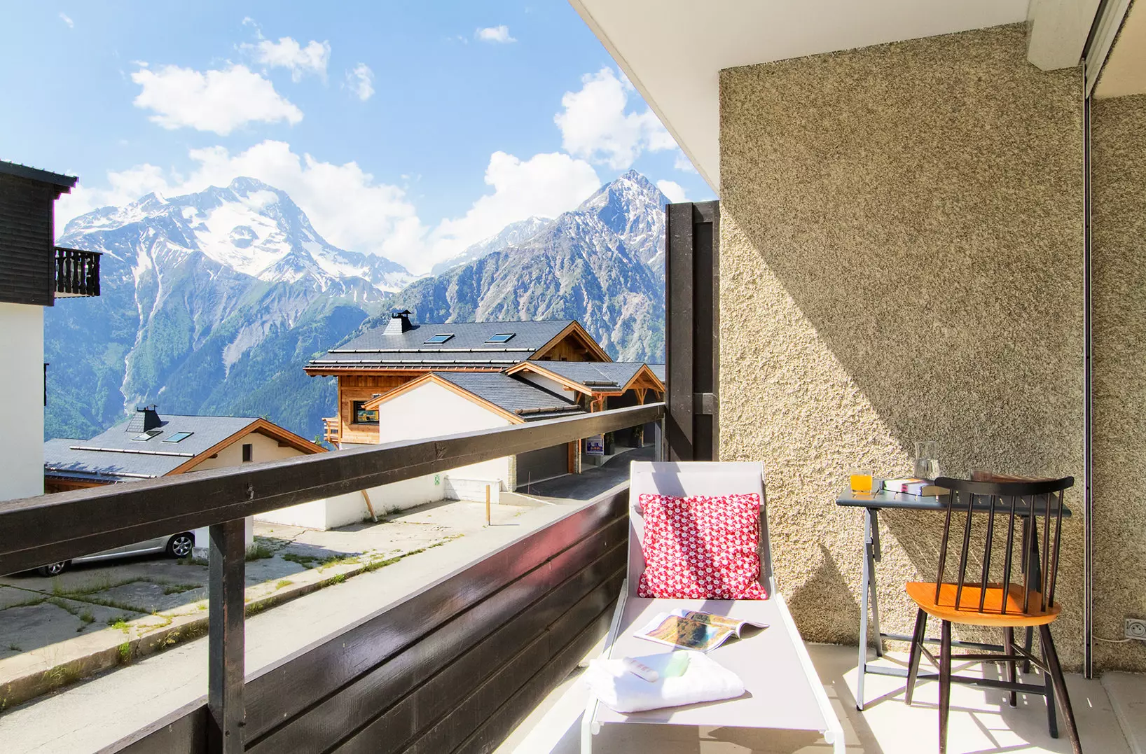 A large east-facing balcony offering a breathtaking view of the mountains.