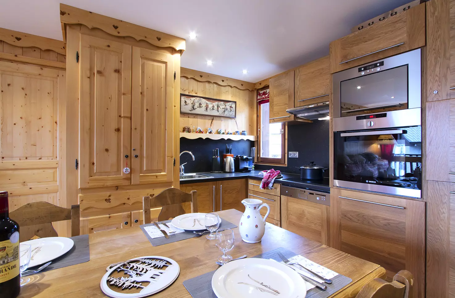 A kitchen including a washer-dryer, a dishwasher, 4-burner ceramic hob, microwave, oven, filter coffee maker + Nespresso coffee maker, kettle, toaster, raclette machine, fondue set, blender.