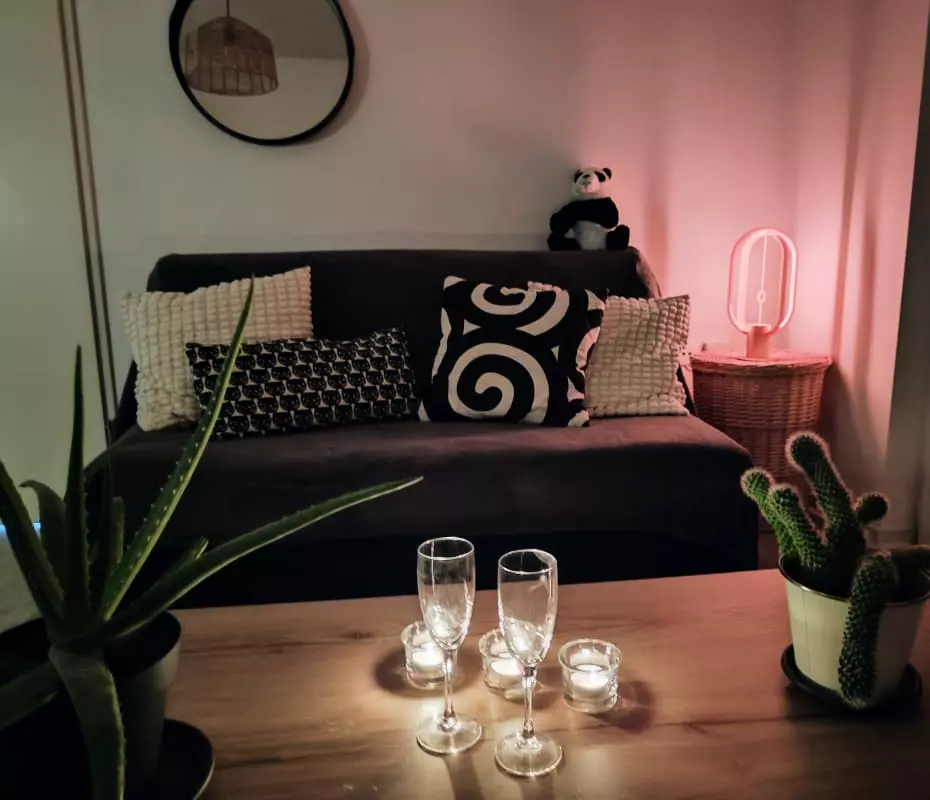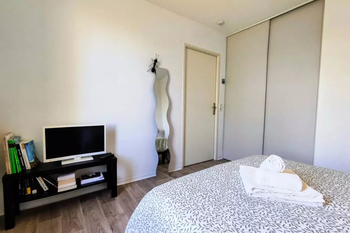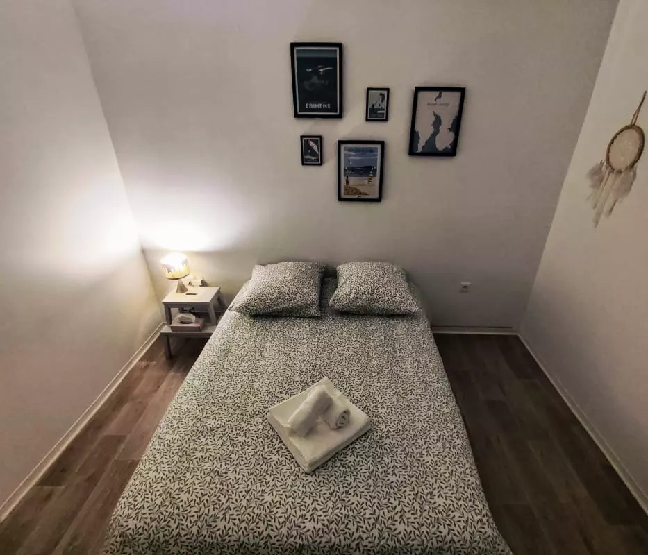 - a cozy bedroom with a double bed and a wall cupboard and a sofa bed in the living room to accommodate up to 4 travelers; a baby bed;