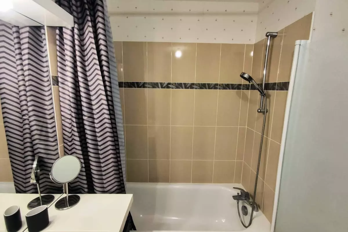 - a functional bathroom with bathtub;
