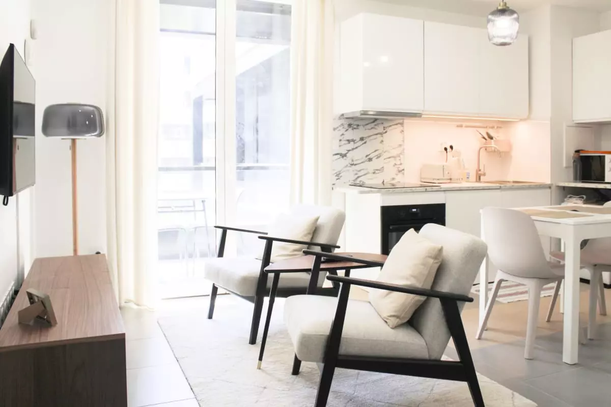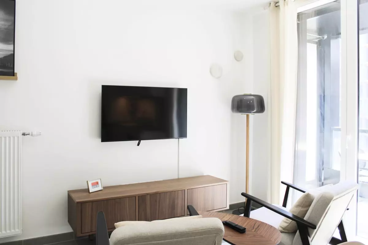 - a living room: a welcoming and cozy space with two armchairs and a large television for your moments of relaxation. The room is bathed in natural light thanks to a large window, offering a view of the surroundings and the residence's garden.