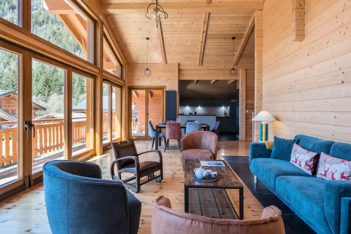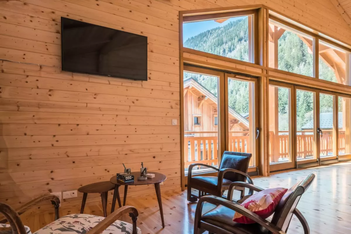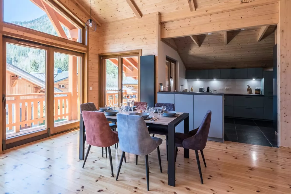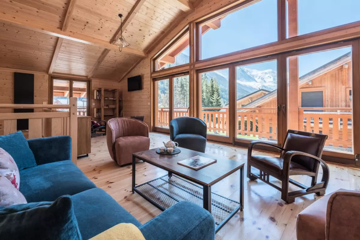 A large living room - dining room with access to a large balcony and offering a view of the entire Mont-Blanc range;