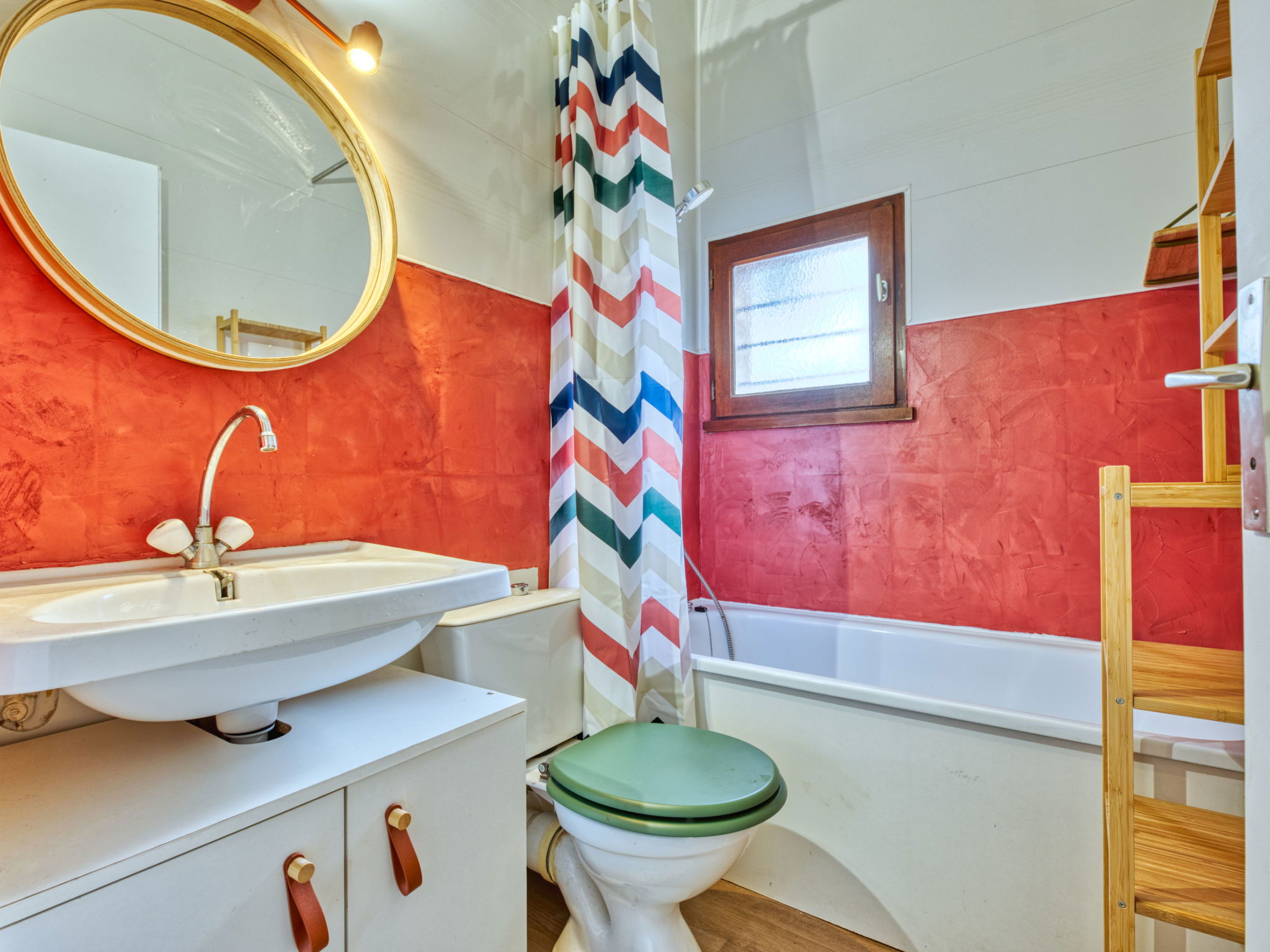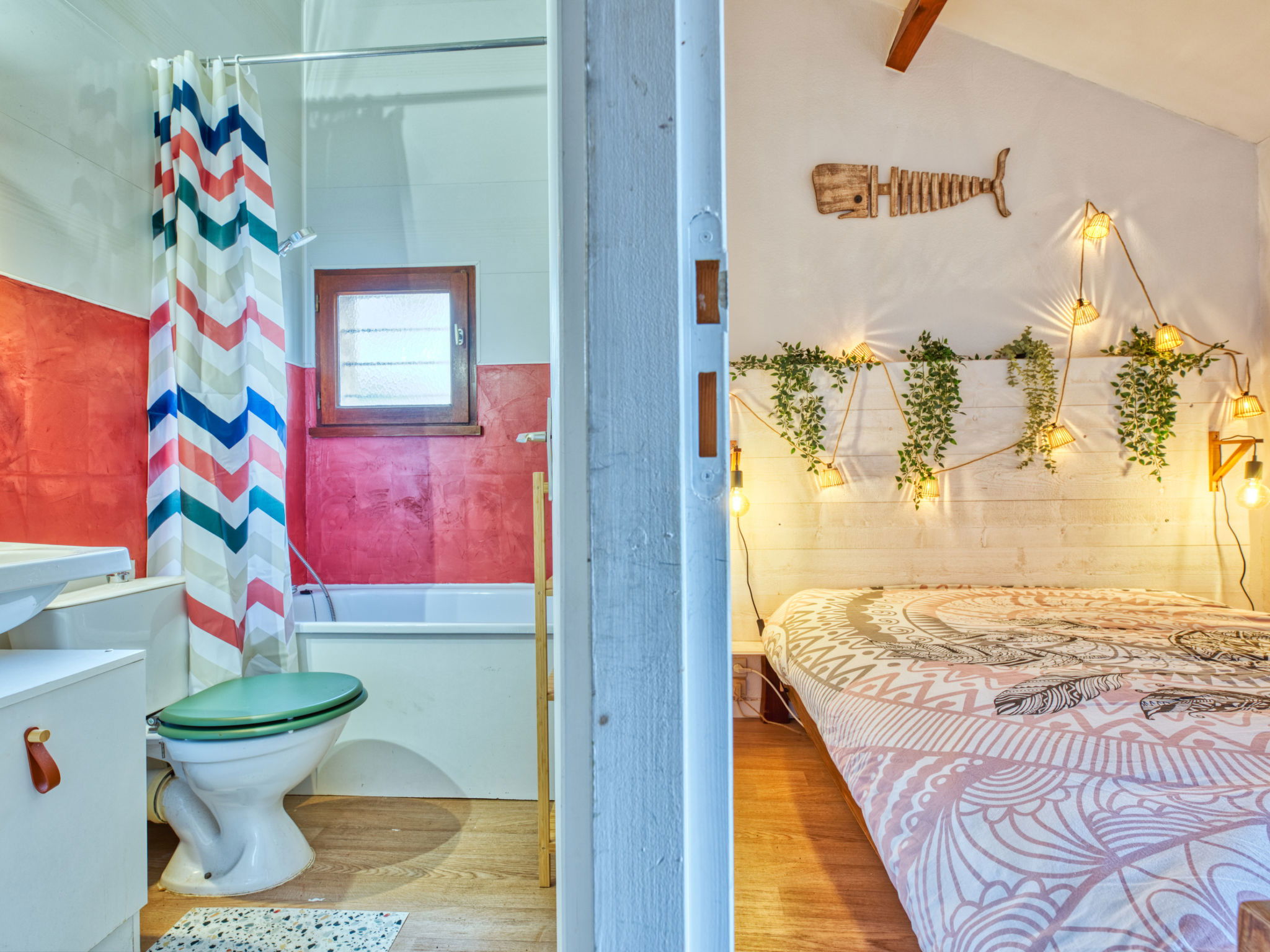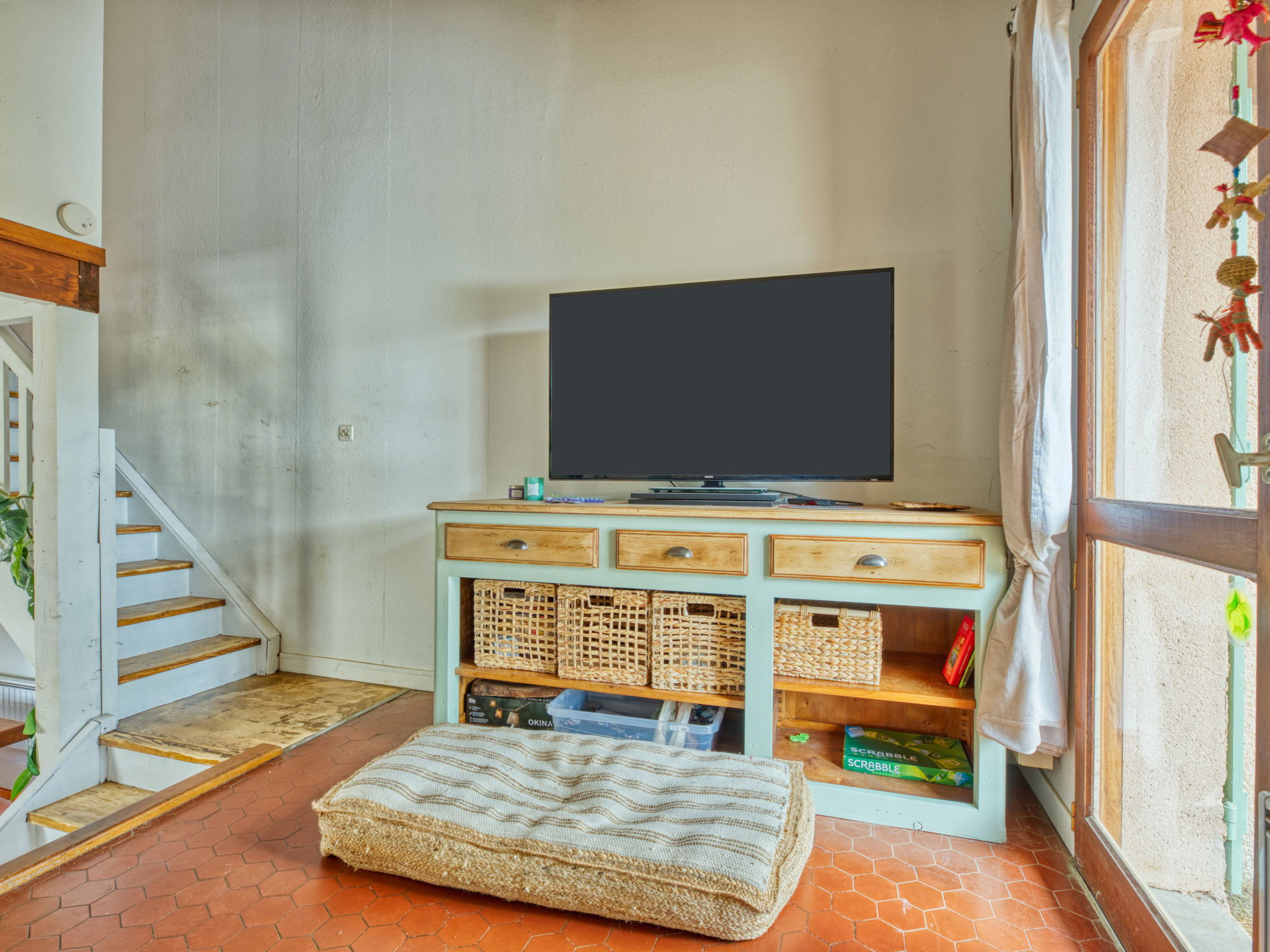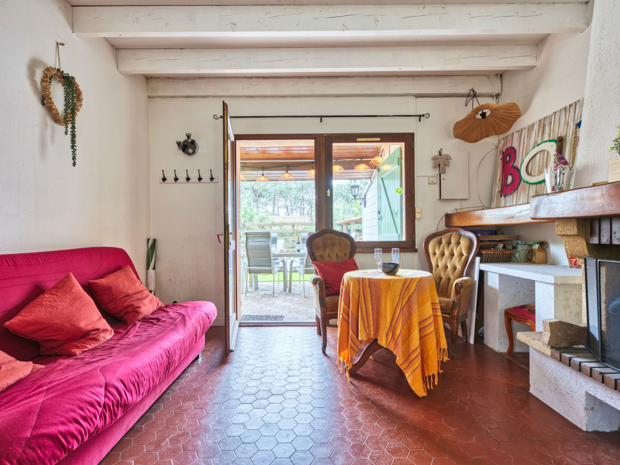 3-room terraced house 53 m2 on 2 levels. Comfortable furnishings: open living room with 1 sofabed (160 cm, length 190 cm), flat screen. Dining room with open-hearth fireplace. Open kitchen (oven, dishwasher, 3 induction hot plates, toaster, kettle, microwave, electric coffee machine, Capsules for coffee machine (Nespresso) extra). Upper floor: 1 room with 1 french bed (140 cm, length 190 cm). 1 room with 1 x 2 bunk beds (90 cm, length 180 cm). Bath/WC. Electric heating. Terrace 50 m2, south facing position. Terrace furniture, barbecue, deck chairs. Facilities: washing machine, iron. Internet (WiFi, free). Parking space n 270. Offer by a private individual according to Art. 155, IV of CGI.