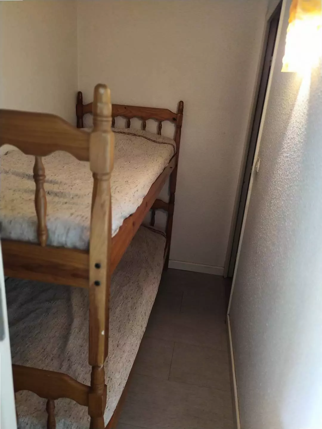 It consists of an entrance hall with a closet, a living room with a sofa bed for two people, a dining area and a kitchen area with a washing machine. A bedroom with a double bed (140cm), a cabin with two bunk beds (90cm) and finally a bathroom with a shower and toilet.