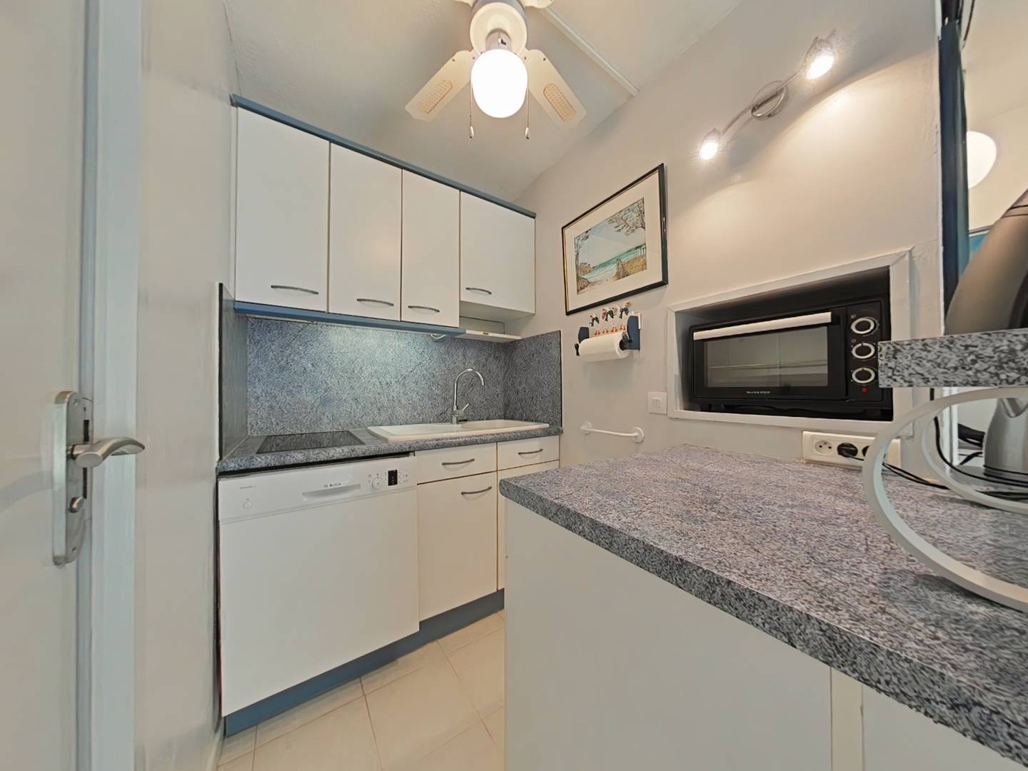 The apartment is in perfect condition and comprises a living room with a sofa and TV, an open and equipped kitchen, a bedroom with a 140x190cm bed, a sleeping alcove with a bunk bed (90x190cm), a bathroom with a shower and toilet. A private parking space is available in the residence.