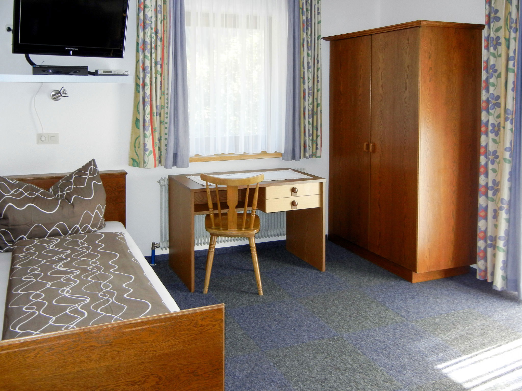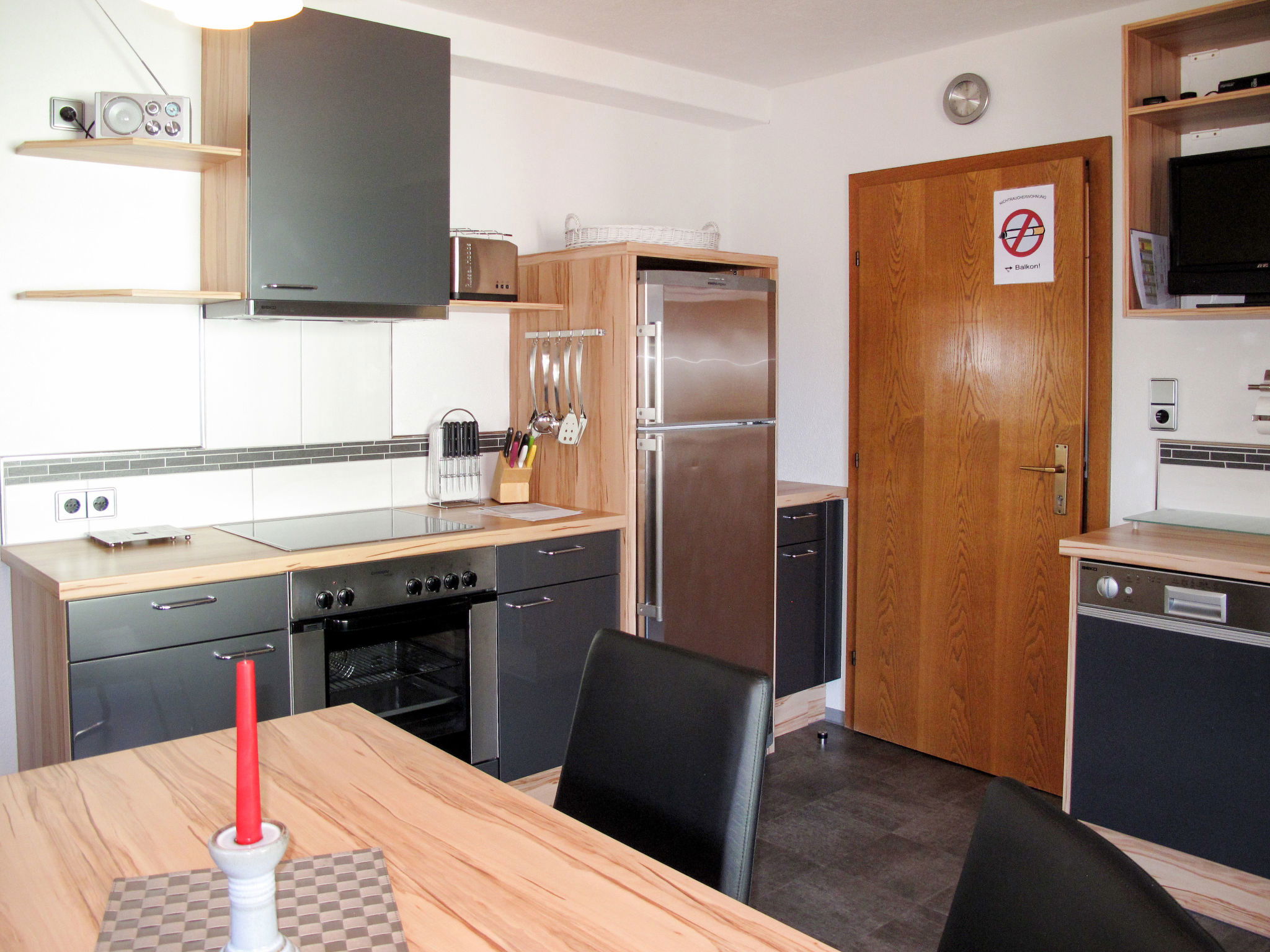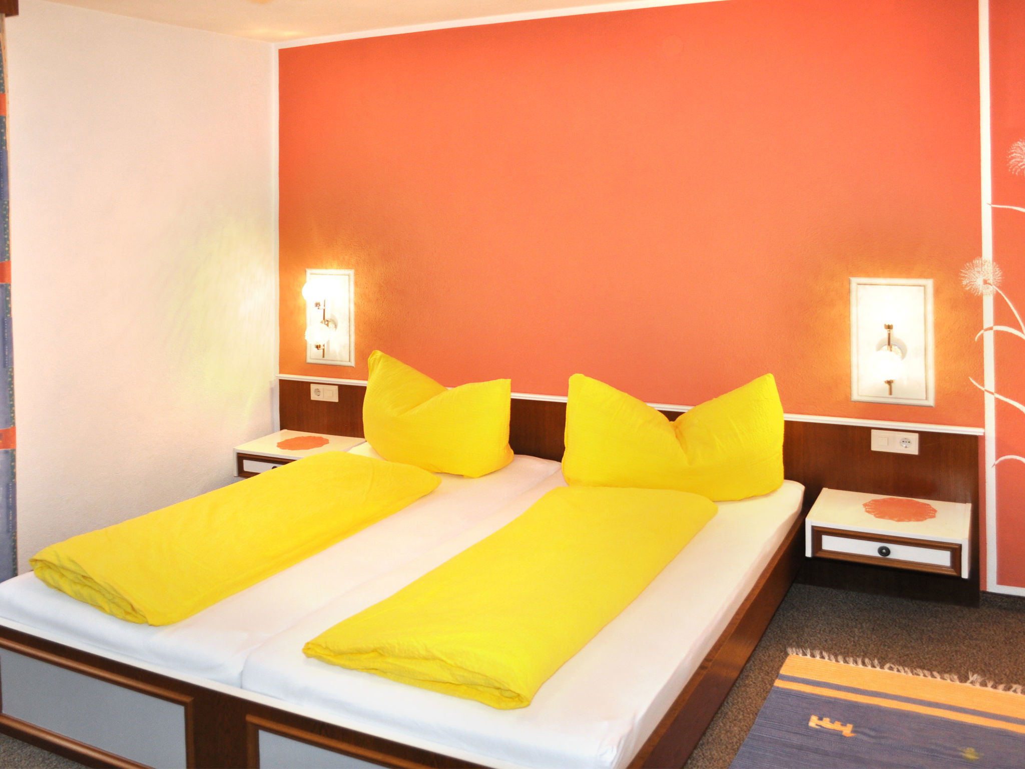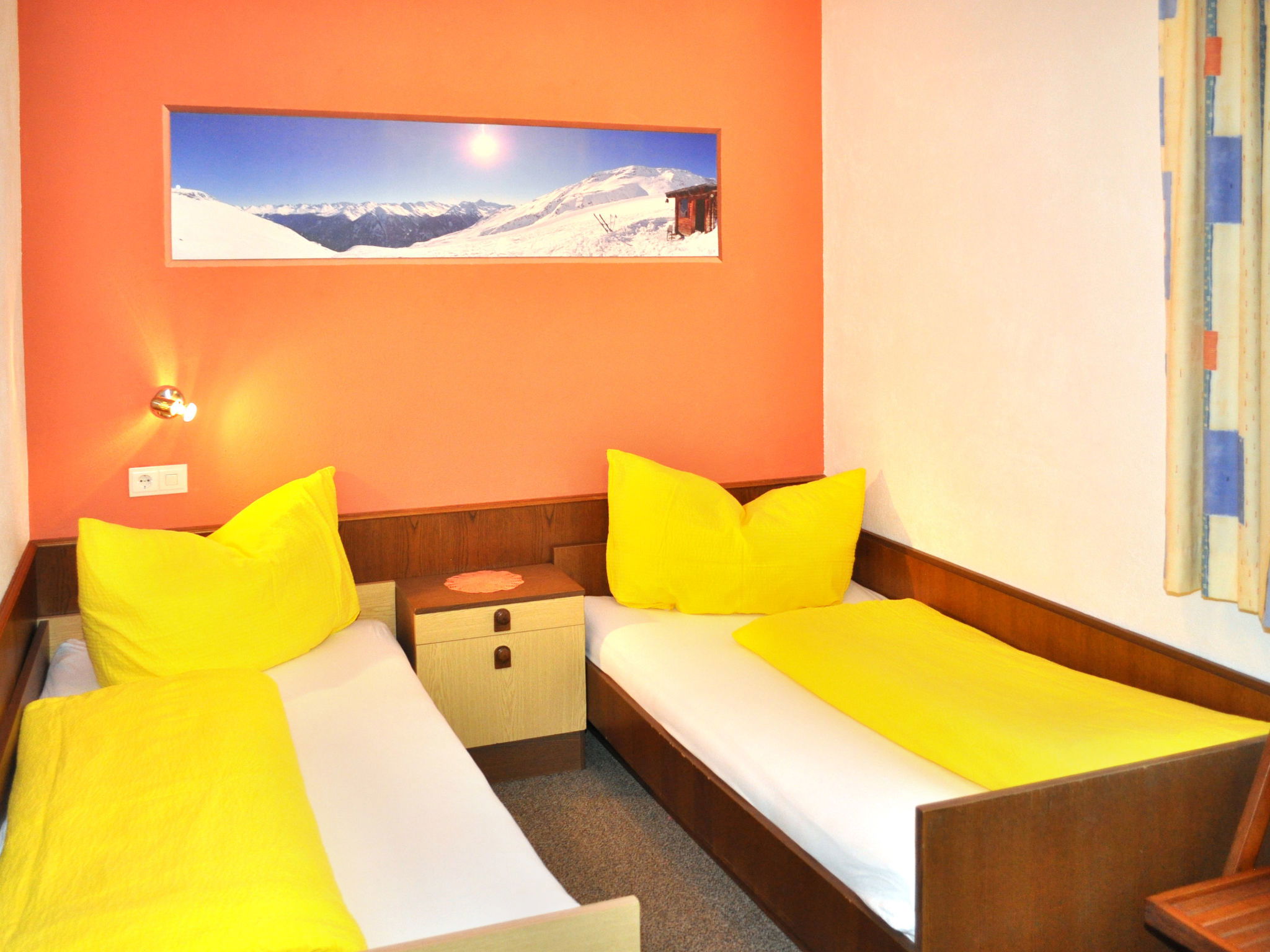 8-room apartment 150 m2 on 2 levels. Practical furnishings: upper floor: 1 double bedroom with 1 bed and shower/WC. Exit to the balcony. 1 room with 2 beds, shower/WC and satellite TV. Exit to the balcony. Kitchen-/living room (oven, dishwasher, 4 ceramic glass hob hotplates, toaster, kettle, microwave, electric coffee machine) with dining table, satellite TV. Exit to the balcony. 2nd upper floor: 3 double bedrooms. 1 room with 1 x 2 bunk beds. Kitchen-/living room (oven, dishwasher, 4 ceramic glass hob hotplates, toaster, kettle, microwave, electric coffee machine) with dining table, satellite TV. 2 showers/WC. Carpet. 3 balconies. Beautiful panoramic view of the mountains and the valley. Facilities: children's high chair, baby cot. Internet (WiFi, extra). Please note: non-smokers only. Maximum 1 pet/ dog allowed. Smoke alarm, fire extinguisher.