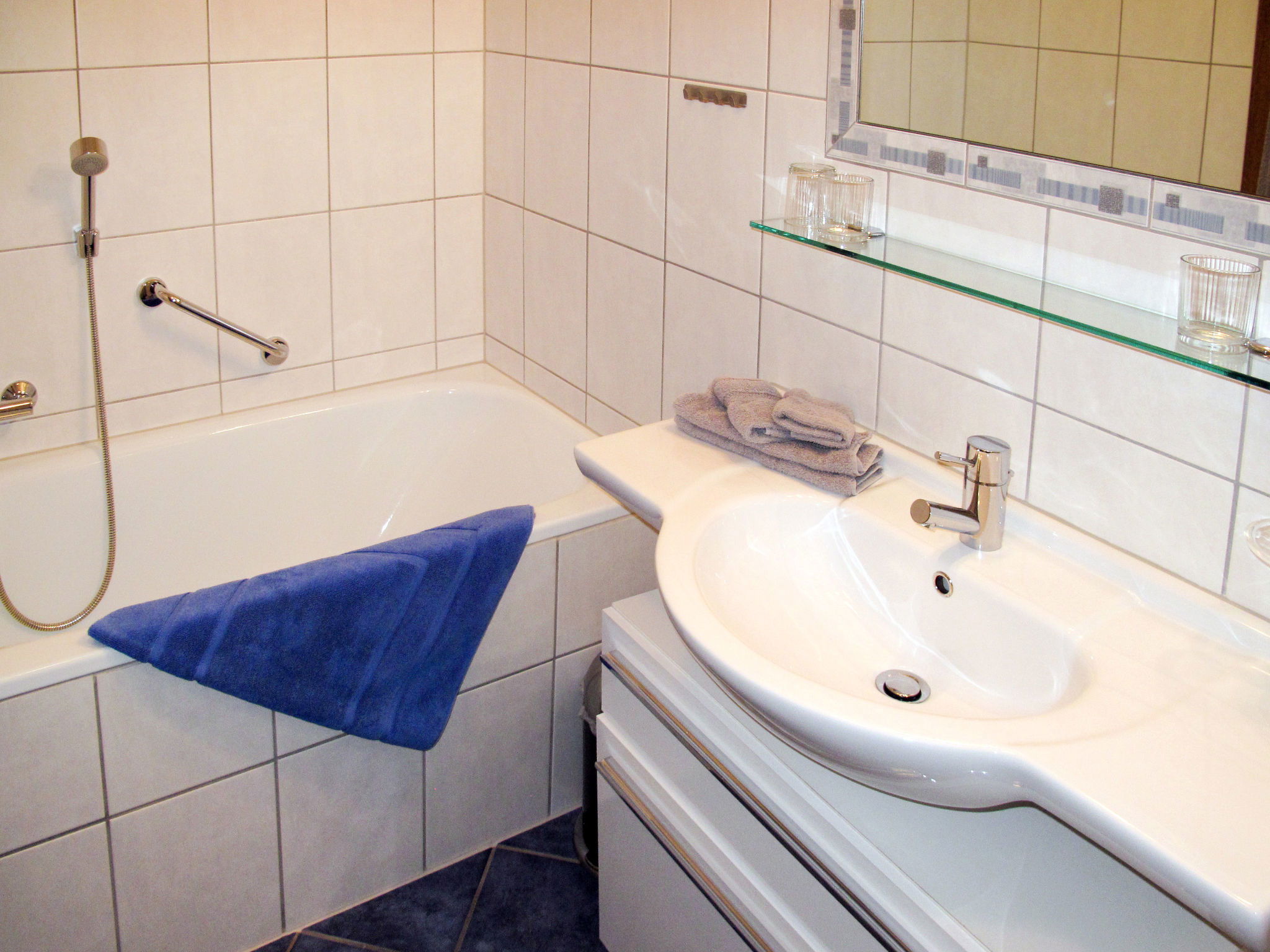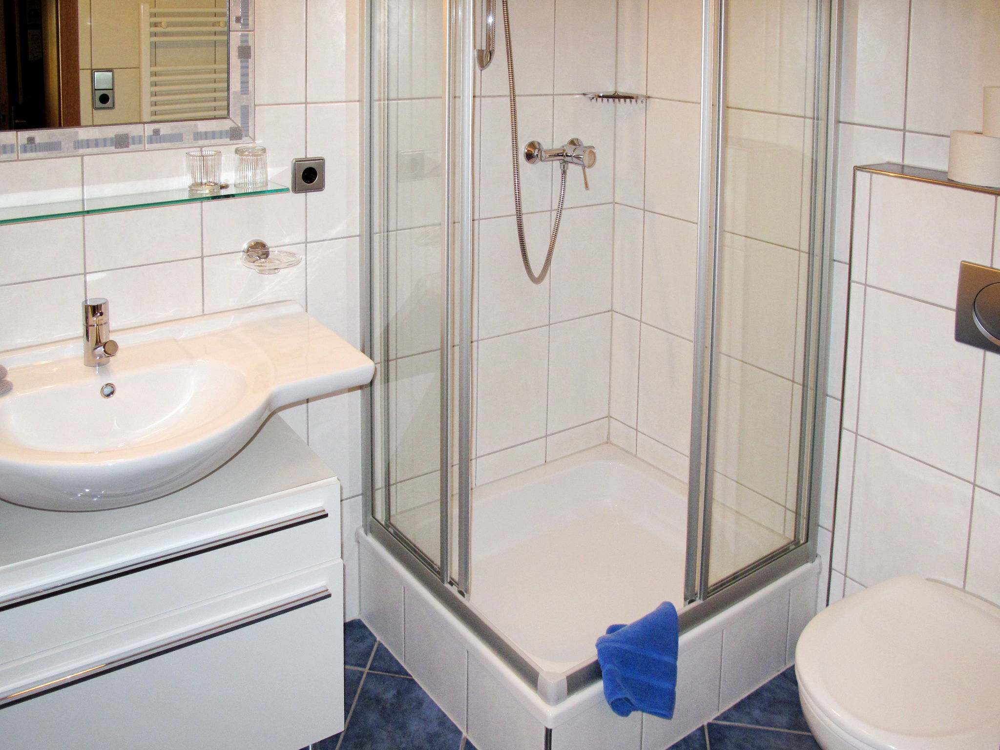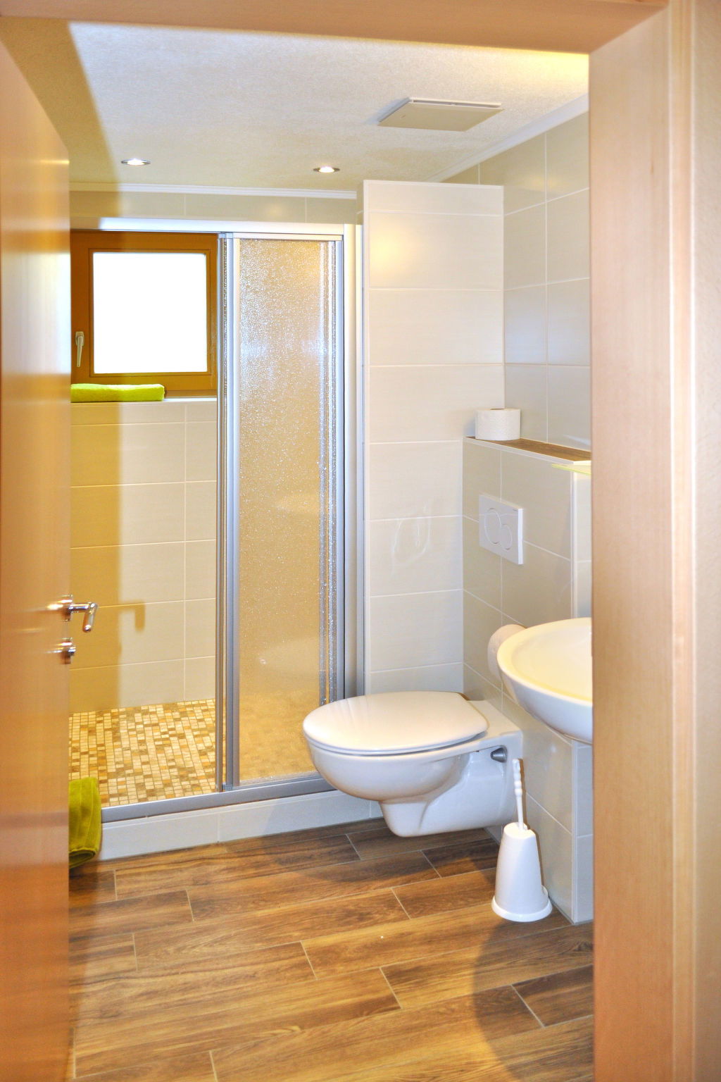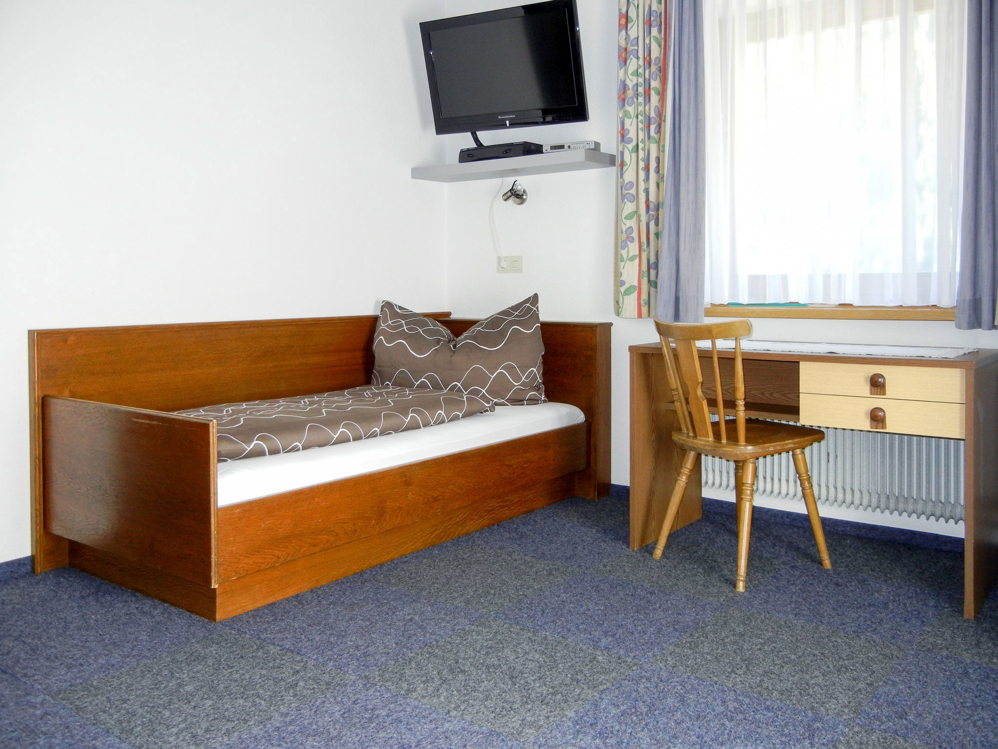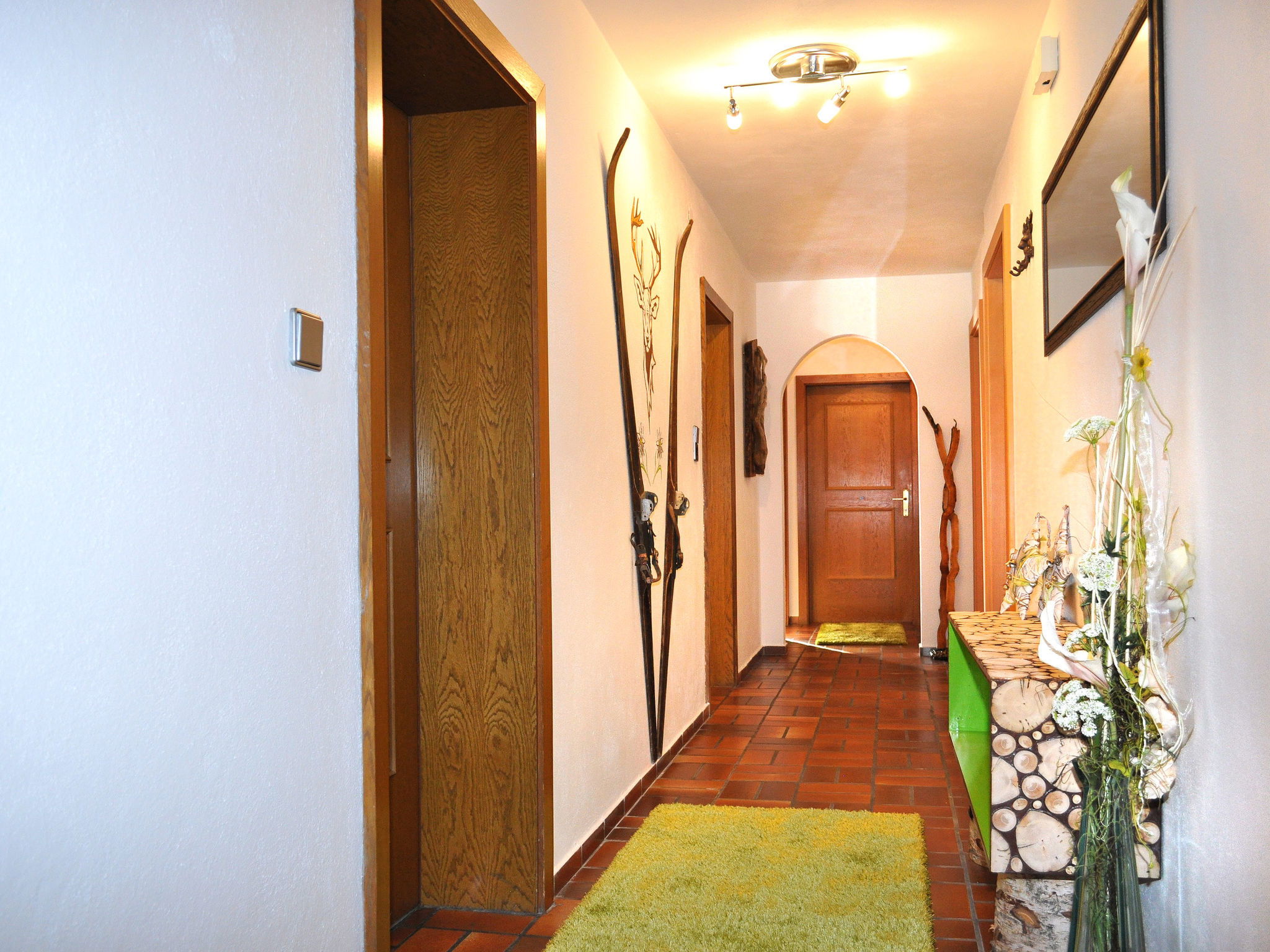 8-room apartment 150 m2 on 2 levels. Practical furnishings: upper floor: 1 double bedroom with 1 bed and shower/WC. Exit to the balcony. 1 room with 2 beds, shower/WC and satellite TV. Exit to the balcony. Kitchen-/living room (oven, dishwasher, 4 ceramic glass hob hotplates, toaster, kettle, microwave, electric coffee machine) with dining table, satellite TV. Exit to the balcony. 2nd upper floor: 3 double bedrooms. 1 room with 1 x 2 bunk beds. Kitchen-/living room (oven, dishwasher, 4 ceramic glass hob hotplates, toaster, kettle, microwave, electric coffee machine) with dining table, satellite TV. 2 showers/WC. Carpet. 3 balconies. Beautiful panoramic view of the mountains and the valley. Facilities: children's high chair, baby cot. Internet (WiFi, extra). Please note: non-smokers only. Maximum 1 pet/ dog allowed. Smoke alarm, fire extinguisher.