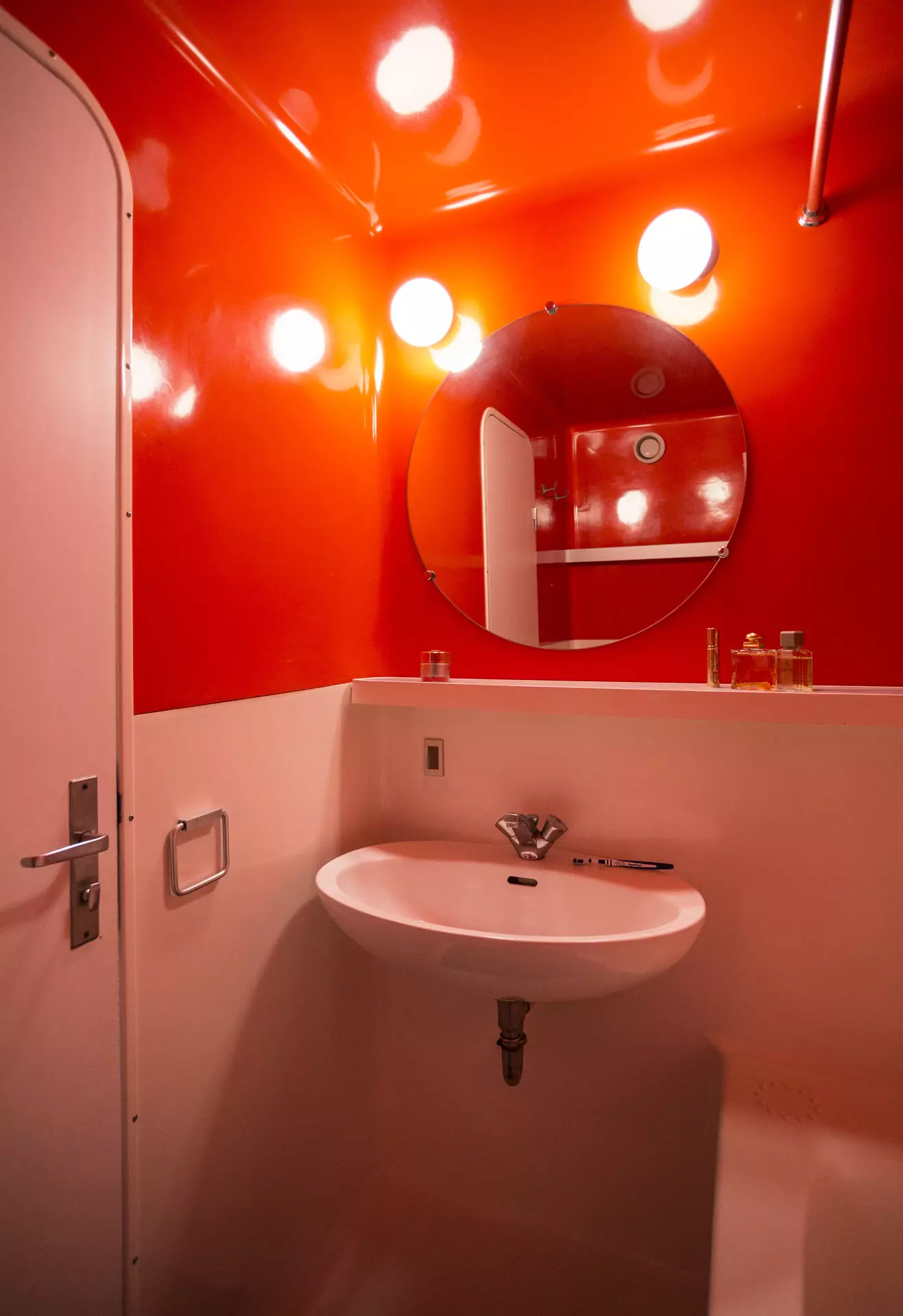 Composed at the entrance of a bathroom with WC