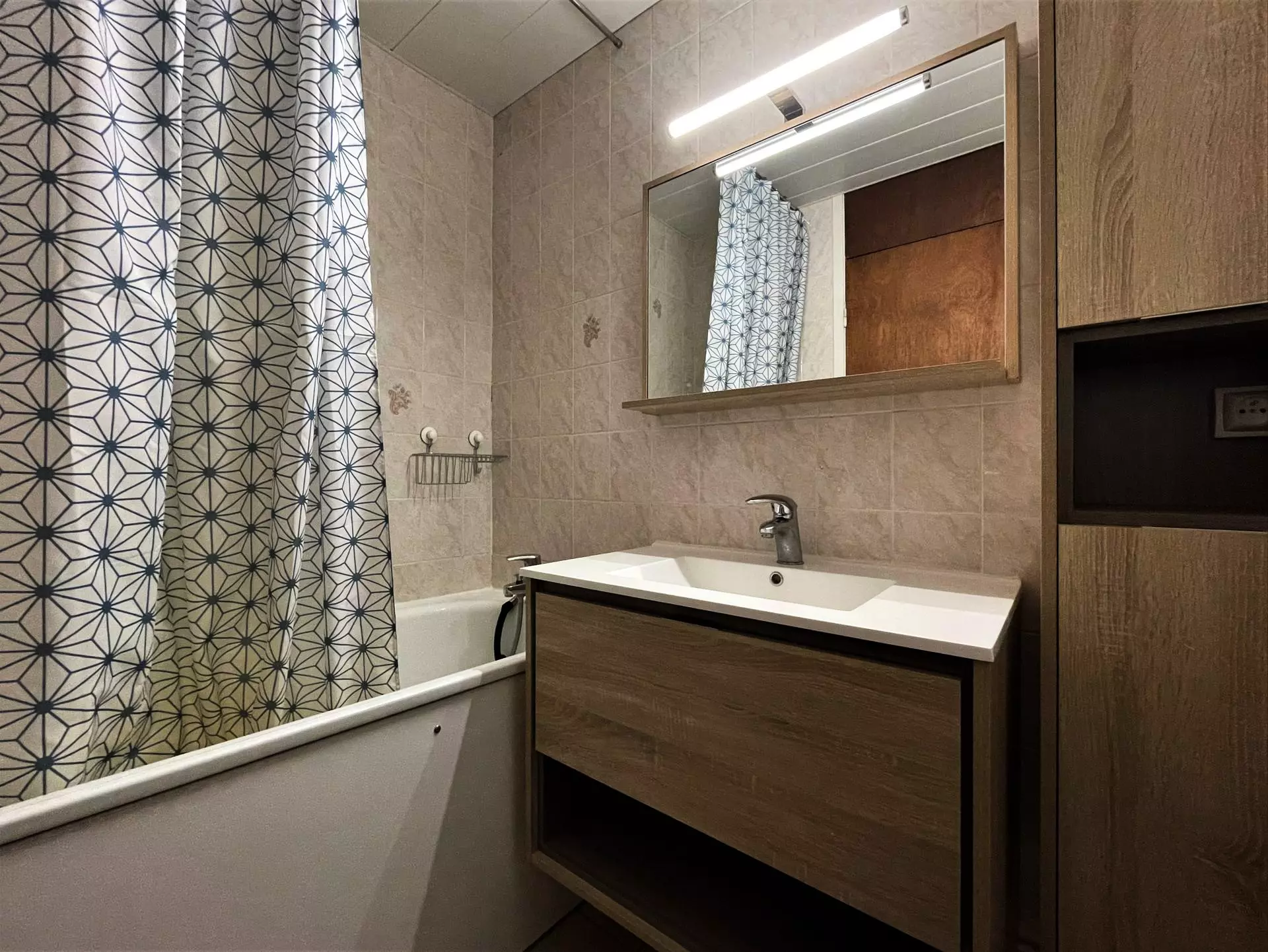 Bathroom: vanity unit, bathtub, towel dryer