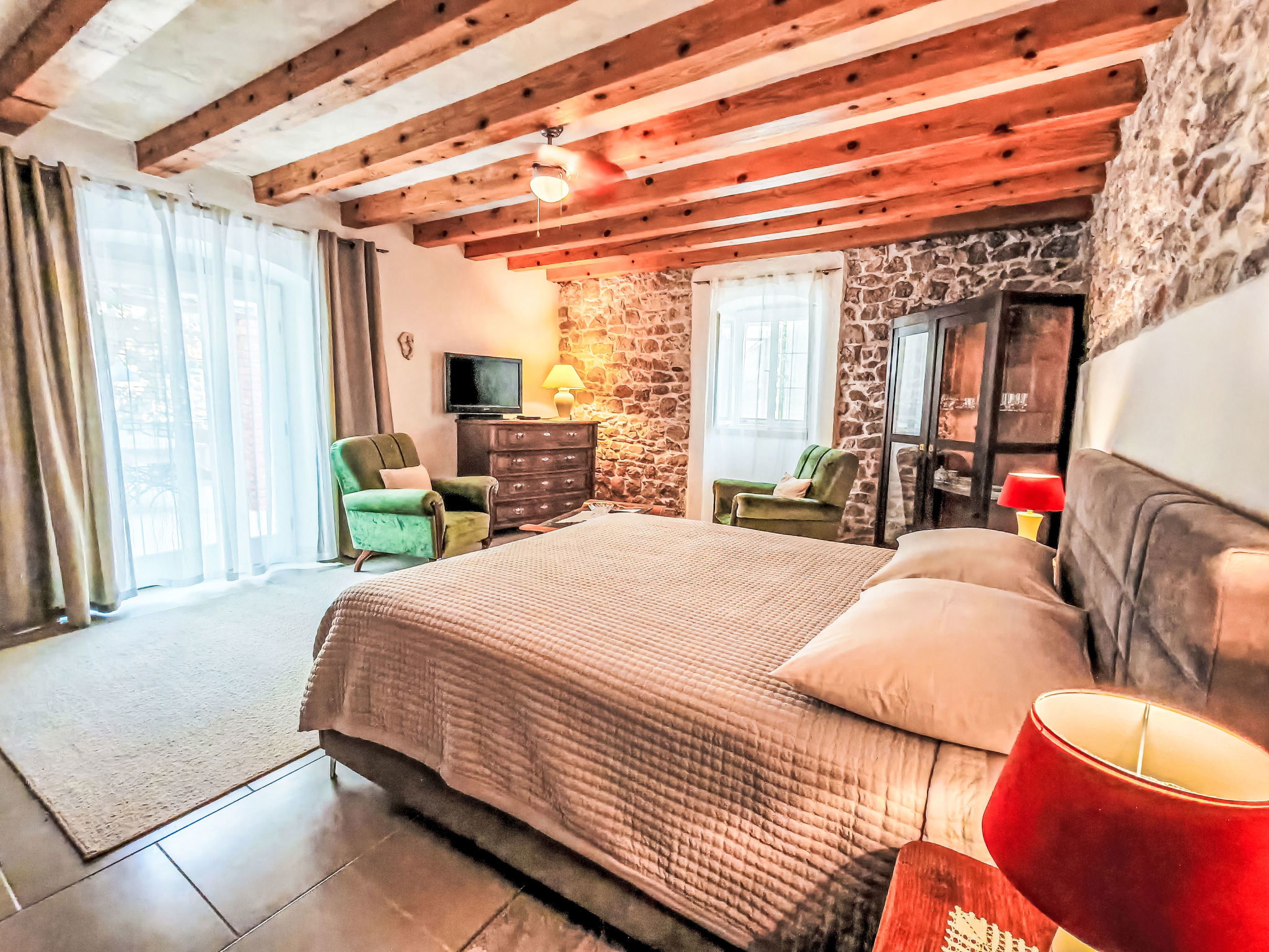 3-room house 165 m2 on 2 levels. Living/sleeping room 22 m2 with 2 sofabeds (80 cm, length 200 cm), satellite TV, air conditioning and fan. Exit to the garden, to the terrace. Kitchen (4 hot plates, oven, dishwasher, freezer, electric coffee machine) with dining table. Exit to the terrace. Bath/bidet/WC with corner bath. Upper floor: 1 room 20 m2 with 1 french bed (160 cm, length 190 cm), air conditioning. 1 room with 1 french bed (160 cm, length 190 cm), air conditioning. Exit to the terrace. Shower/WC. Underfloor heating. Terrace 15 m2. Terrace furniture. Partial distant view of the sea. Facilities: Internet (WiFi, free). Parking (fenced).