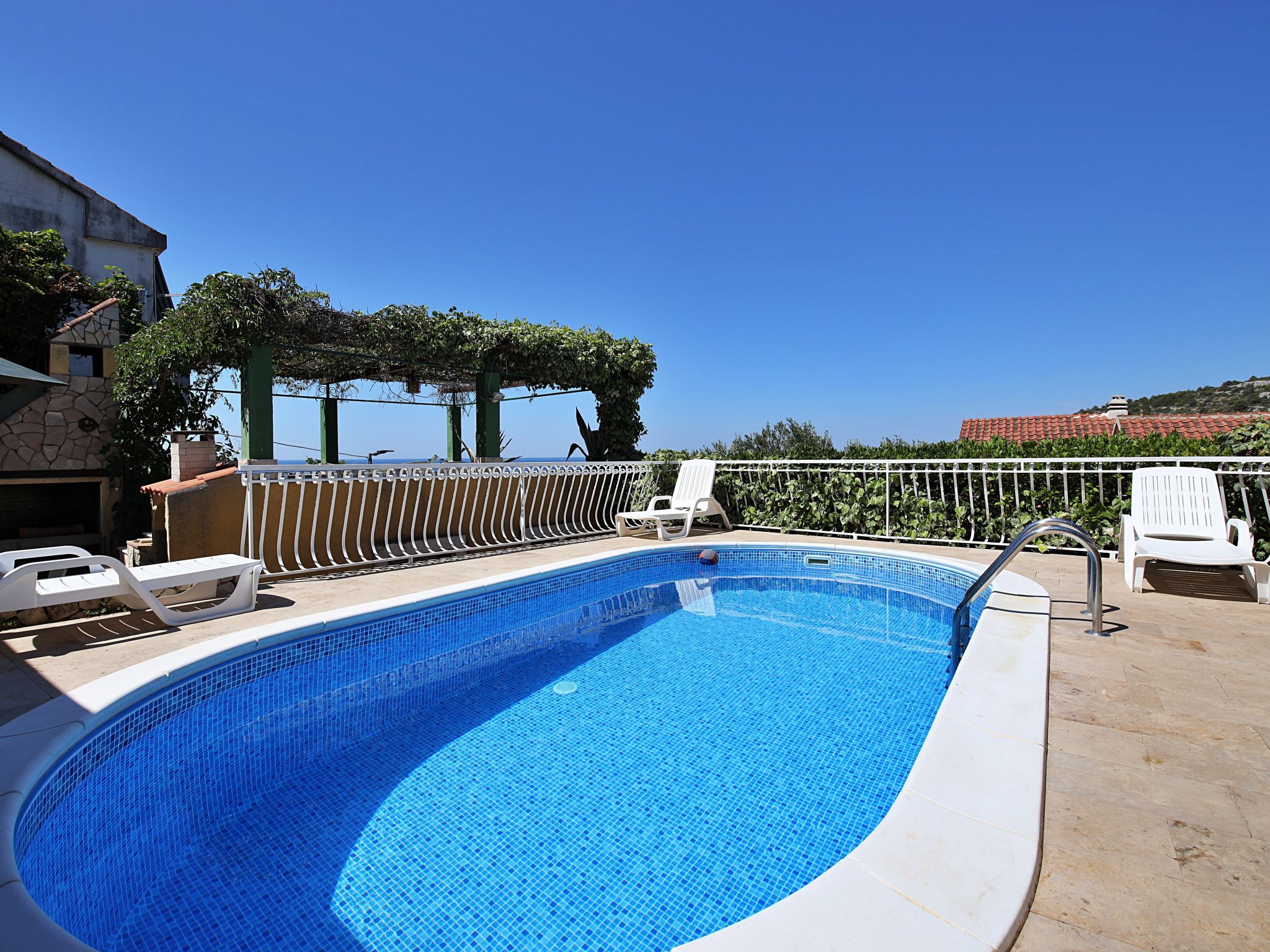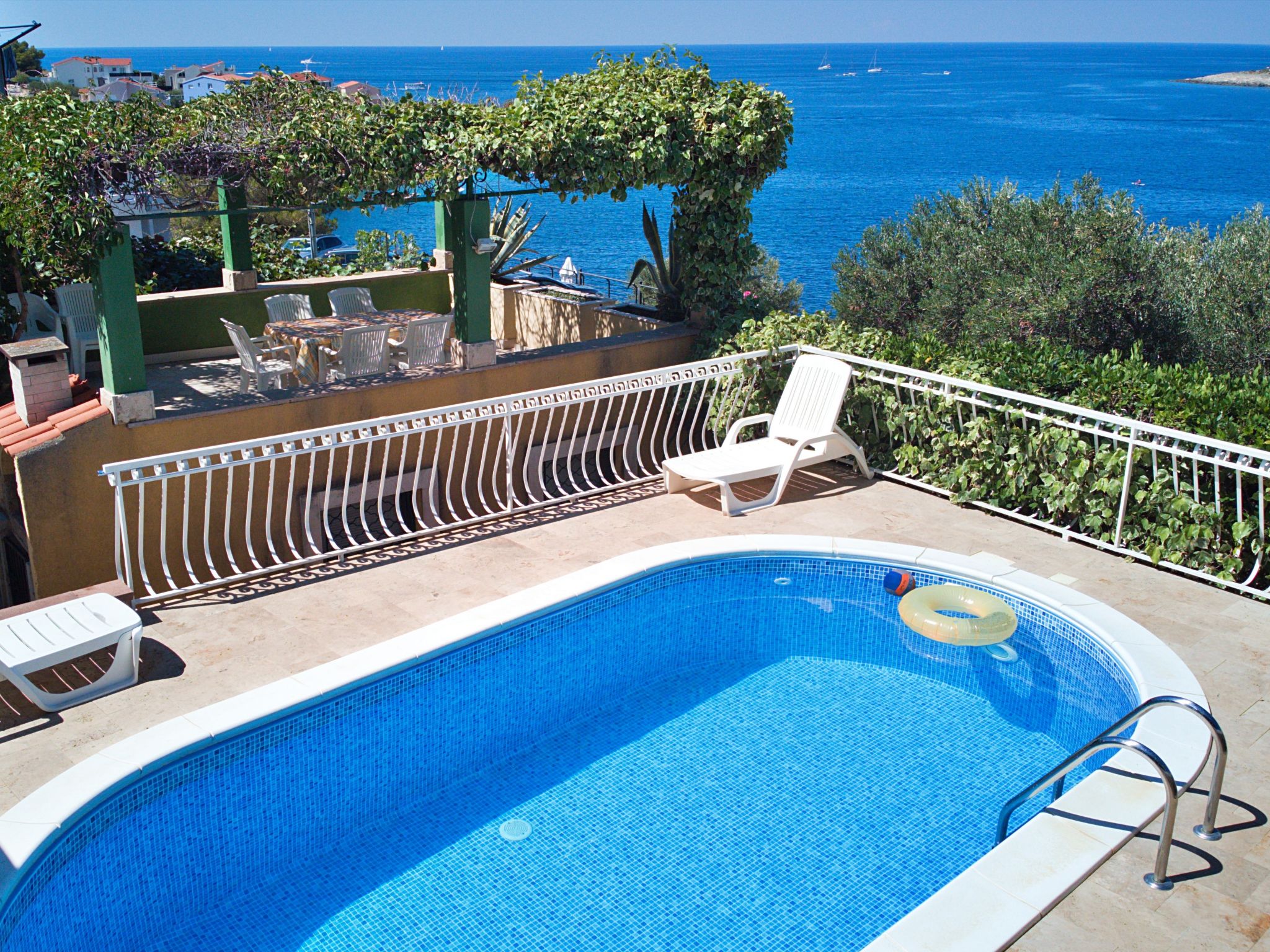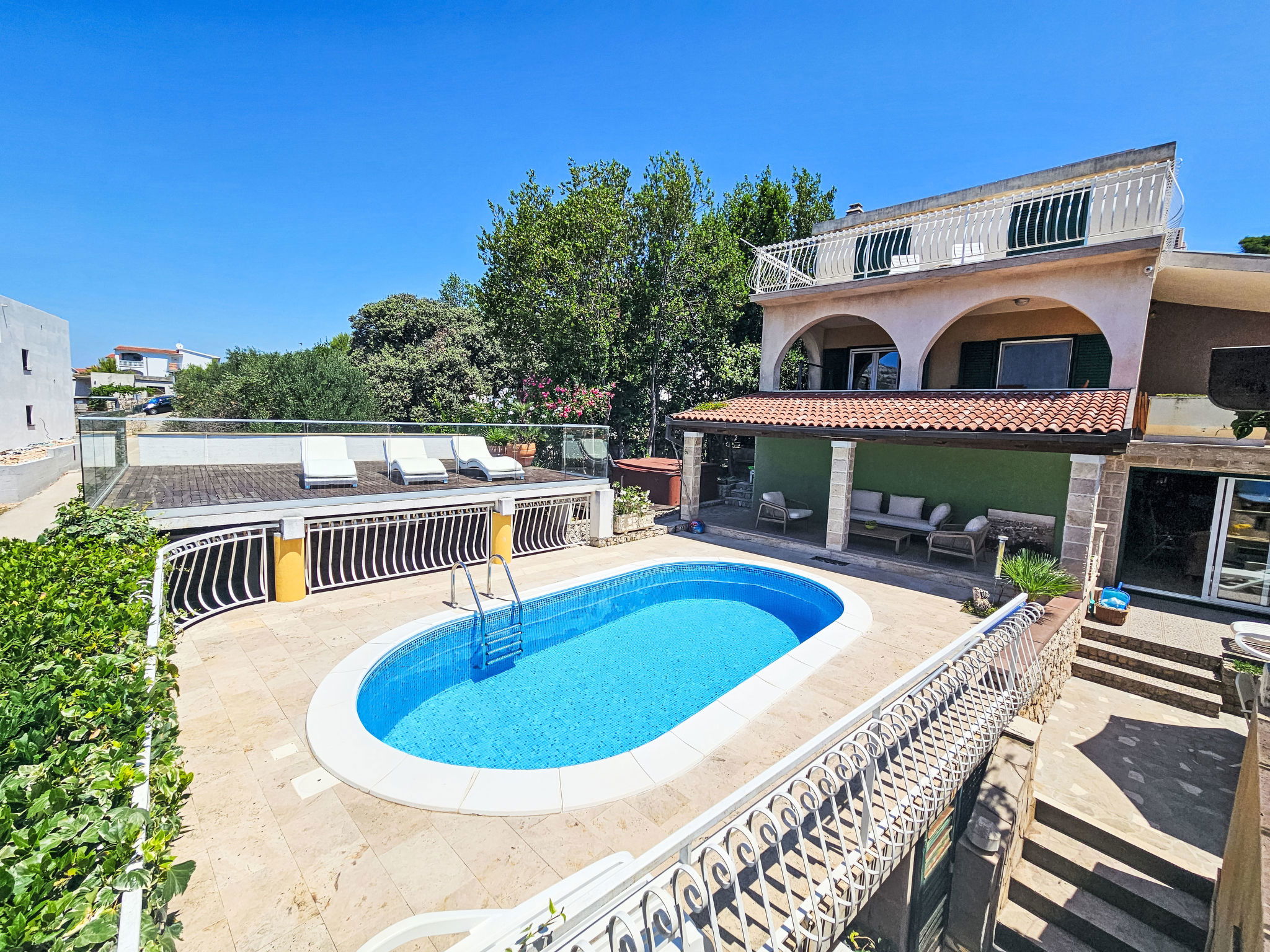 Ražanj 10 km from Rogoznica: Single-family house "Carmen", 3 storeys. In a quiet, sunny position on a slope, 90 m from the sea, 90 m from the beach, in a cul-de-sac. Private: small garden wildlife garden and trees, swimming pool heated (6 x 3 m, depth 150 cm, seasonal availability: 10.Jun. - 20.Sep.). Outdoor shower, hot tub, terrace (50 m2), garden furniture, barbecue. In the house: internet access, table tennis, sun terrace. Available: bicycles (2). Roofed, parking at the house on the premises. Shop, restaurant 500 m, bus stop 6.4 km, rocky beach, concrete beach 90 m. Please note: private mooring (extra).