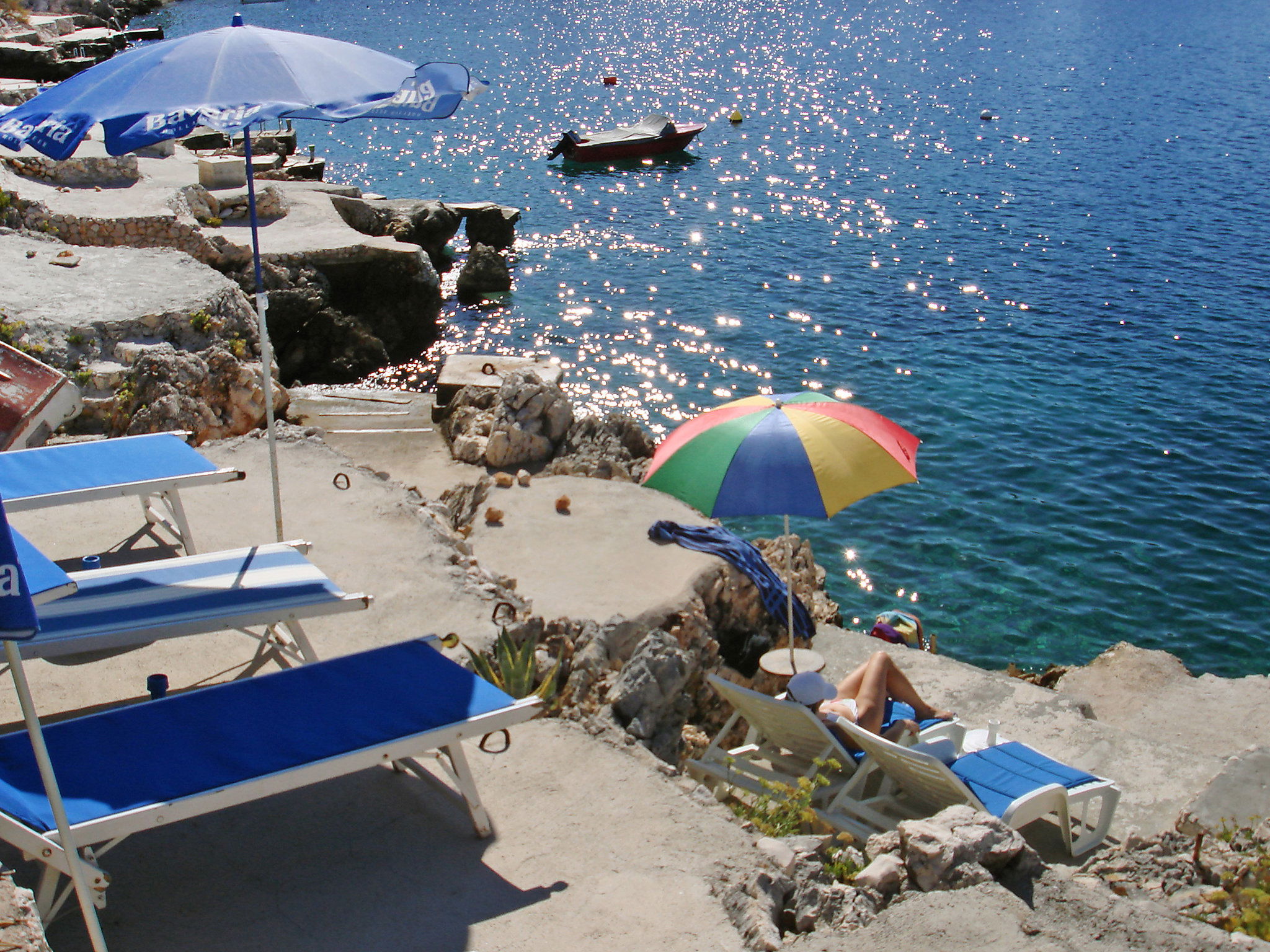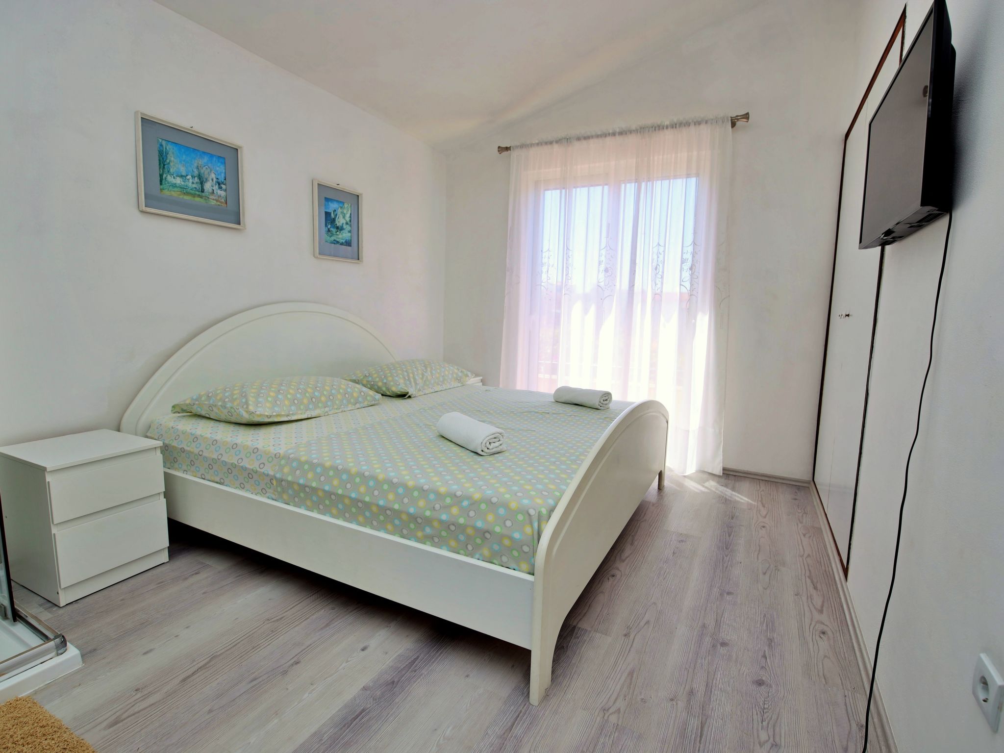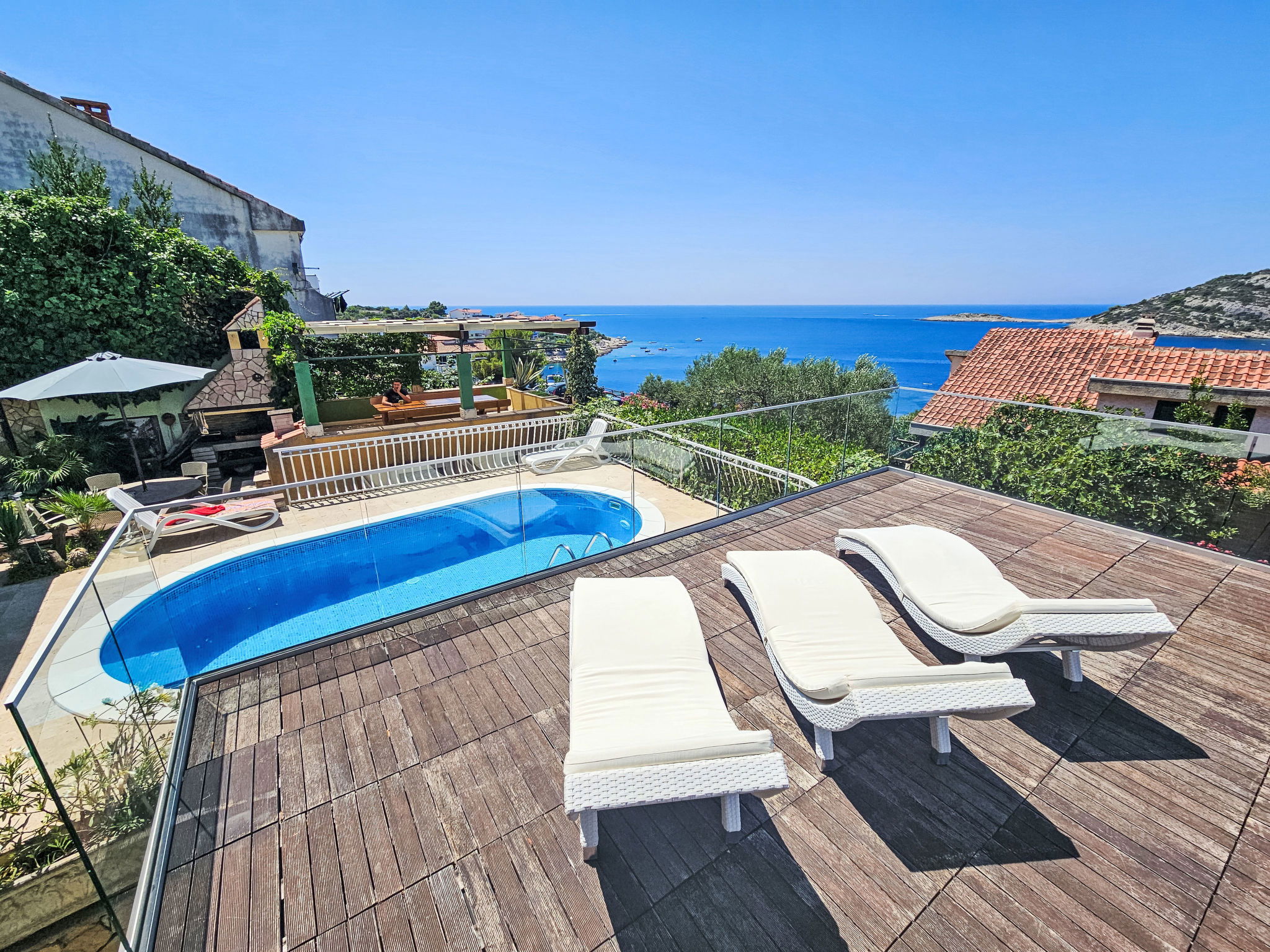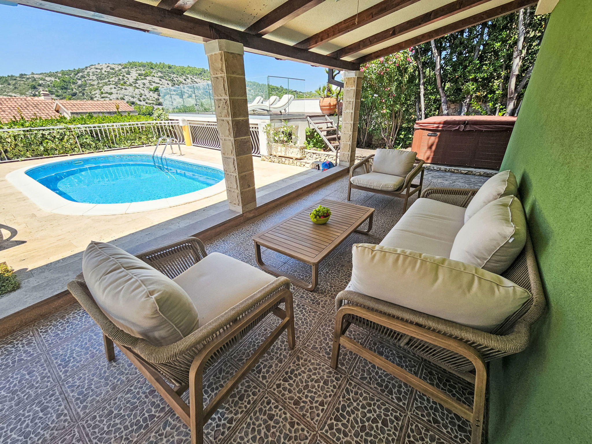 Ražanj 10 km from Rogoznica: Single-family house "Carmen", 3 storeys. In a quiet, sunny position on a slope, 90 m from the sea, 90 m from the beach, in a cul-de-sac. Private: small garden wildlife garden and trees, swimming pool heated (6 x 3 m, depth 150 cm, seasonal availability: 10.Jun. - 20.Sep.). Outdoor shower, hot tub, terrace (50 m2), garden furniture, barbecue. In the house: internet access, table tennis, sun terrace. Available: bicycles (2). Roofed, parking at the house on the premises. Shop, restaurant 500 m, bus stop 6.4 km, rocky beach, concrete beach 90 m. Please note: private mooring (extra).