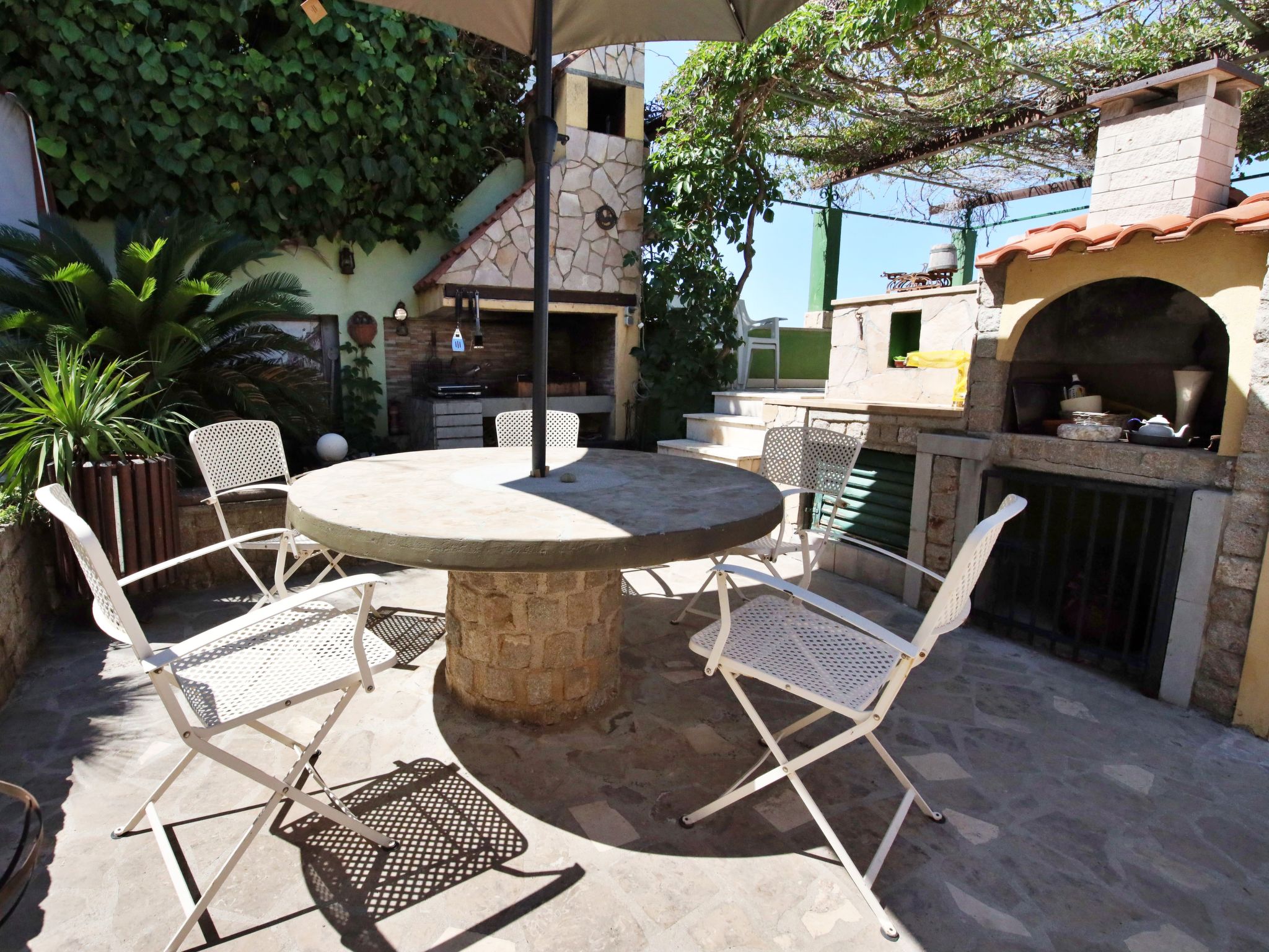 6-room house 150 m2 on 3 levels. Living room with satellite TV (flat screen), DVD and air conditioning. Exit to the terrace. Dining room. Open kitchen (4 hot plates, oven, dishwasher, microwave, freezer, electric coffee machine). Sep. WC. On the lower ground floor: (exterior staircase) small living/sleeping room with satellite TV (flat screen). Exit to the terrace. Shower/WC. Upper floor: 1 double bedroom with shower and air conditioning. Exit to the balcony. 1 double bedroom with shower and air conditioning. Exit to the terrace. 1 double bedroom with satellite TV and air conditioning. Exit to the terrace. Bath/WC. Balcony, large terrace 25 m2, roofed, terrace 25 m2. Terrace furniture, deck chairs. Marvellous view of the sea. Facilities: safe. Internet (WiFi, free). Garage (2 cars).