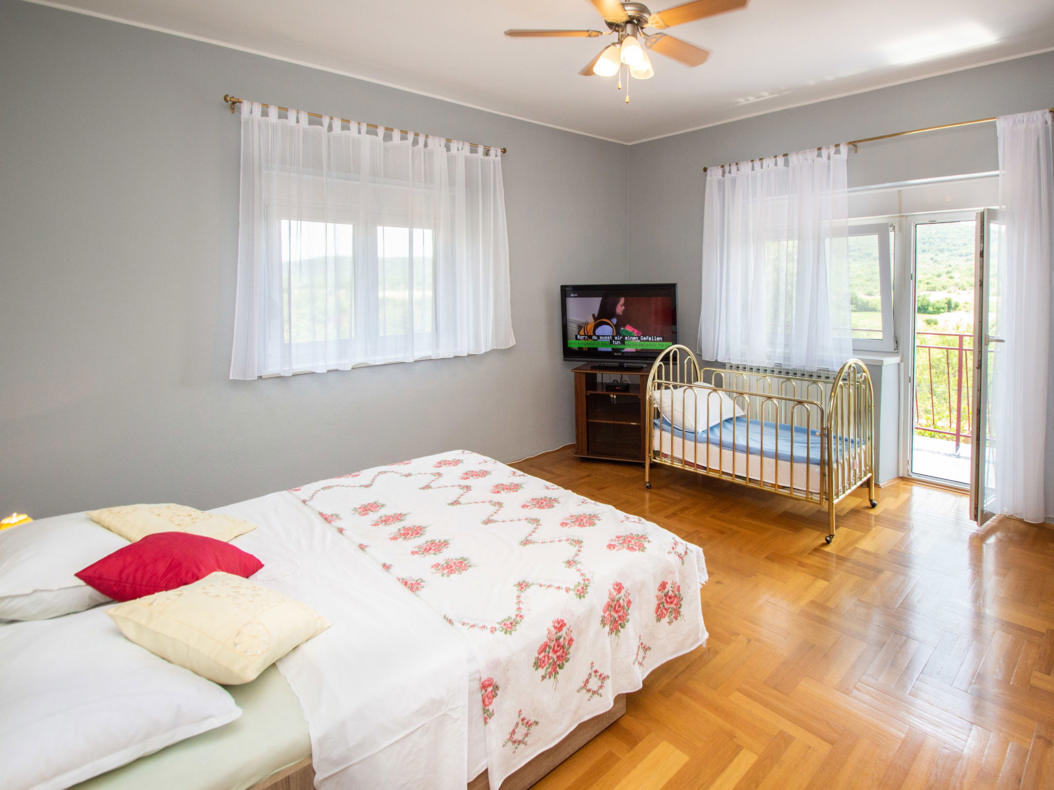 4-room apartment 78 m2, on the ground floor, south-west facing position. Living/dining room with satellite TV and air conditioning. 1 room with 1 french bed (180 cm, length 200 cm), satellite TV (flat screen). Exit to the balcony. 1 room with 1 french bed (180 cm, length 190 cm). 1 room with 1 french bed (150 cm, length 200 cm), TV and flat screen. Exit to the balcony. Open kitchen (4 hot plates, oven, dishwasher, toaster, kettle, microwave, freezer, electric coffee machine). Bath/WC, shower/WC. Heating (extra), air-conditioning (extra). Balcony 11 m2. Balcony furniture. View of the countryside. Facilities: washing machine, baby cot (extra). Internet (WiFi, free). Parking (fenced). Maximum 1 pet/ dog allowed.