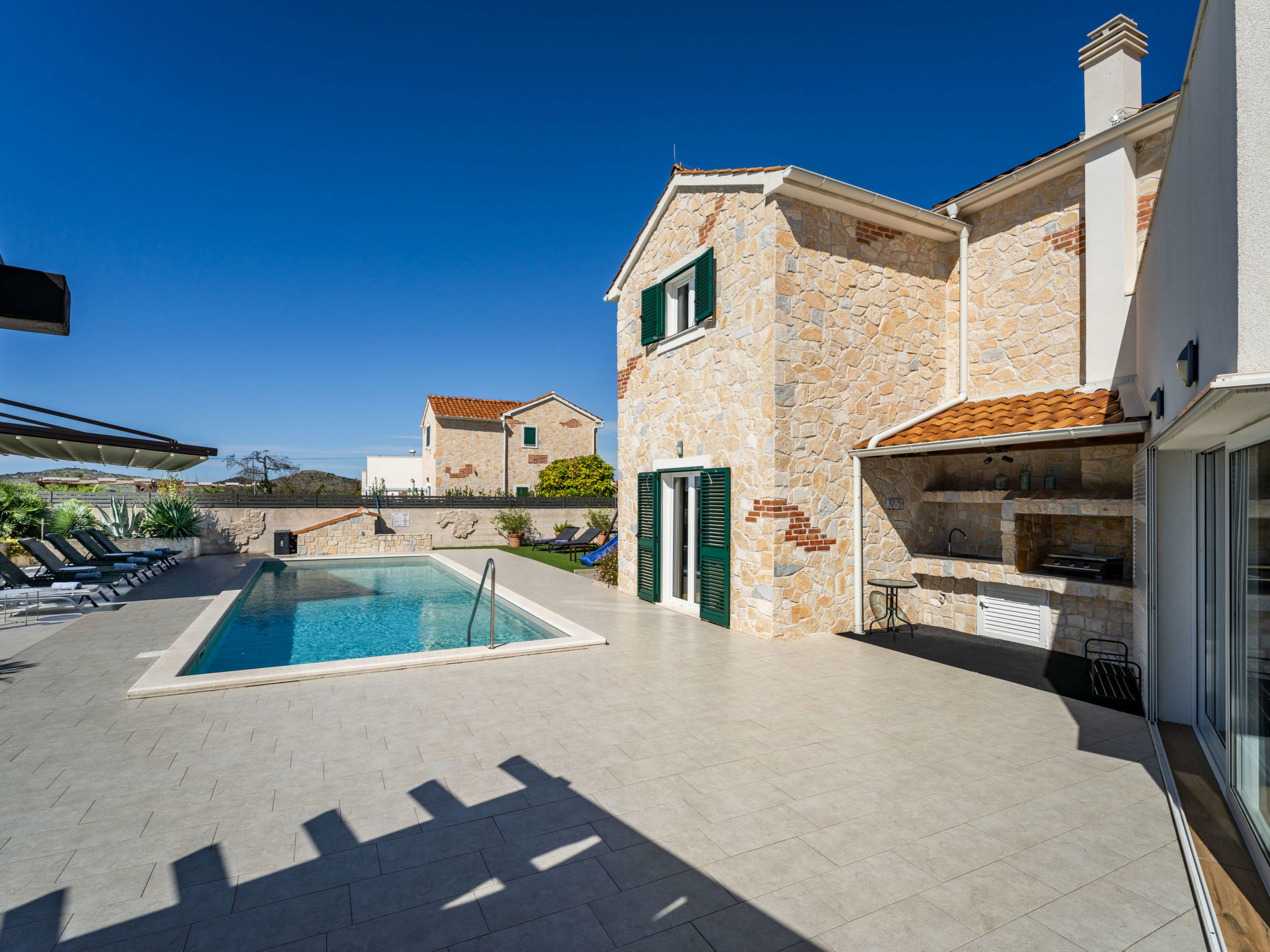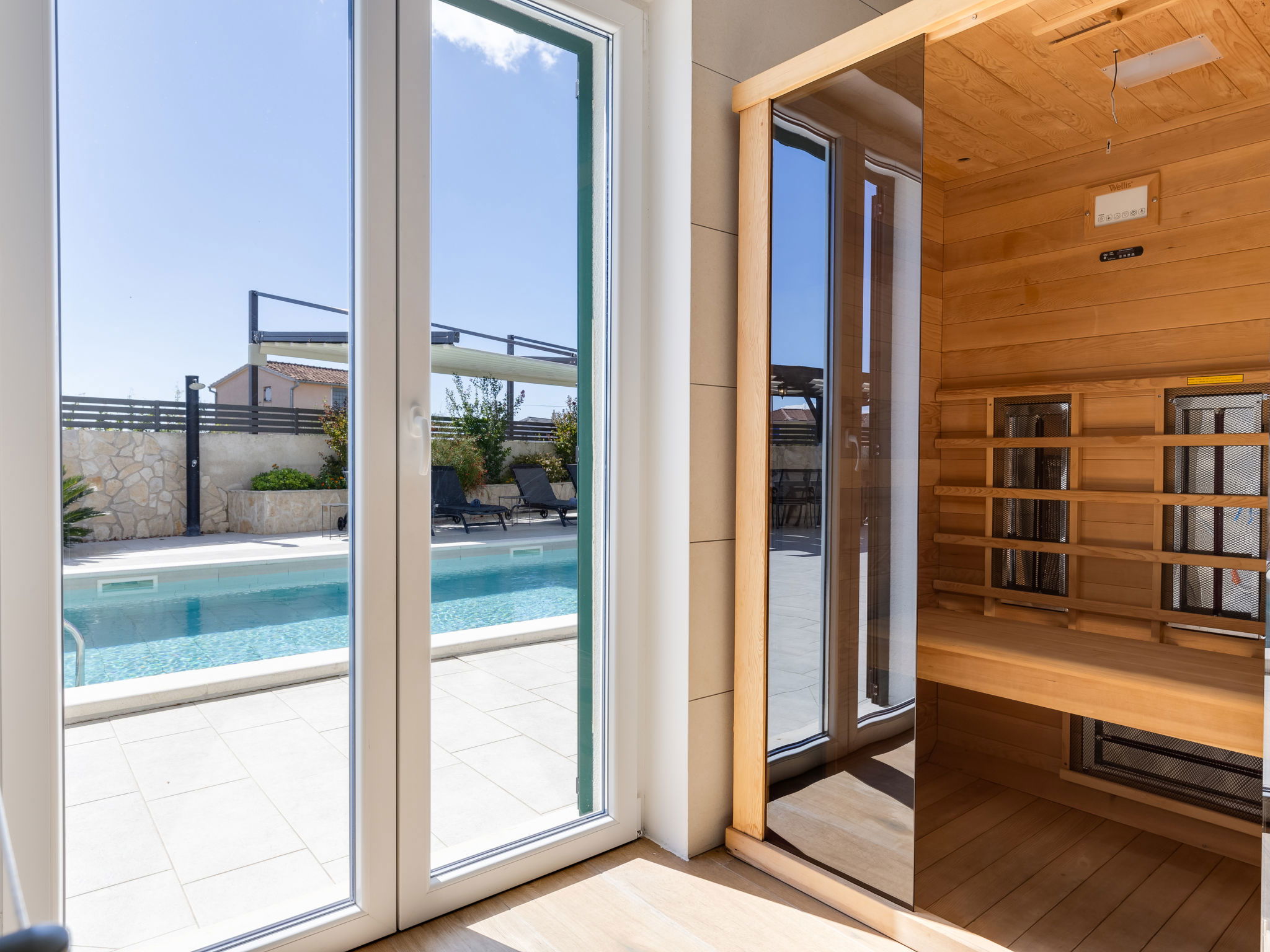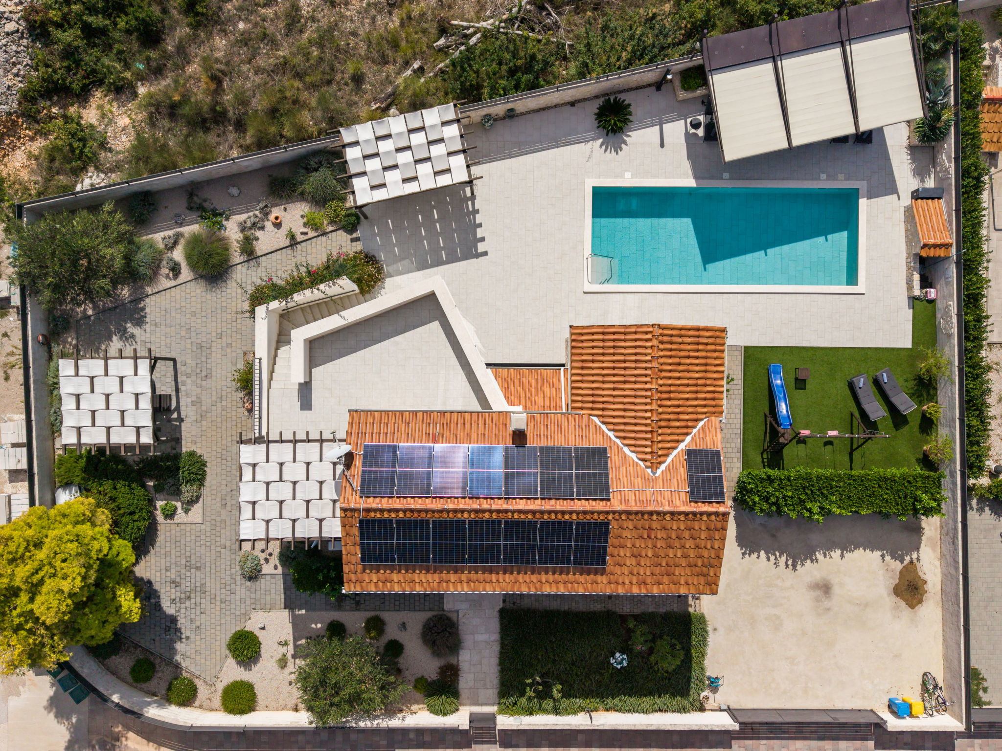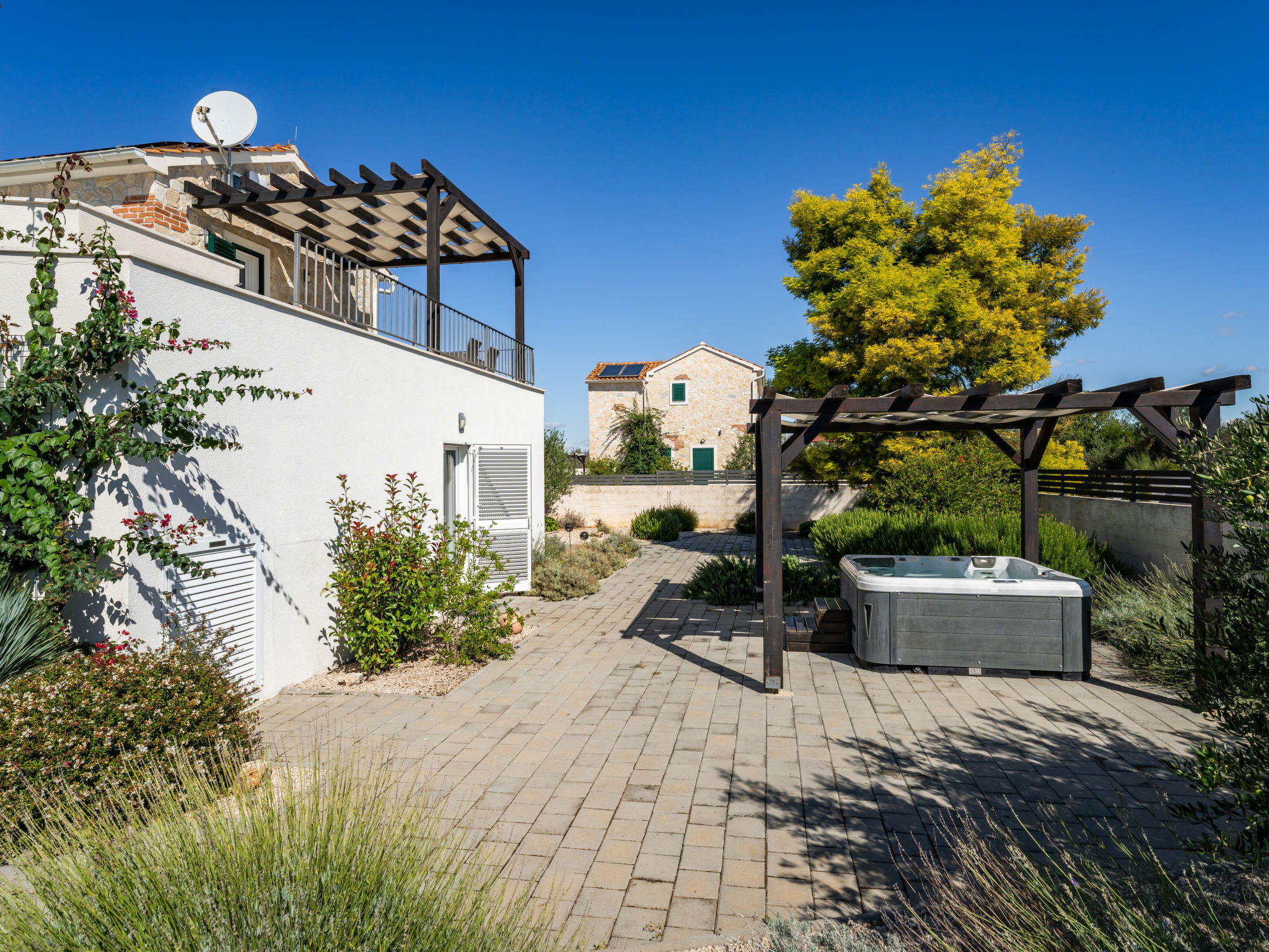 Villa "Carmen", 2 storeys, built in 2018. 1.5 km from the centre of Zaton, in a quiet, sunny position, 1.5 km from the sea, 2.5 km from the beach. Private: property 800 m2 (fenced), swimming pool angular, heated (11 x 4 m, depth 150 cm, seasonal availability: 01.May. - 30.Sep.) with internal staircase. Outdoor shower, hot tub, pergola, terrace (40 m2), garden furniture, barbecue. In the house: internet access, sauna, washing machine, tumble dryer. Parking (for 3 cars) at the house on the premises. Shop 1.5 km, restaurant 1.5 km, bus stop "Zaton/Križ" 500 m, pebble beach 3 km, concrete beach 2.5 km. Nearby attractions: NP Krka 20 km. Hot tub available from 01.04.-31.10.