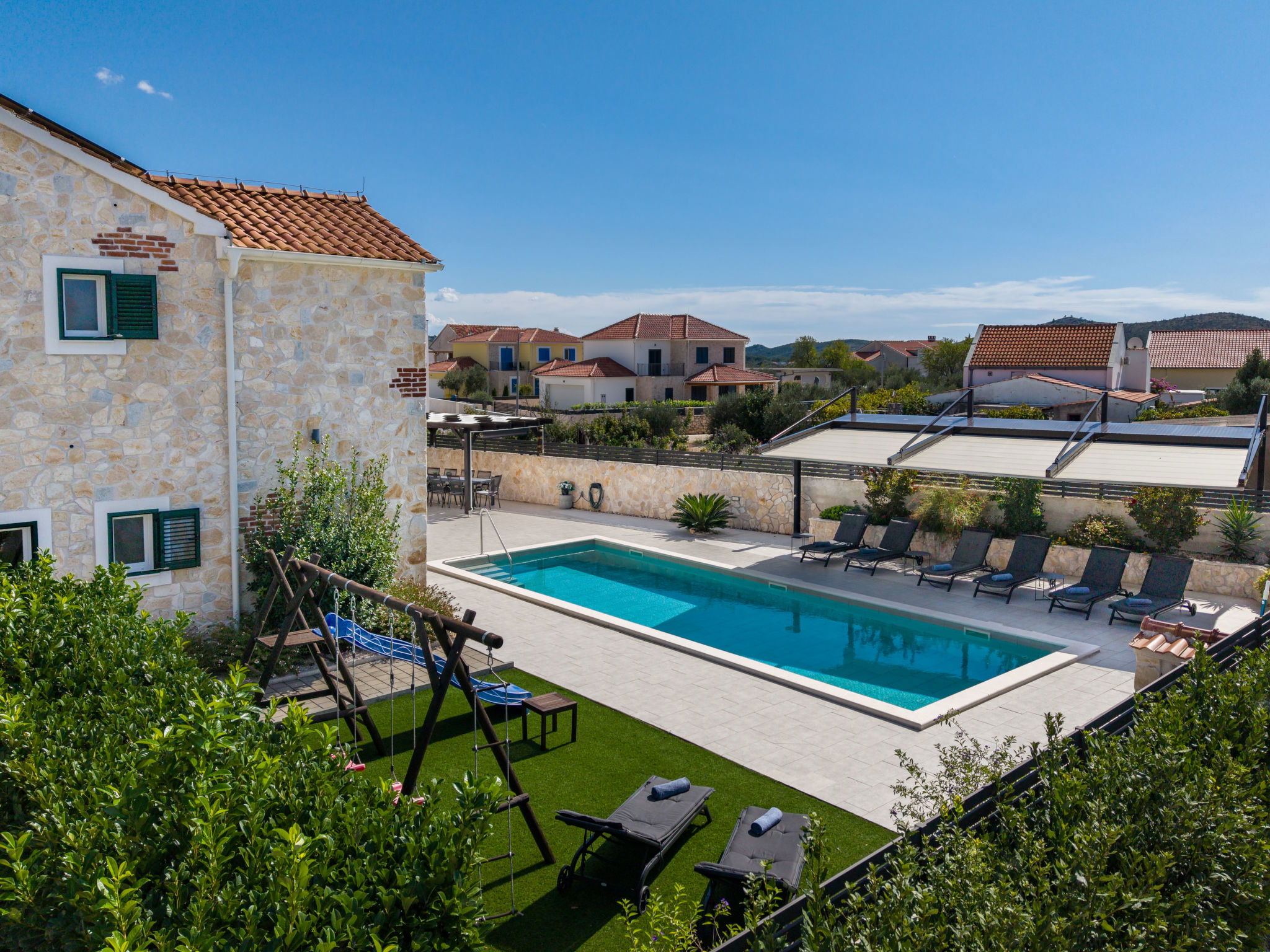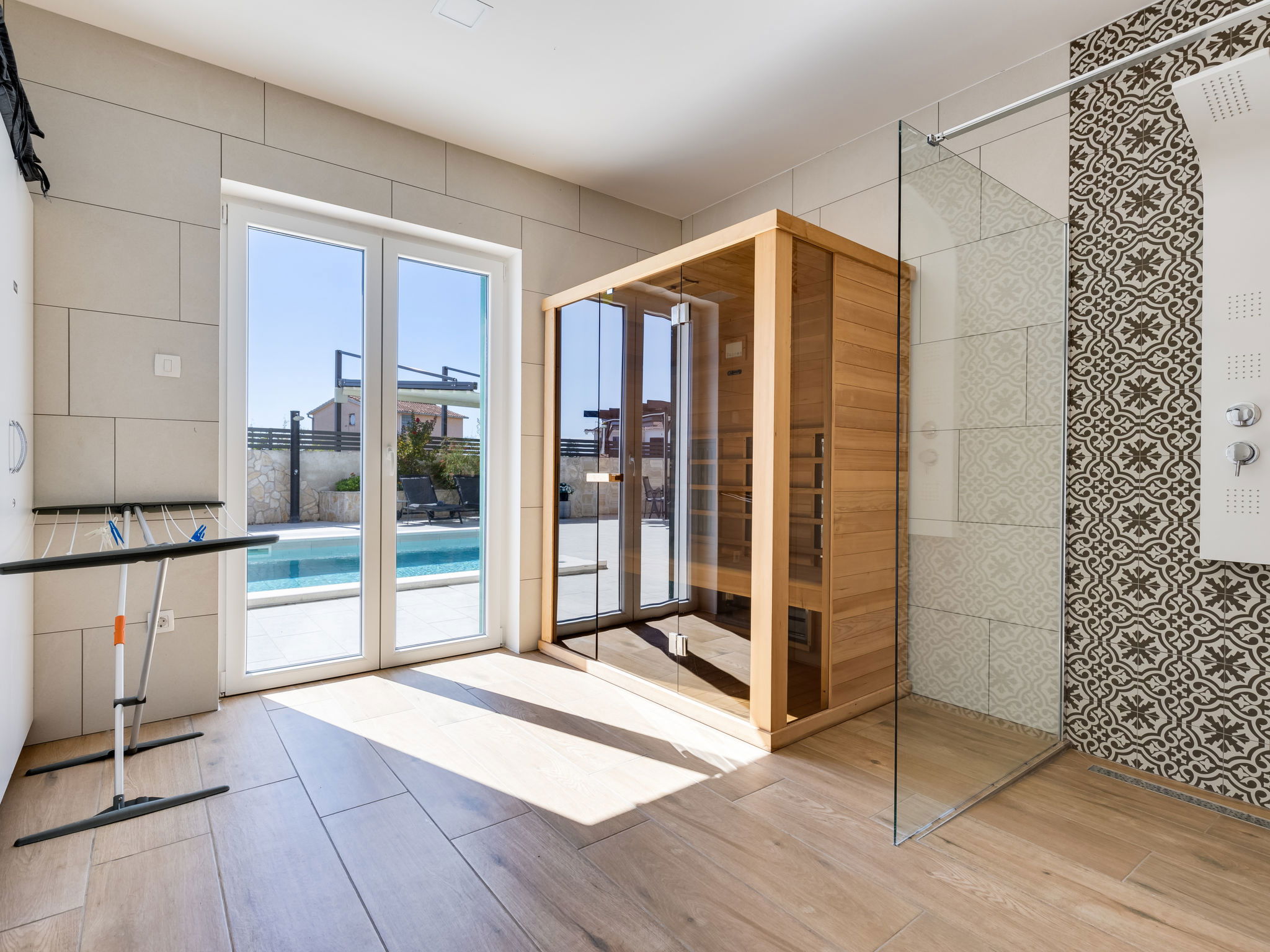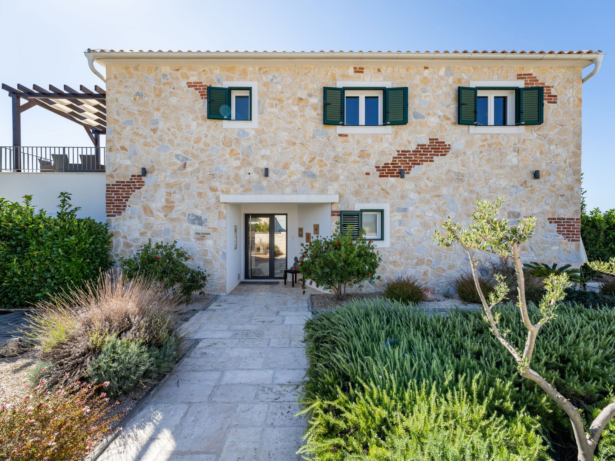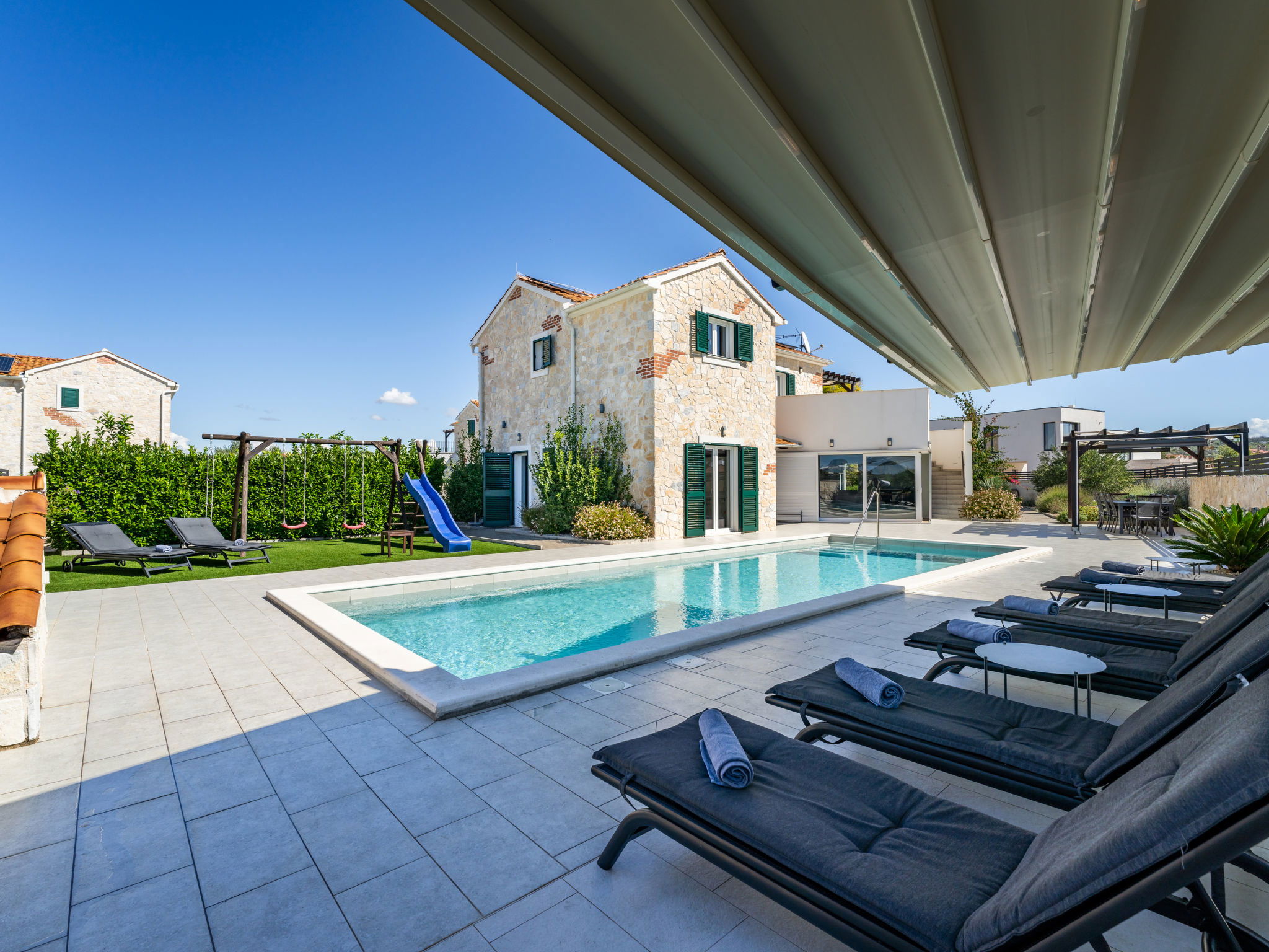 Villa "Carmen", 2 storeys, built in 2018. 1.5 km from the centre of Zaton, in a quiet, sunny position, 1.5 km from the sea, 2.5 km from the beach. Private: property 800 m2 (fenced), swimming pool angular, heated (11 x 4 m, depth 150 cm, seasonal availability: 01.May. - 30.Sep.) with internal staircase. Outdoor shower, hot tub, pergola, terrace (40 m2), garden furniture, barbecue. In the house: internet access, sauna, washing machine, tumble dryer. Parking (for 3 cars) at the house on the premises. Shop 1.5 km, restaurant 1.5 km, bus stop "Zaton/Križ" 500 m, pebble beach 3 km, concrete beach 2.5 km. Nearby attractions: NP Krka 20 km. Hot tub available from 01.04.-31.10.
