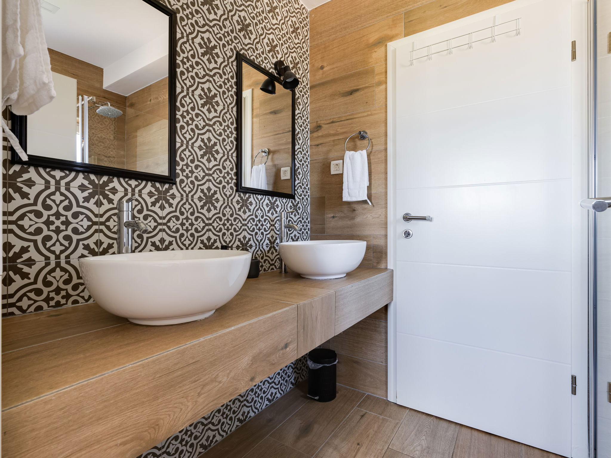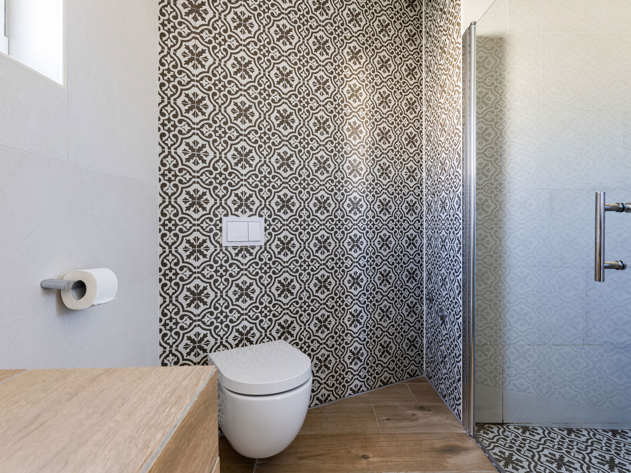 5-room villa 150 m2 on 2 levels, south facing position. Living/dining room 60 m2 with satellite TV (flat screen), air conditioning. Exit to the terrace. 1 room with 1 french bed (160 cm, length 200 cm), shower/WC and satellite TV (flat screen), air conditioning. Open kitchen (oven, dishwasher, 4 ceramic glass hob hotplates, microwave, freezer, electric coffee machine). Sep. WC. Upper floor: 1 room with 1 french bed (160 cm, length 200 cm), shower/WC and satellite TV (flat screen), air conditioning. 2 rooms, each room with 1 french bed (160 cm, length 200 cm), satellite TV (flat screen), air conditioning. Shower/WC. Forced-air heating. Terrace furniture, deck chairs. Facilities: baby cot, hair dryer. Internet (WiFi, free). Please note: non-smoking house. Shower/WC for shared use for 2 bedrooms on the floor, each bedroom with entrance door to shower/WC.