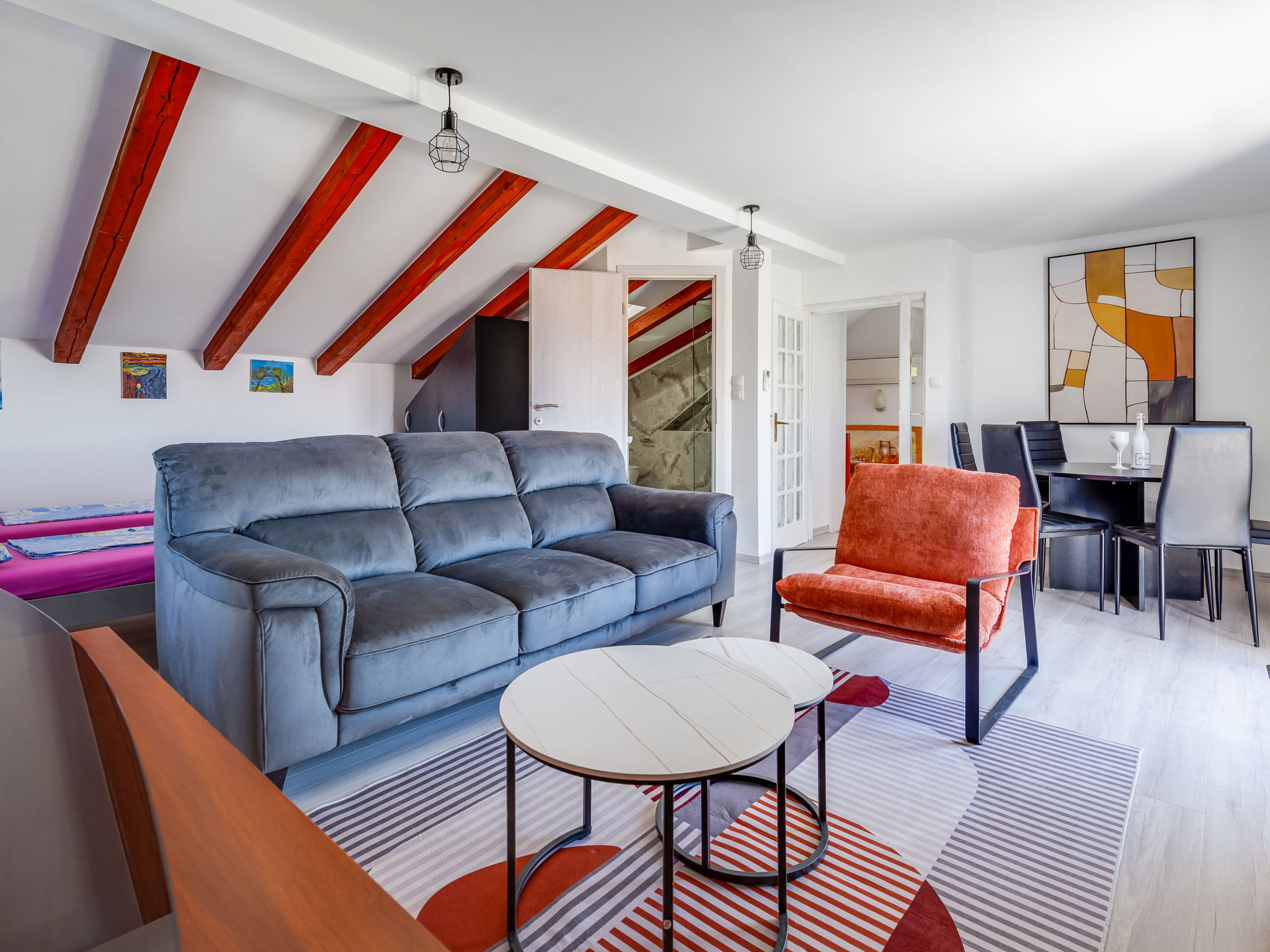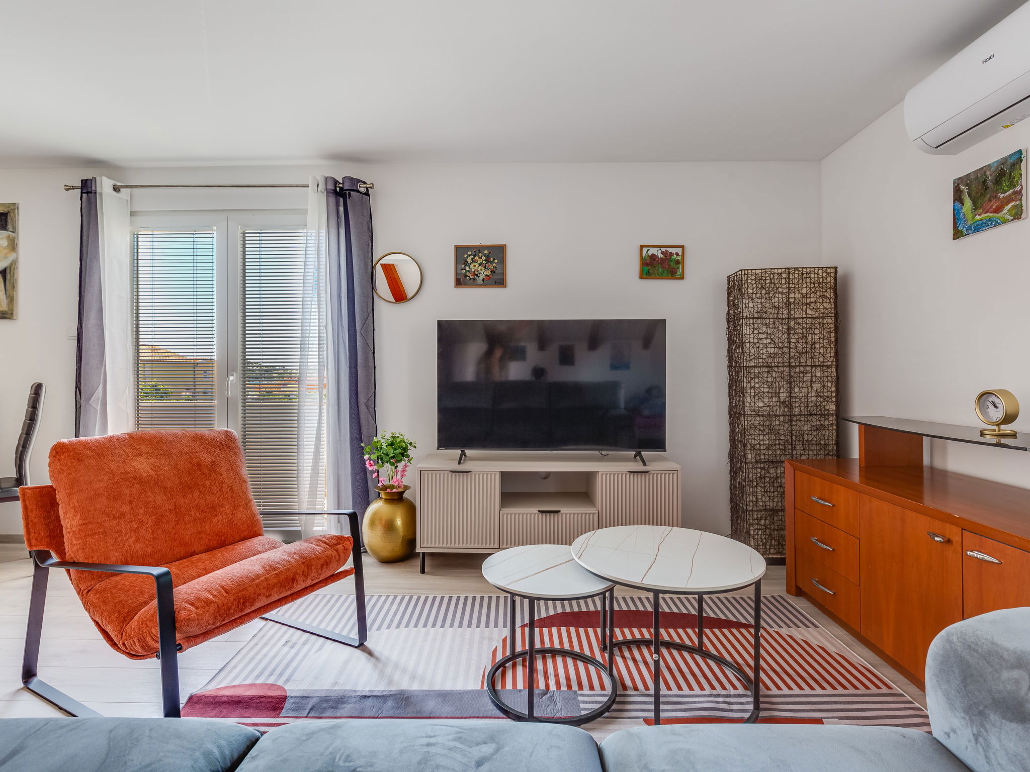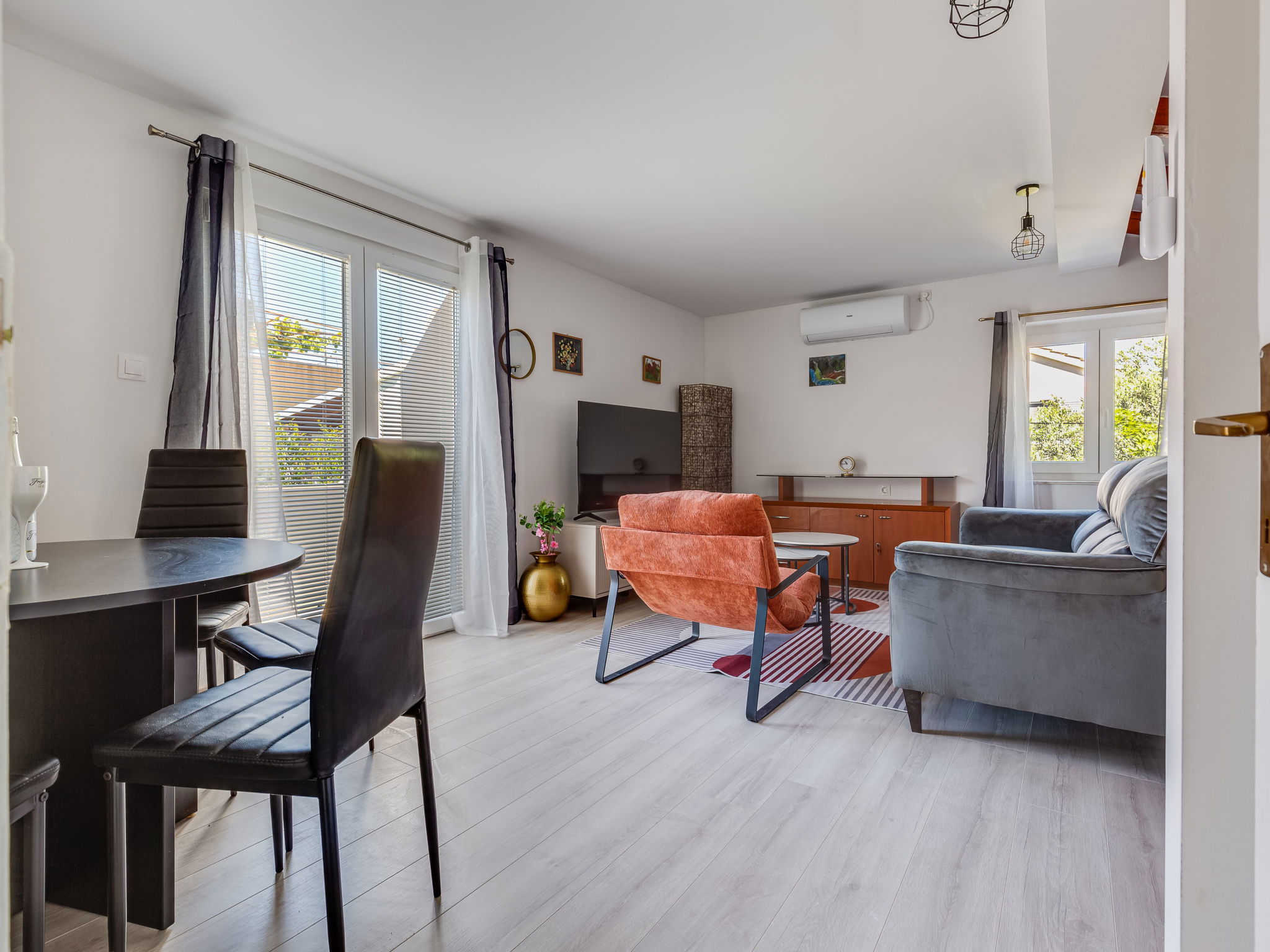 3-room house 80 m2 on 2 levels, south-west facing position. Entrance hall with air conditioning. 2 rooms, each room with 1 french bed (140 cm, length 200 cm). Kitchen (4 hot plates, microwave, freezer, electric coffee machine) with dining table and TV (flat screen). Exit to the terrace. Shower/WC. No heating option. Upper floor: (spiral staircase), 1 room with sloping ceilings, ceiling height 35 - 230 cm with 2 beds (90 cm, length 200 cm), shower/WC. Terrace 9 m2 partly roofed. Terrace furniture. View of the swimming pool. Facilities: Internet (WiFi, free). Maximum 1 pet/ dog allowed.