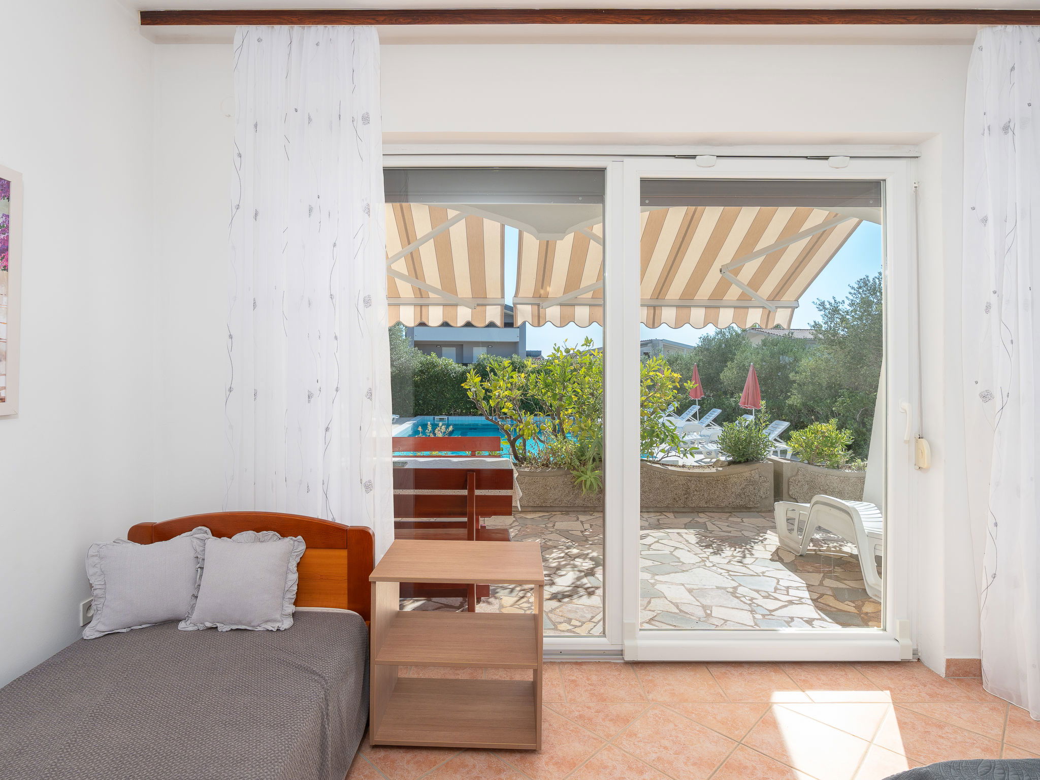 3-room apartment 70 m2, on the ground floor. Beautiful and cosy furnishings: living/dining room 20 m2 with satellite TV. Entrance hall with air conditioning. 1 room with 1 bed and 1 double bed. Exit to the terrace. 1 room with 2 beds. Exit to the terrace. Open kitchen (4 hot plates, oven). Shower/WC. Heating, air-conditioning (extra). No heating option. Terrace 20 m2 partly roofed, south facing position terrace 10 m2. Terrace furniture. View of the swimming pool and the garden. Facilities: Internet (WiFi, free). Maximum 1 pet/ dog allowed.