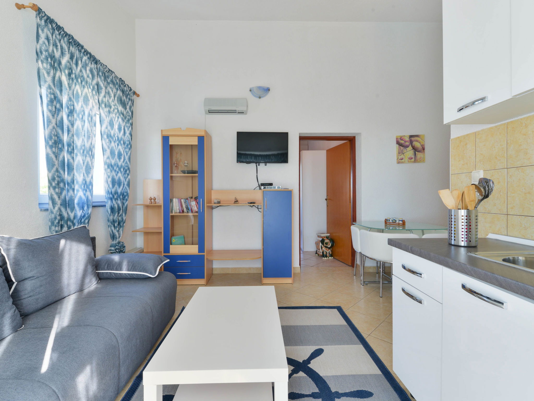 "Jadran", 2-room apartment 40 m2 on 2nd floor. Living/dining room with 1 double sofabed, satellite TV and air conditioning. Exit to the balcony. 1 room with 1 french bed (180 cm, length 200 cm). Exit to the balcony. Small, open kitchen (2 induction hot plates, toaster, kettle, microwave, freezer, electric coffee machine). Shower/WC. No heating option. Balcony 8 m2. Balcony furniture. View of the sea. Facilities: washing machine. Internet (WiFi, free). Please note: non-smoking house. Maximum 1 pet/ dog allowed.