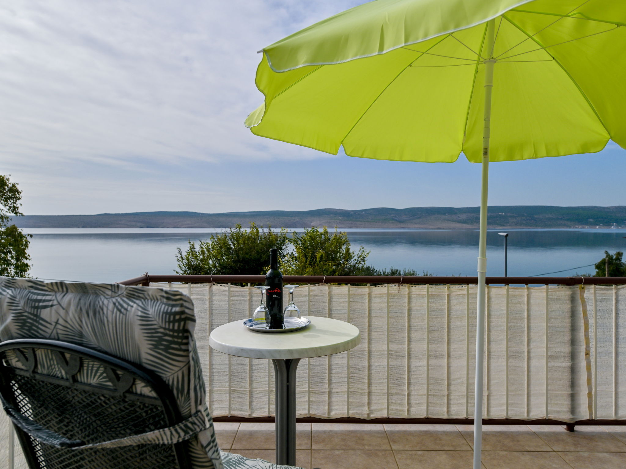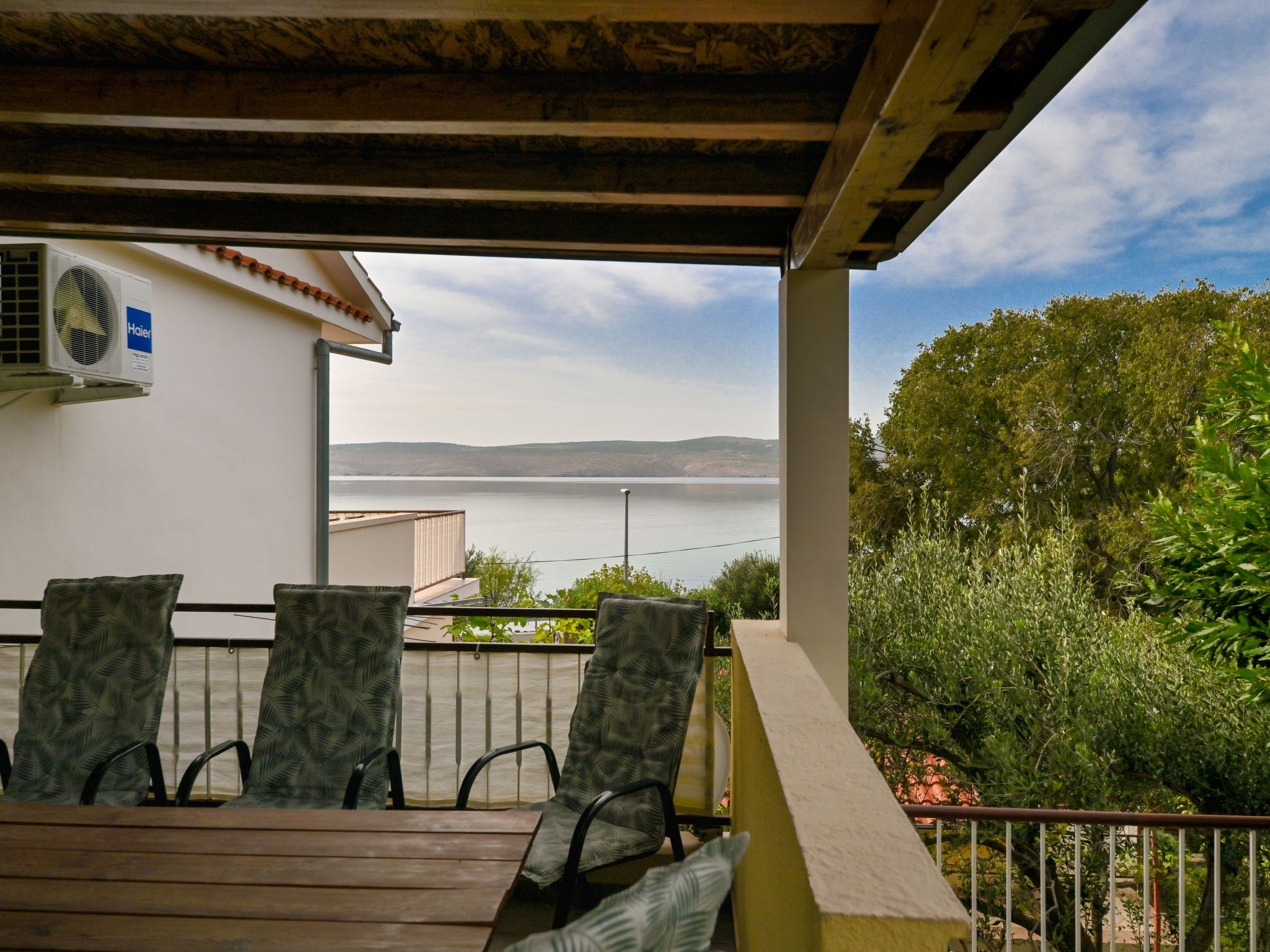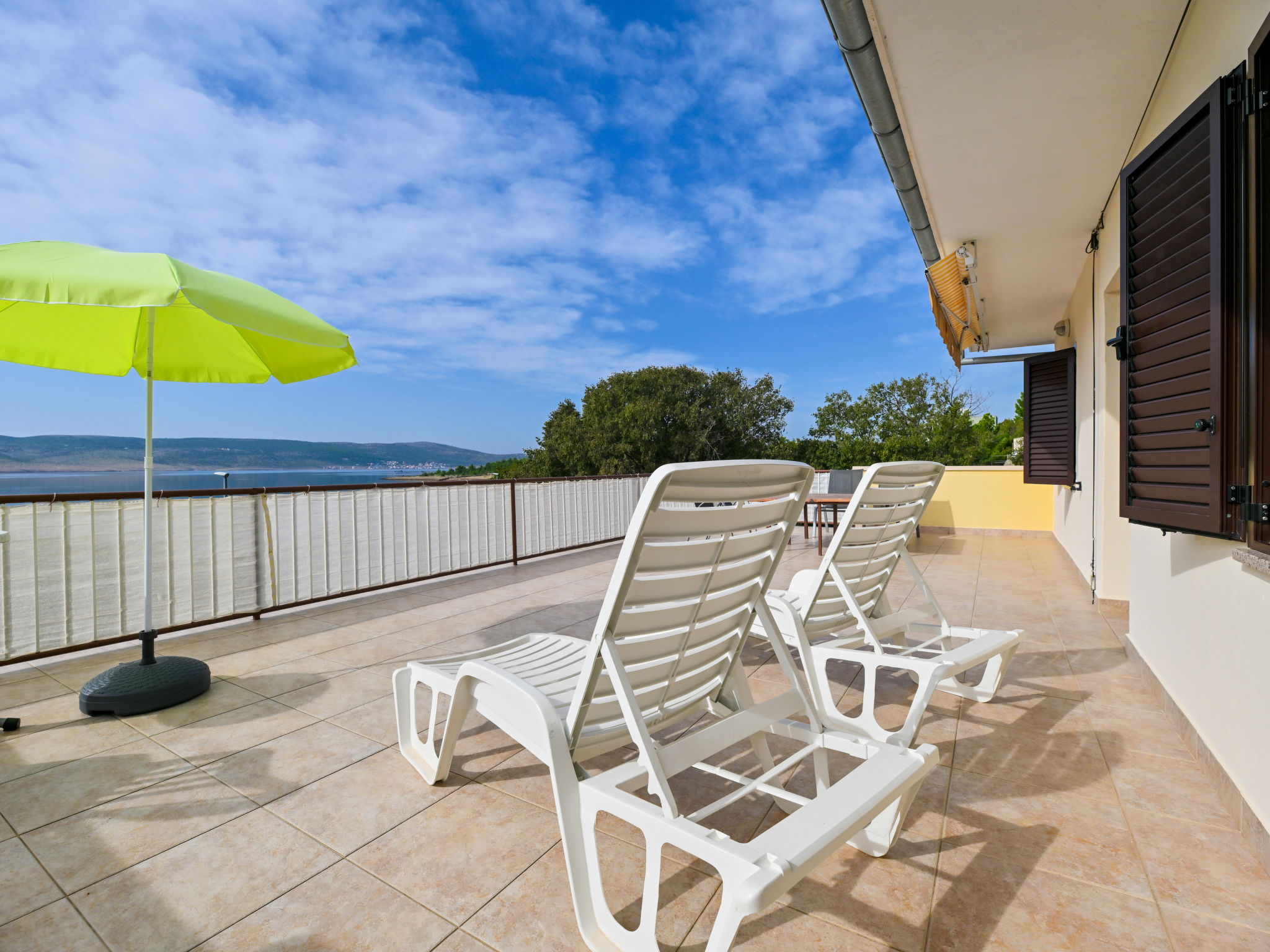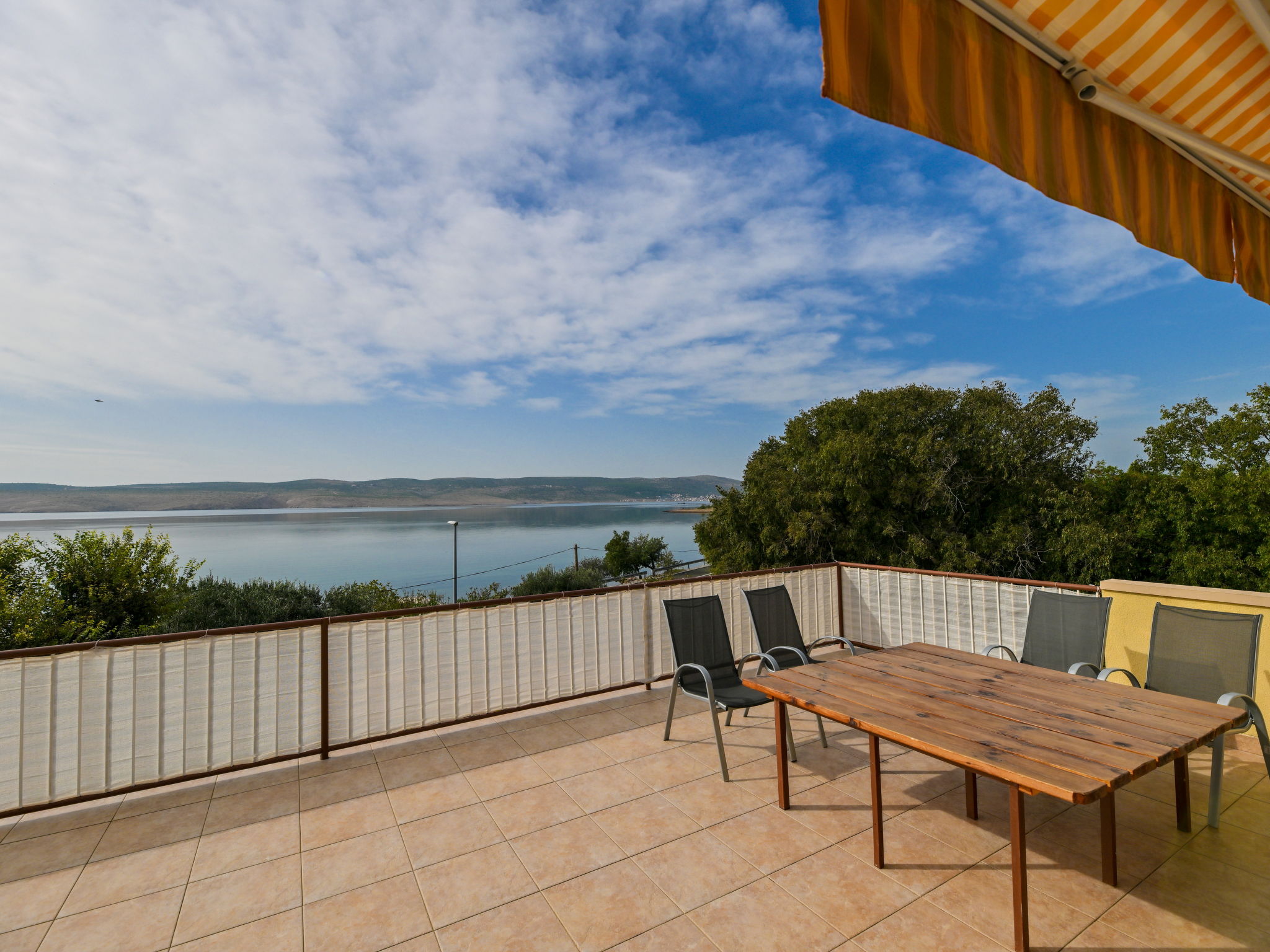 3-room apartment 70 m2 on 1st floor. Living room with 1 double sofabed (160 cm, length 200 cm), air conditioning. 1 room with 2 beds (90 cm, length 200 cm). 1 room with 1 bed (90 cm, length 200 cm), 1 french bed (180 cm, length 200 cm), air conditioning. Kitchen (1 hot plate, oven, 3 gas rings, toaster, kettle, freezer). Exit to the terrace. Bathroom, sep. WC. Air-conditioning. No heating option. Balcony 10 m2, terrace 13 m2, roofed, terrace 48 m2 partly roofed. Terrace furniture, balcony furniture, barbecue (portable), deck chairs (2). Beautiful panoramic view of the sea. Facilities: washing machine, hair dryer. Internet (WiFi, free). Maximum 1 pet/ dog allowed.