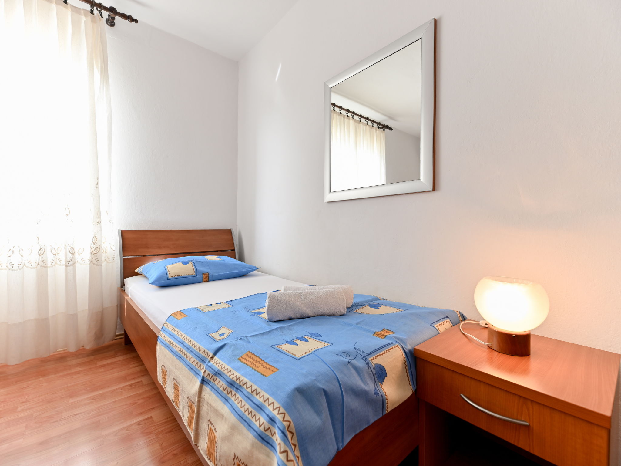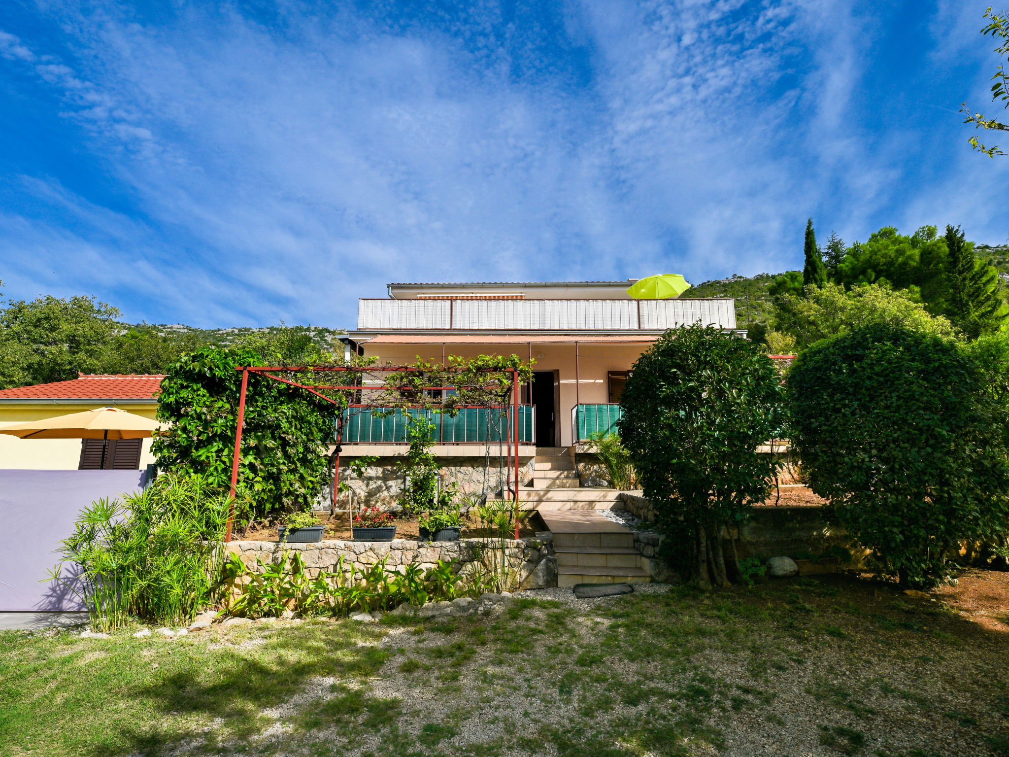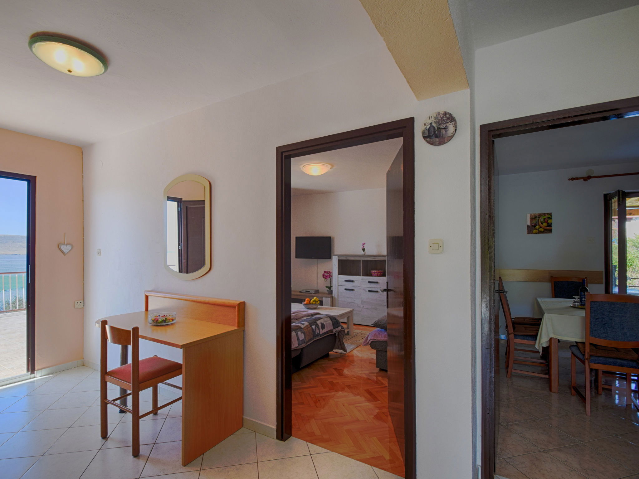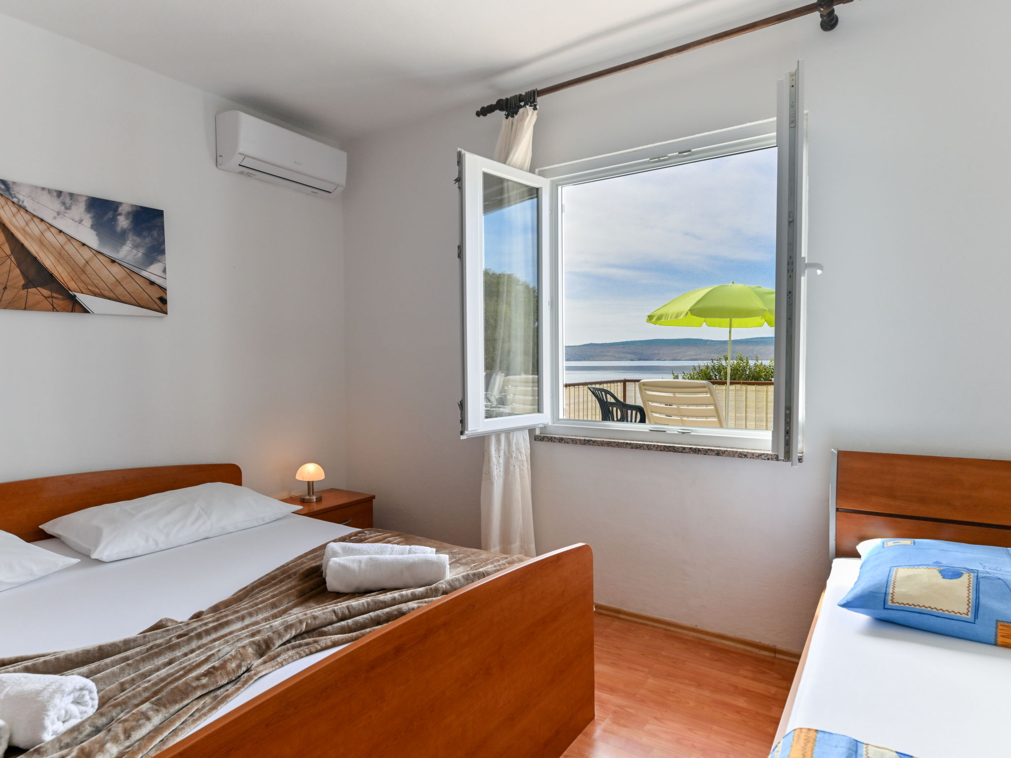 3-room apartment 70 m2 on 1st floor. Living room with 1 double sofabed (160 cm, length 200 cm), air conditioning. 1 room with 2 beds (90 cm, length 200 cm). 1 room with 1 bed (90 cm, length 200 cm), 1 french bed (180 cm, length 200 cm), air conditioning. Kitchen (1 hot plate, oven, 3 gas rings, toaster, kettle, freezer). Exit to the terrace. Bathroom, sep. WC. Air-conditioning. No heating option. Balcony 10 m2, terrace 13 m2, roofed, terrace 48 m2 partly roofed. Terrace furniture, balcony furniture, barbecue (portable), deck chairs (2). Beautiful panoramic view of the sea. Facilities: washing machine, hair dryer. Internet (WiFi, free). Maximum 1 pet/ dog allowed.