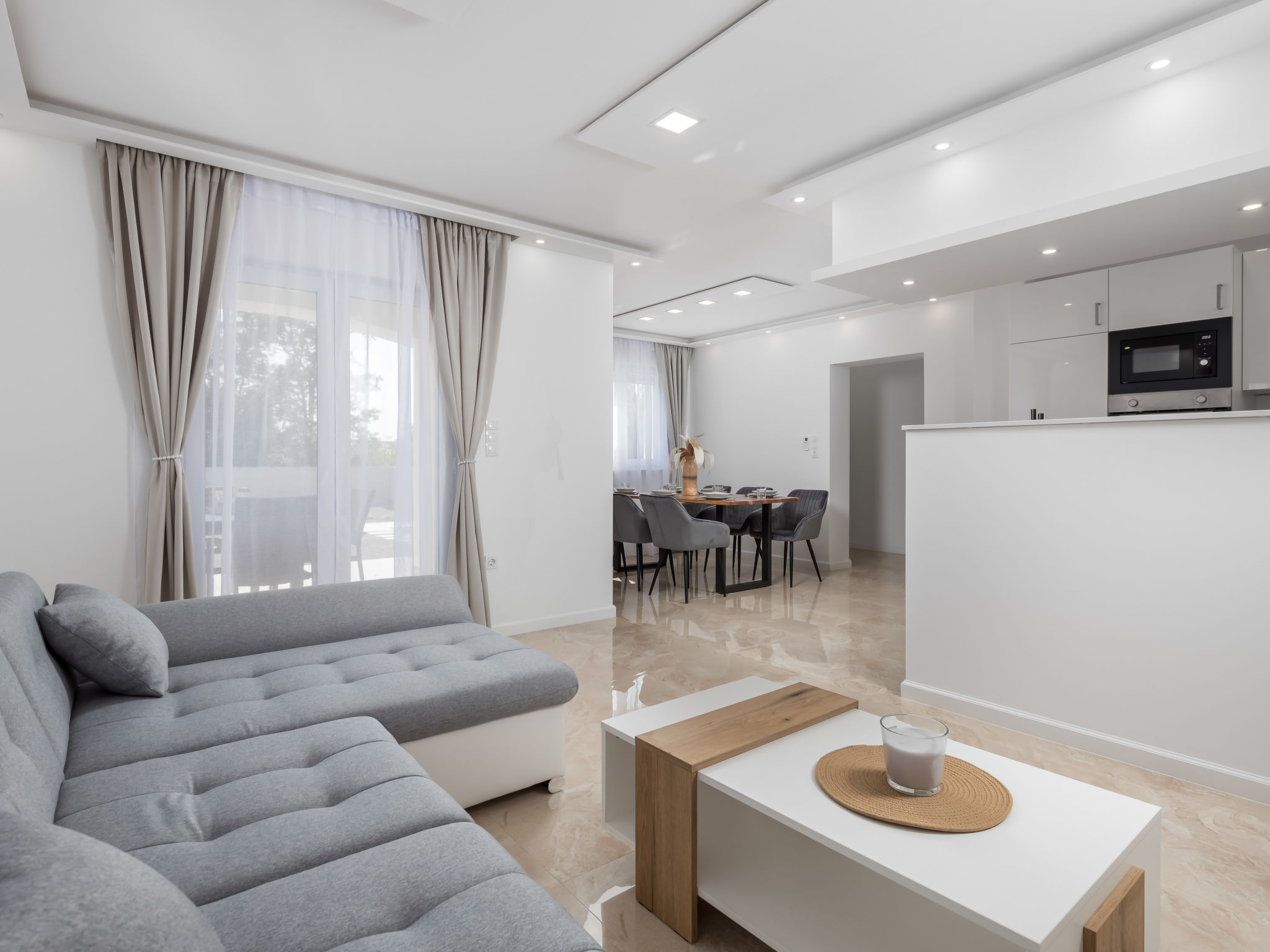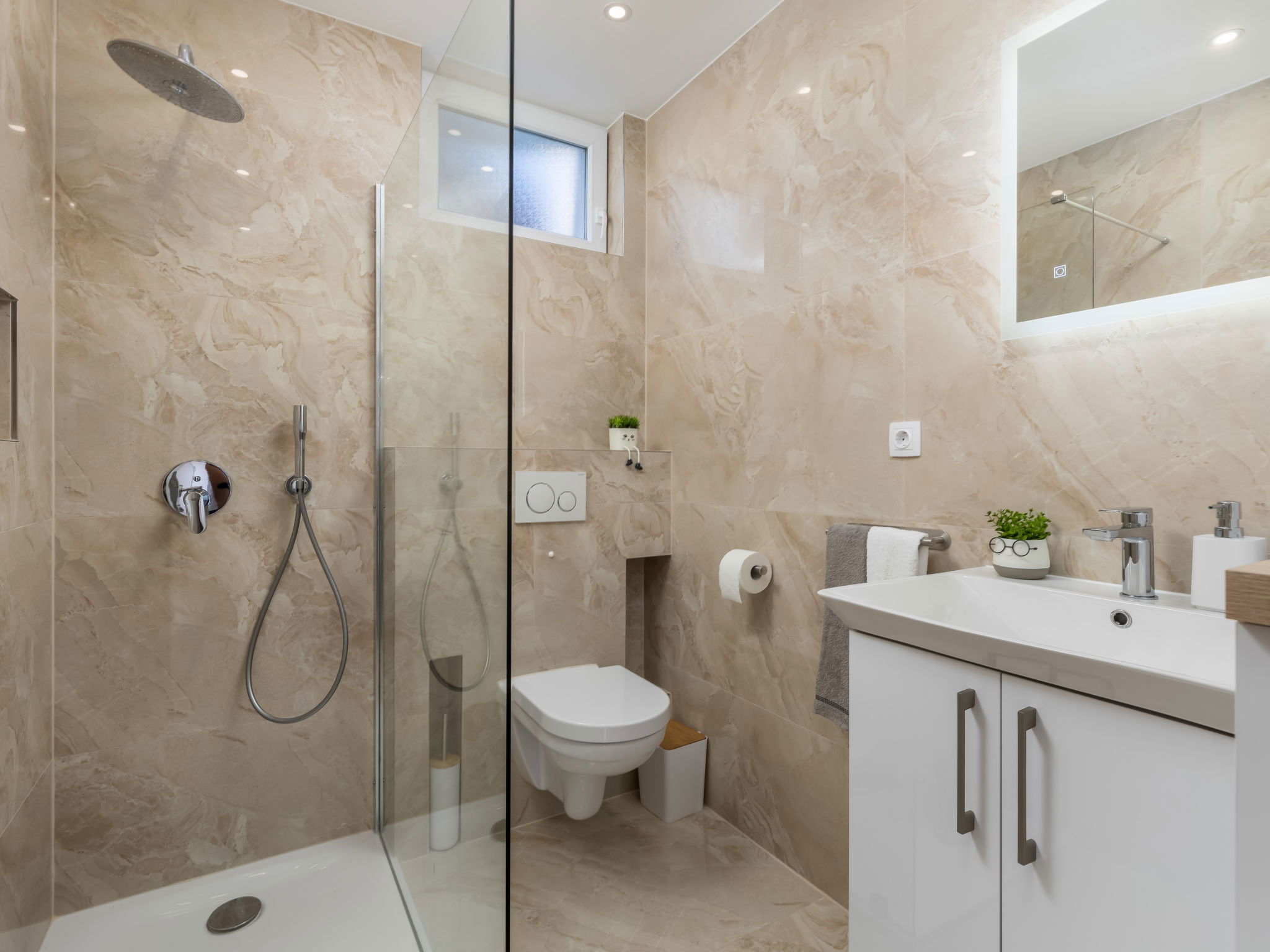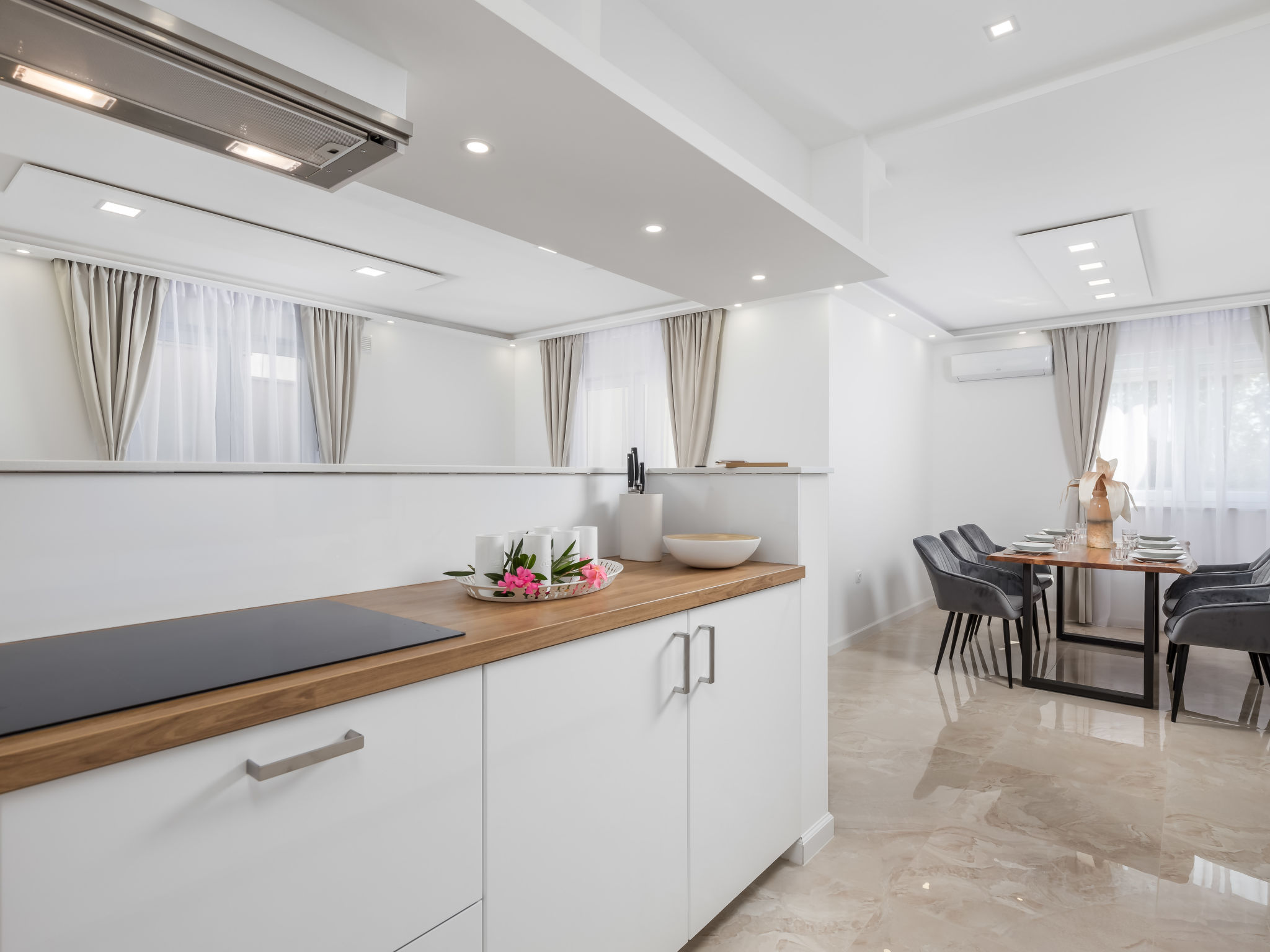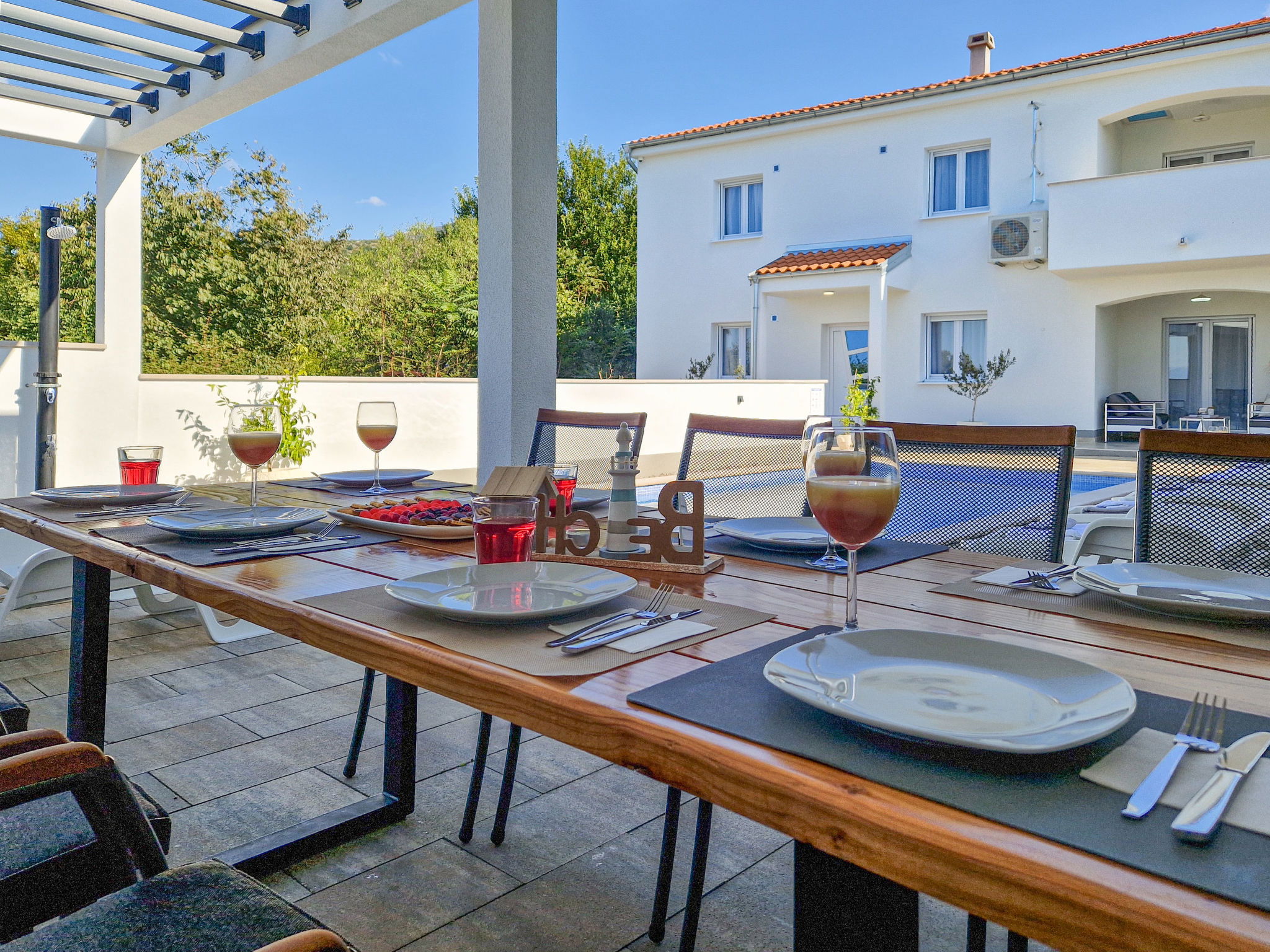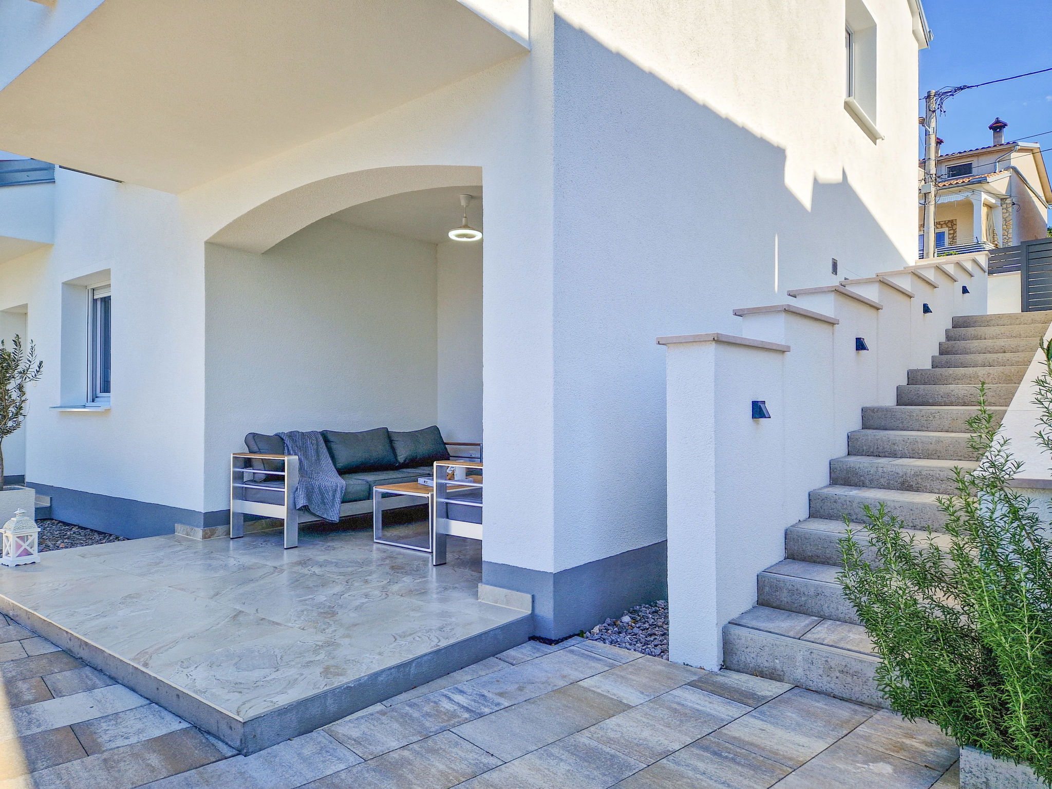 Jadranovo 7 km from Crikvenica: 2-family house "Villa Lea", 2 storeys, built in 2022. 1.5 km from the centre of Jadranovo, 1.8 km from the sea, 1.8 km from the beach. Private: property 500 m2, swimming pool angular, heated (8 x 4 m, depth 145 cm, seasonal availability: 30.Mar. - 30.Oct.) with internal staircase. Outdoor shower, hot tub, pool house with shower and WC, barbecue, pool maintenance by the owner/gardener. In the house: internet access, infrared sauna, washing machine. Parking (for 2 cars) at the house on the premises. Shop, restaurant 800 m, bus stop 1.6 km, pebble beach 1.8 km, concrete beach 1.8 km. Please note: airfield 15 km from the property.