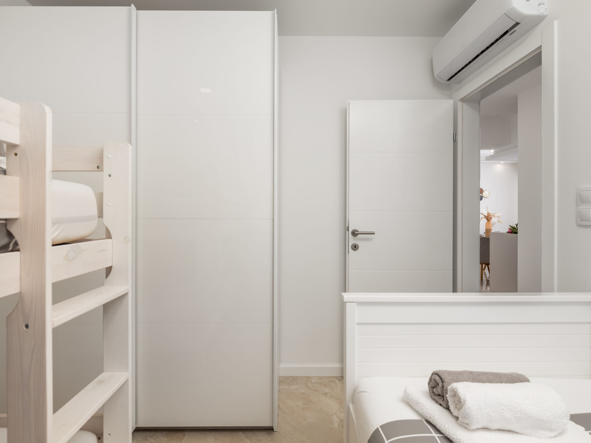 6-room house 175 m2 on 2 levels. Living/dining room with satellite TV and air conditioning. Exit to the terrace. 2 rooms, each room with 1 double bed (2 x 80 cm, length 200 cm), air conditioning. Open kitchen (oven, dishwasher, 4 induction hot plates, toaster, kettle, microwave, electric coffee machine). 2 showers/WC. Upper floor: (exterior staircase) living/dining room with satellite TV and air conditioning. Exit to the terrace. 1 room with 1 double bed (2 x 80 cm, length 200 cm), air conditioning. 1 room, 2 bunk beds (90 cm, length 200 cm). Open kitchen (oven, 4 induction hot plates, toaster, kettle, microwave, electric coffee machine). 2 showers/WC. 2 terraces 13 m2. Terrace furniture, barbecue (portable), deck chairs. Partial view of the sea. Facilities: baby cot (extra), hair dryer. Internet (WiFi, free).