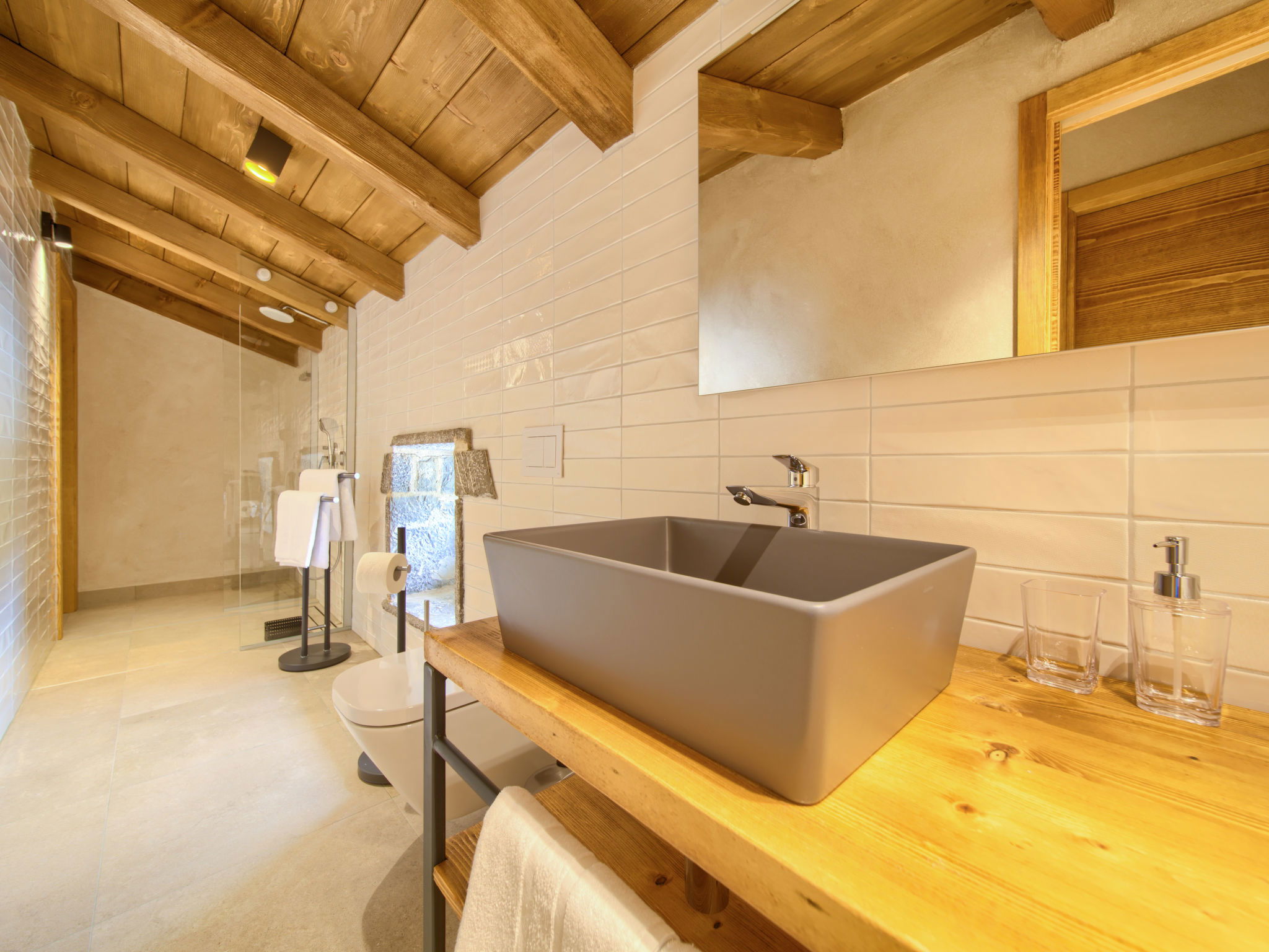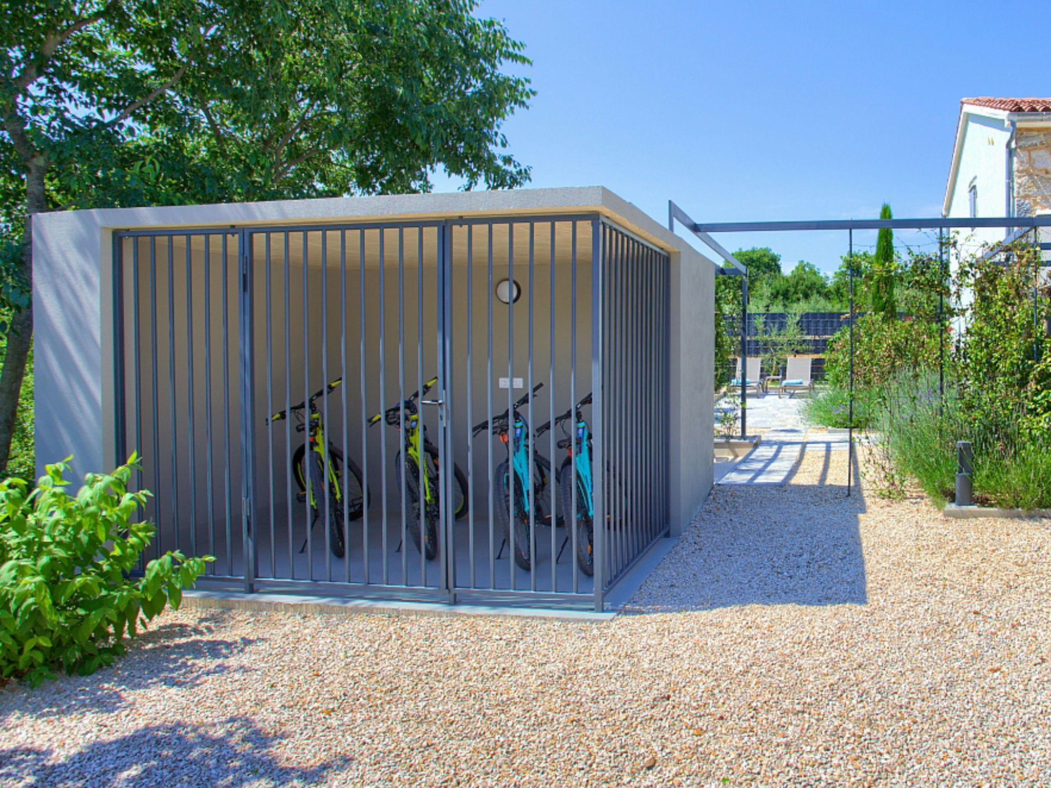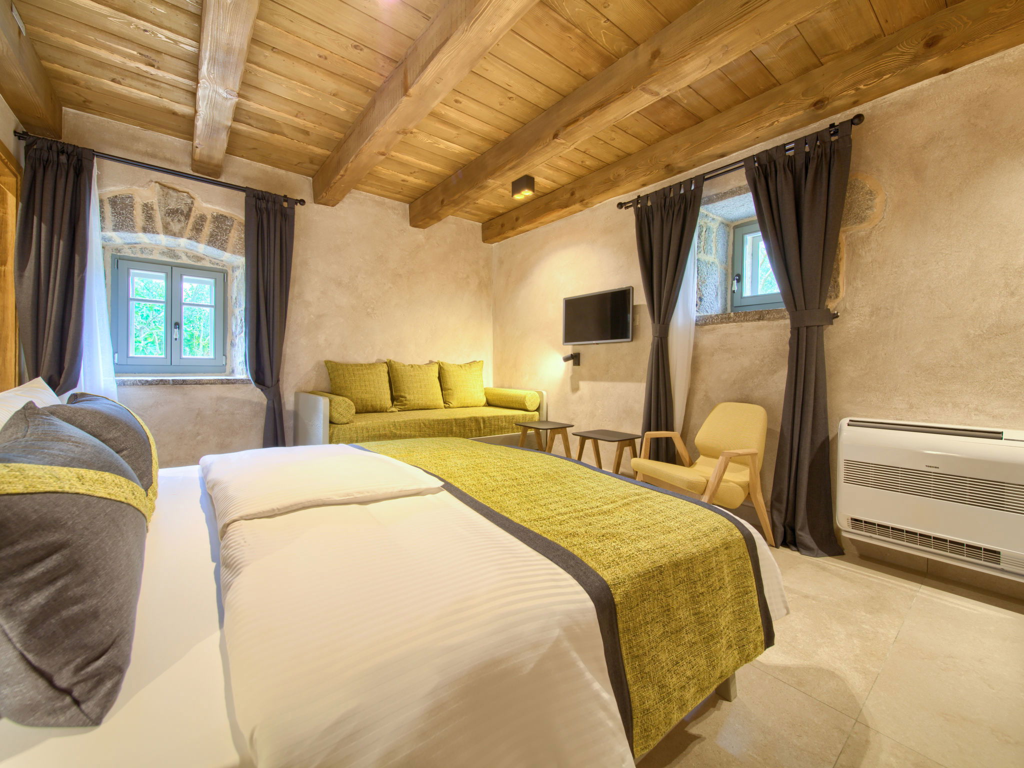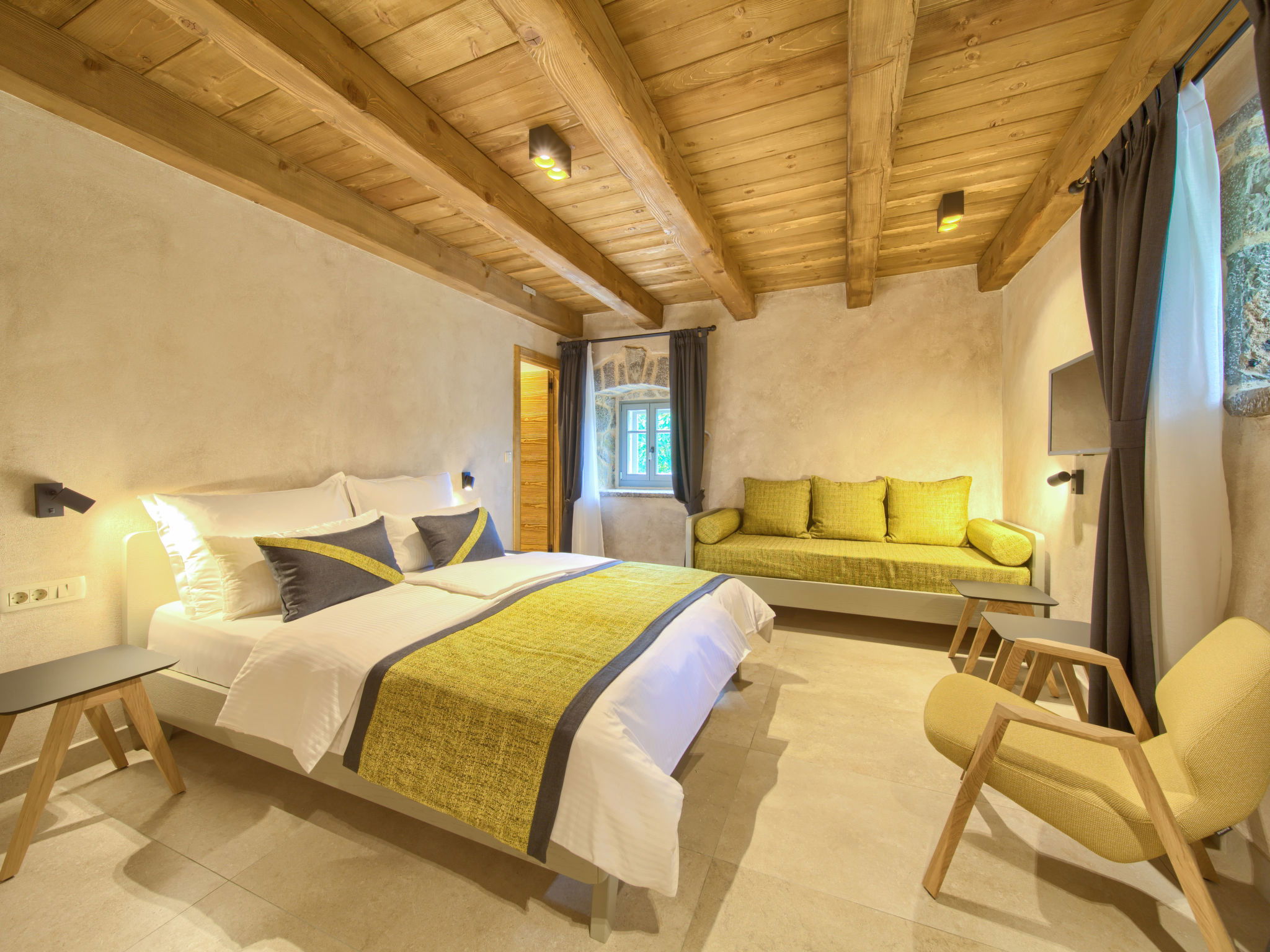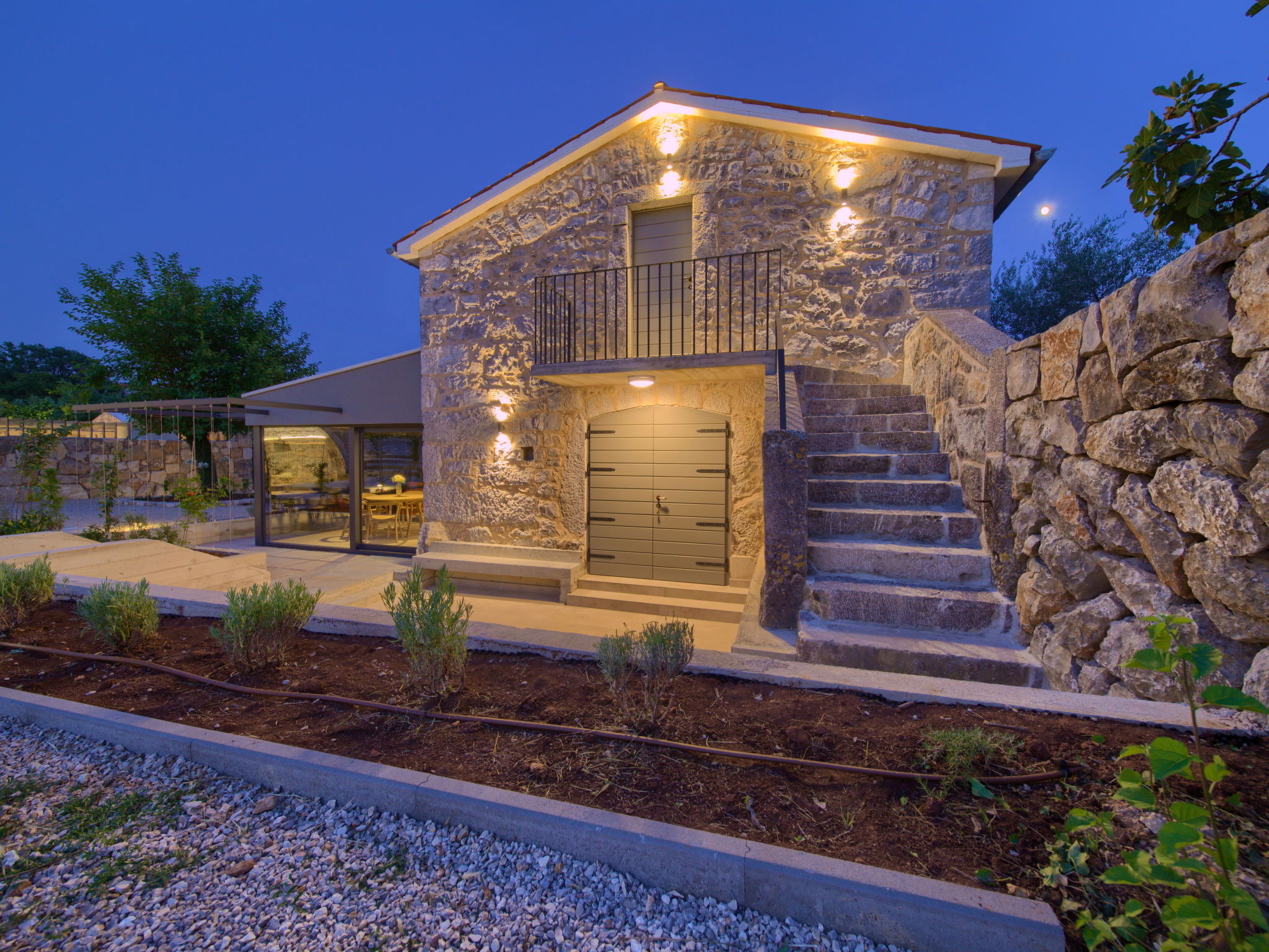 Rustic, comfortable single-family house "Jerini Estate", 3 storeys. In the hamlet Bajčići 10 km from the centre of Krk, in a quiet, sunny position, 5.5 km from the sea, in the countryside. Private: property 2'500 m2, wildlife garden and trees, swimming pool angular, heated (10 x 5 m, depth 145 cm, seasonal availability: 01.Jan. - 31.Dec.) with internal staircase and salt-electrolysis pool-cleaning system. Shower/WC in the pool area, outdoor shower, hot tub, terrace (140 m2), garden furniture, barbecue, pool maintenance by the owner/gardener. In the house: internet access, sauna, fitness room, spa area, air conditioning, washing machine, tumble dryer. Parking (for 3 cars) at the house on the premises. Bus stop 400 m, pebble beach 6 km. The owner does not accept any youth groups. Please note: airfield 22 km from the property. Private: swimming pool (17 m2, depth 145 cm, seasonal availability: 01.May. - 31.Oct.) with internal staircase and salt-electrolysis pool-cleaning system. The unit consists of 2 houses rented as one unit. Washing machine, tumble dryer situated in a separate, small house.