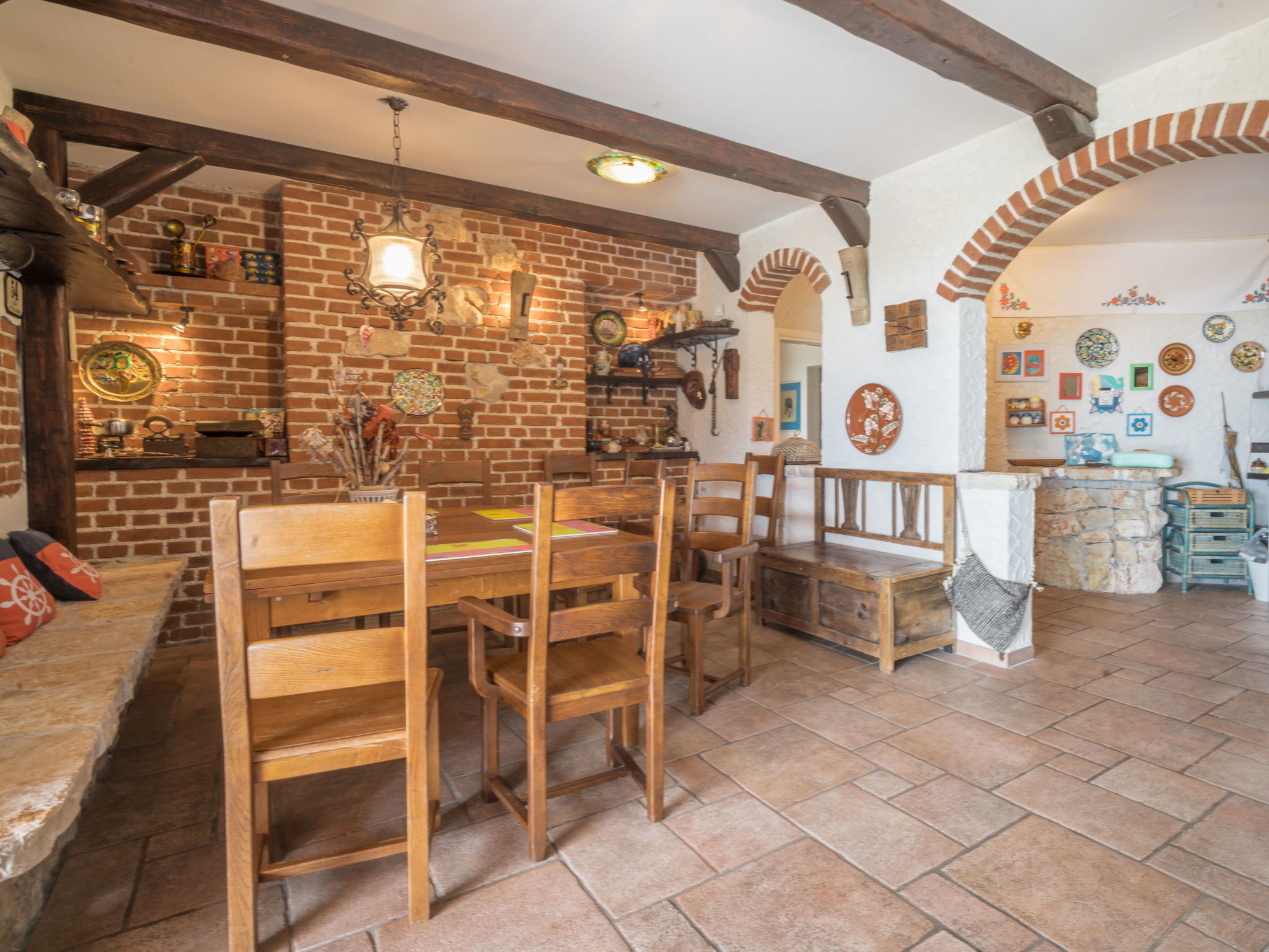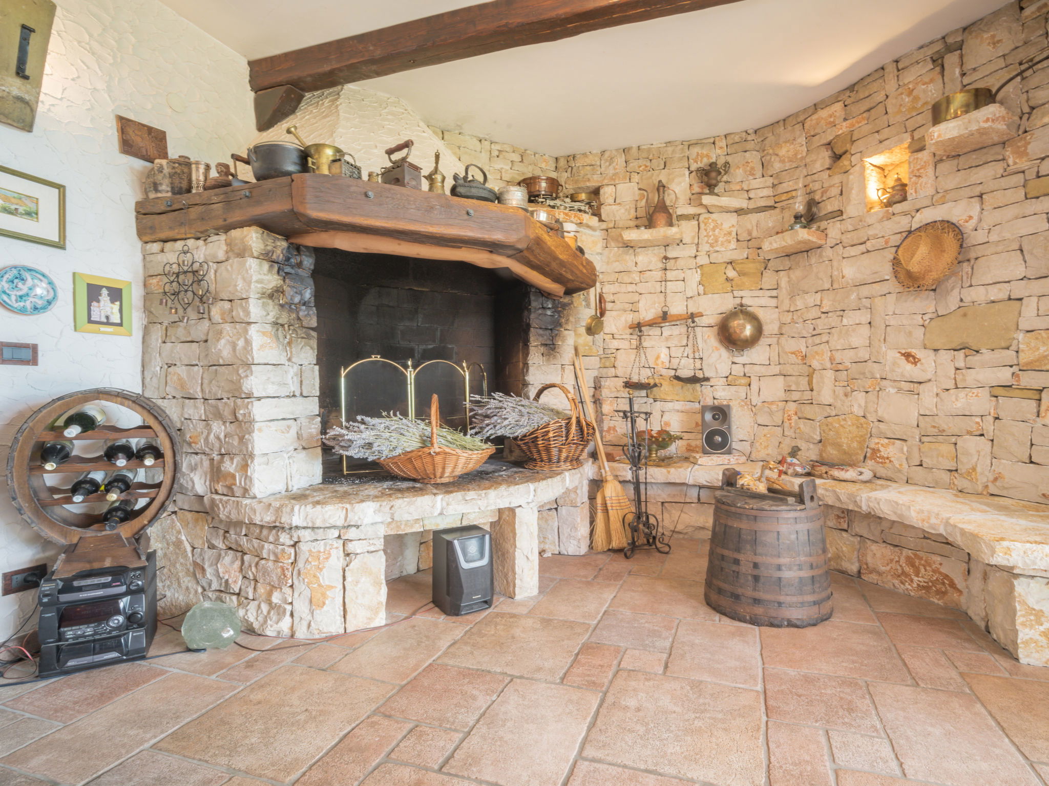6-room villa 350 m2 on 3 levels, south-west facing position. Tasteful furnishings: living/dining room 75 m2 with open-hearth fireplace (only for decoration), cable TV (flat screen), DVD. Exit to the terrace. Office. Open kitchen (oven, dishwasher, 4 ceramic glass hob hotplates, freezer, electric coffee machine). Sep. WC. On the lower ground floor: dining room with open-hearth fireplace (only for decoration), kitchen corner. Exit to the terrace, to the swimming pool. 1 large room 34 m2 with 1 double sofabed (150 cm, length 220 cm), shower. Sep. WC. Upper floor: 1 room 30 m2 with 1 french bed (160 cm, length 200 cm), shower and double hand-basin. Exit to the terrace. 1 room 23 m2 with 1 french bed (140 cm, length 200 cm), shower. Exit to the terrace. 1 room 18 m2 with 2 beds (90 cm, length 200 cm), shower/WC and hydro massage shower. Exit to the balcony. Sep. WC. Underfloor heating (extra). Balcony 7 m2, terrace 38 m2 partly roofed, terrace 20 m2 partly roofed. Terrace furniture, deck chairs. Marvellous view of the sea and the bay. Facilities: iron. Internet (WiFi, free). Garage (2 cars). Maximum 1 pet/ dog allowed. The dining room on the ground floor is arranged as a tavern. Ur.broj:2170-03-03/2-15-3