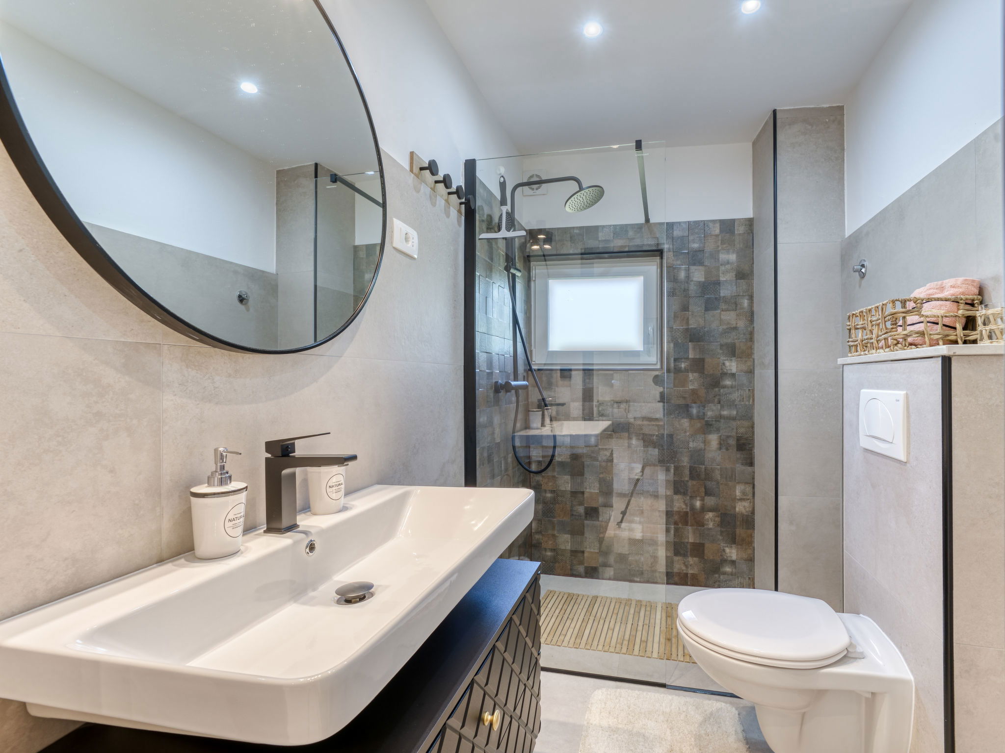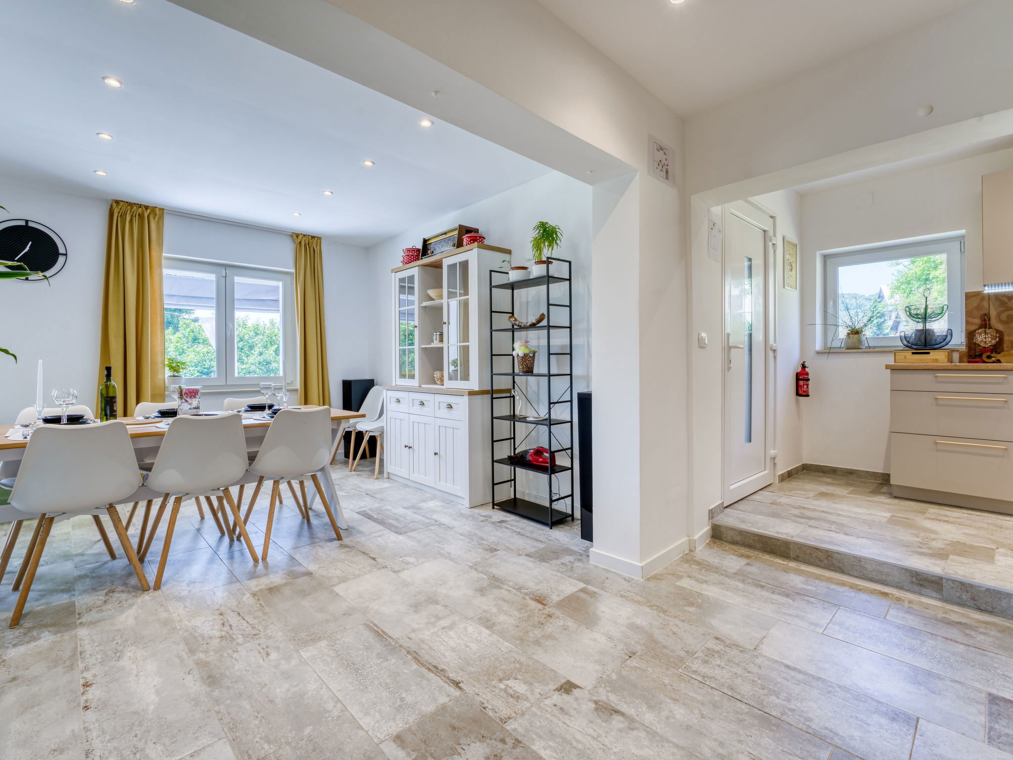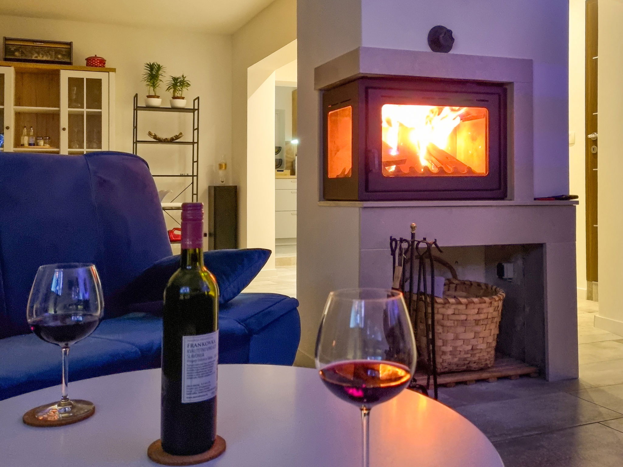 4-room house 150 m2 on 3 levels. Living/dining room with open-hearth fireplace, cable TV and air conditioning. Exit to the terrace. Open kitchen (oven, dishwasher, 4 induction hot plates, toaster, kettle, freezer, electric coffee machine). Shower/WC. Upper floor: entrance hall with air conditioning. 2 rooms, each room with 1 french bed (160 cm, length 200 cm), cable TV. Exit to the balcony. 1 room, without wardrobe with 2 beds (90 cm, length 200 cm), cable TV. Shower/WC. Floor heating, forced-air heating. Balcony 7 m2, terrace 80 m2 partly roofed. Terrace furniture, balcony furniture. View of the countryside and the forest. Facilities: safe, hair dryer, logs (free). Internet (WiFi, free). Please note: suitable for families. Non-smoking house. Maximum 2 pets/ dogs allowed.