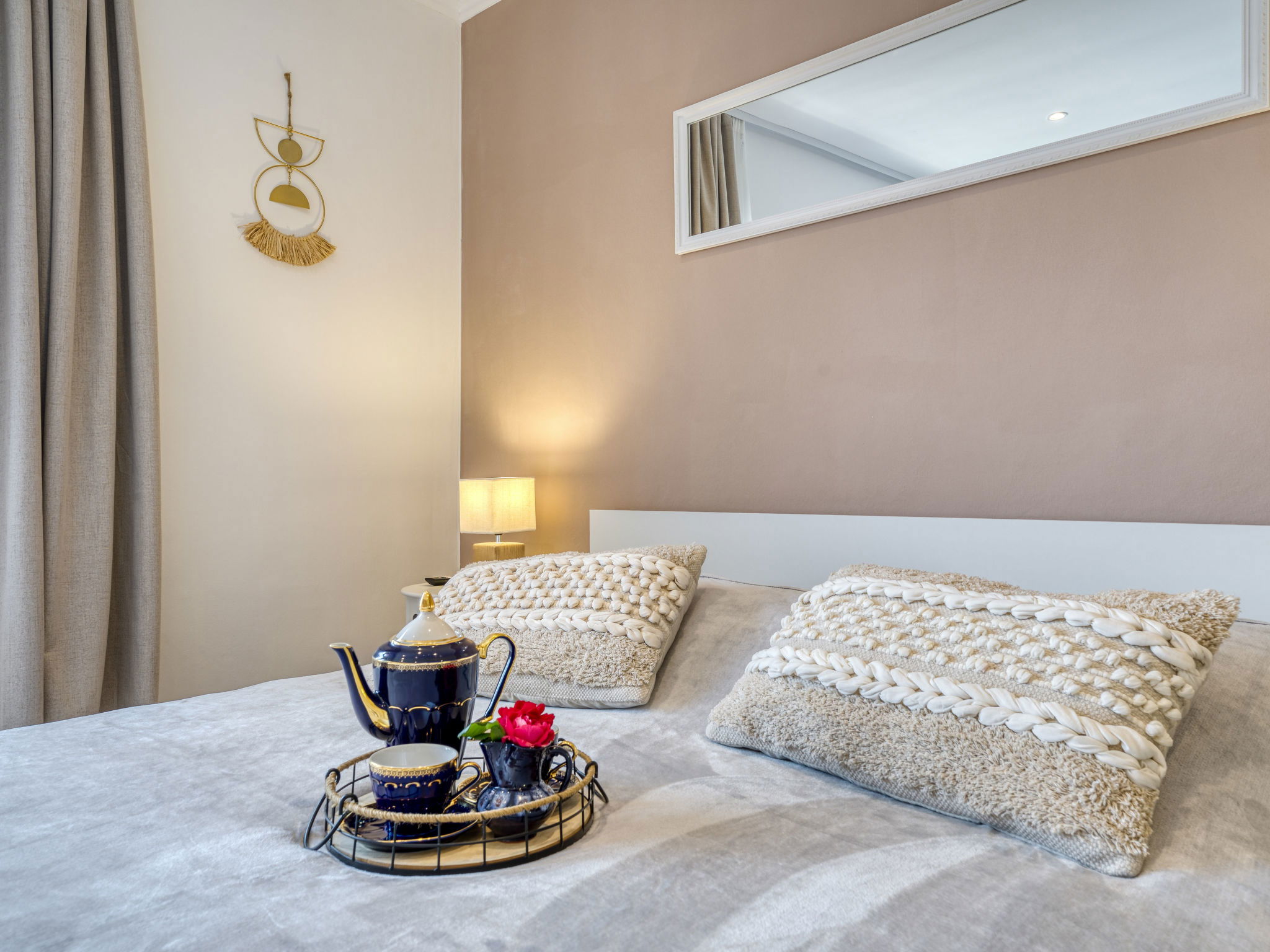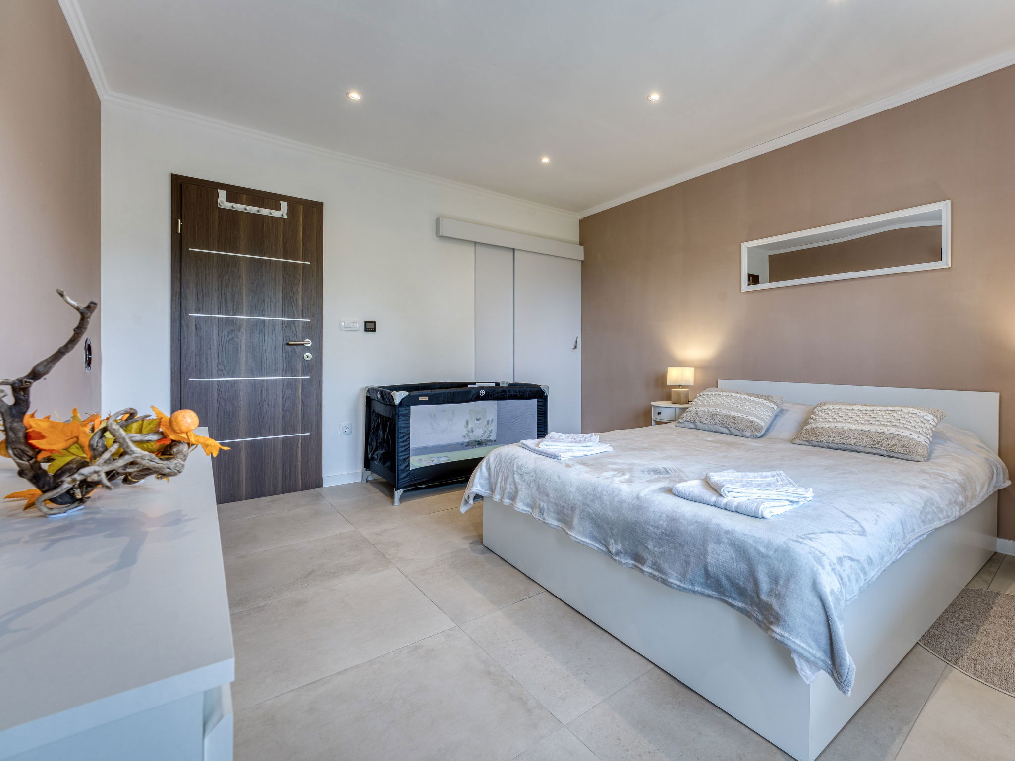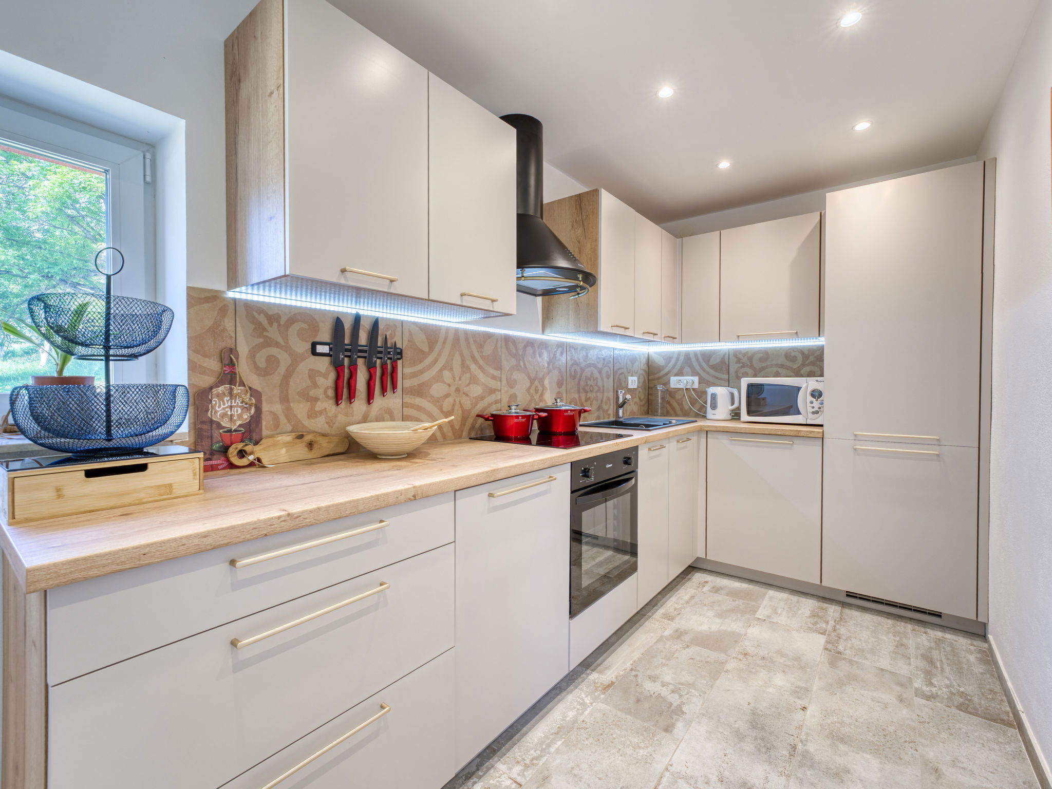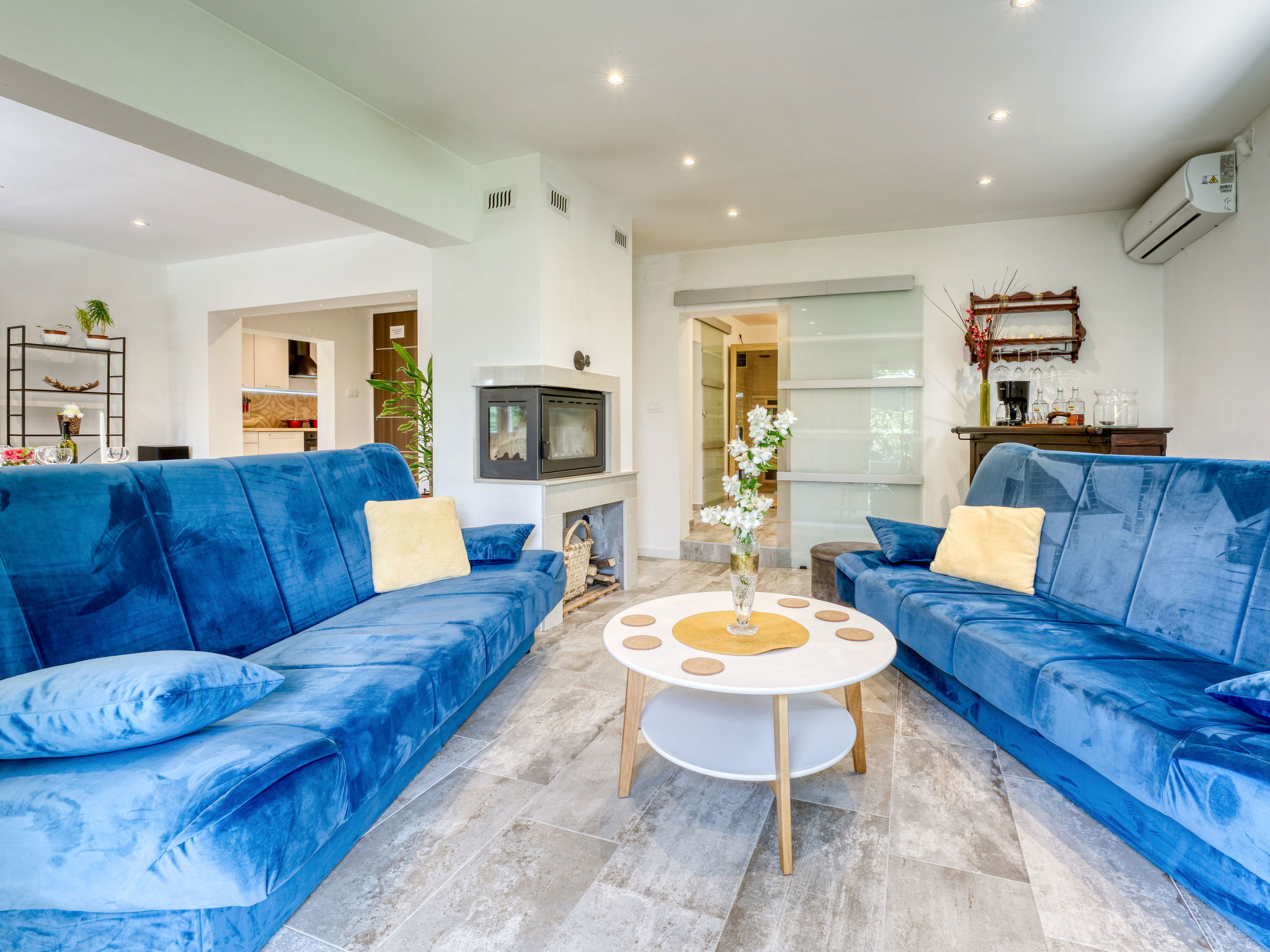 4-room house 150 m2 on 3 levels. Living/dining room with open-hearth fireplace, cable TV and air conditioning. Exit to the terrace. Open kitchen (oven, dishwasher, 4 induction hot plates, toaster, kettle, freezer, electric coffee machine). Shower/WC. Upper floor: entrance hall with air conditioning. 2 rooms, each room with 1 french bed (160 cm, length 200 cm), cable TV. Exit to the balcony. 1 room, without wardrobe with 2 beds (90 cm, length 200 cm), cable TV. Shower/WC. Floor heating, forced-air heating. Balcony 7 m2, terrace 80 m2 partly roofed. Terrace furniture, balcony furniture. View of the countryside and the forest. Facilities: safe, hair dryer, logs (free). Internet (WiFi, free). Please note: suitable for families. Non-smoking house. Maximum 2 pets/ dogs allowed.