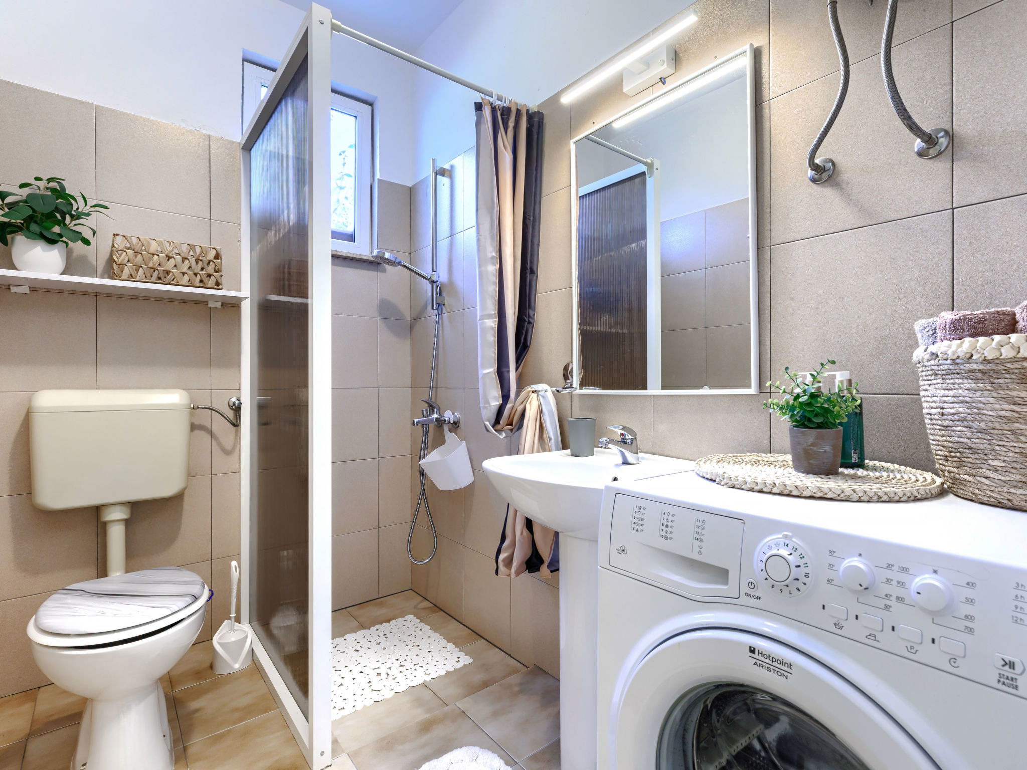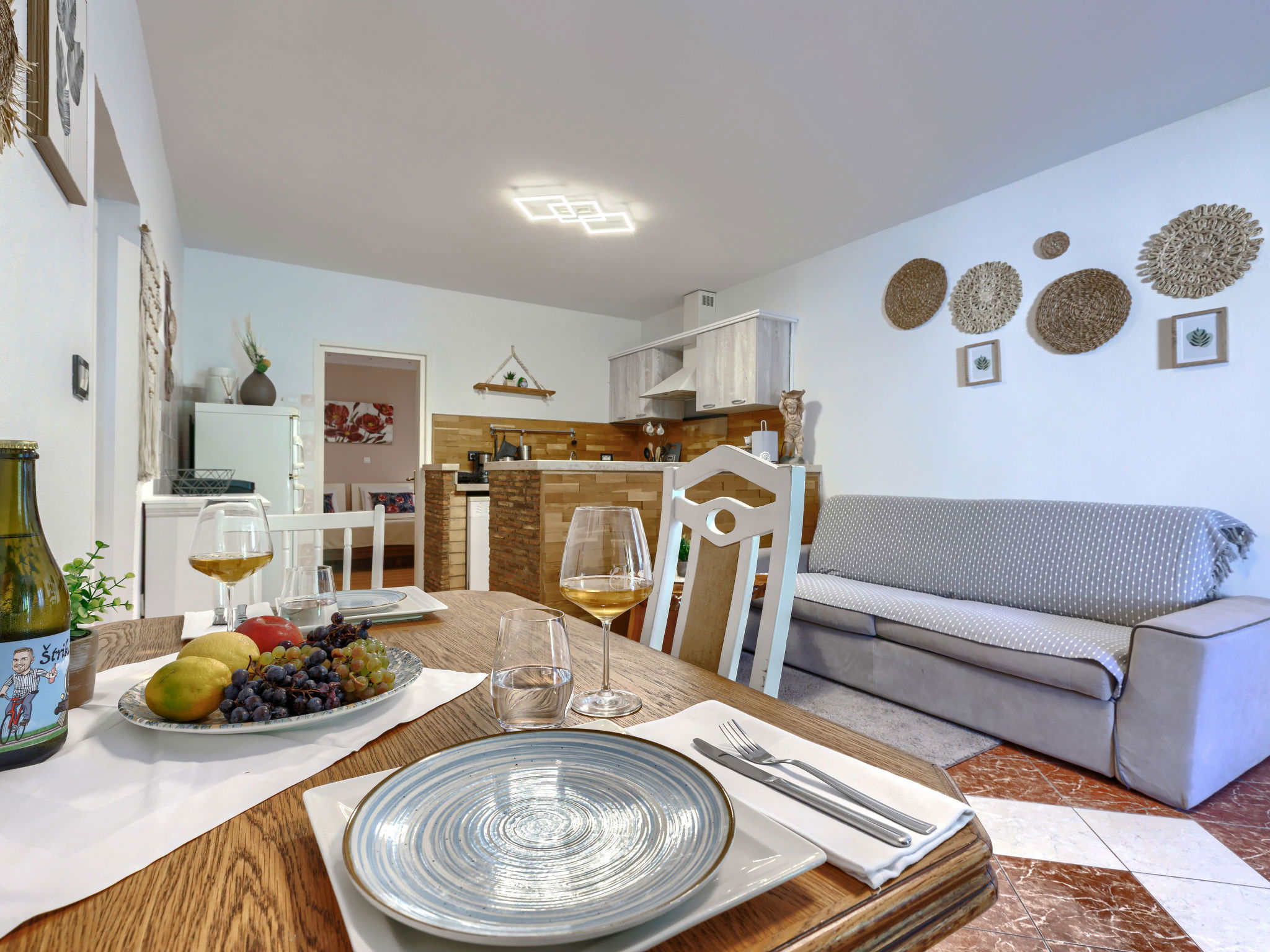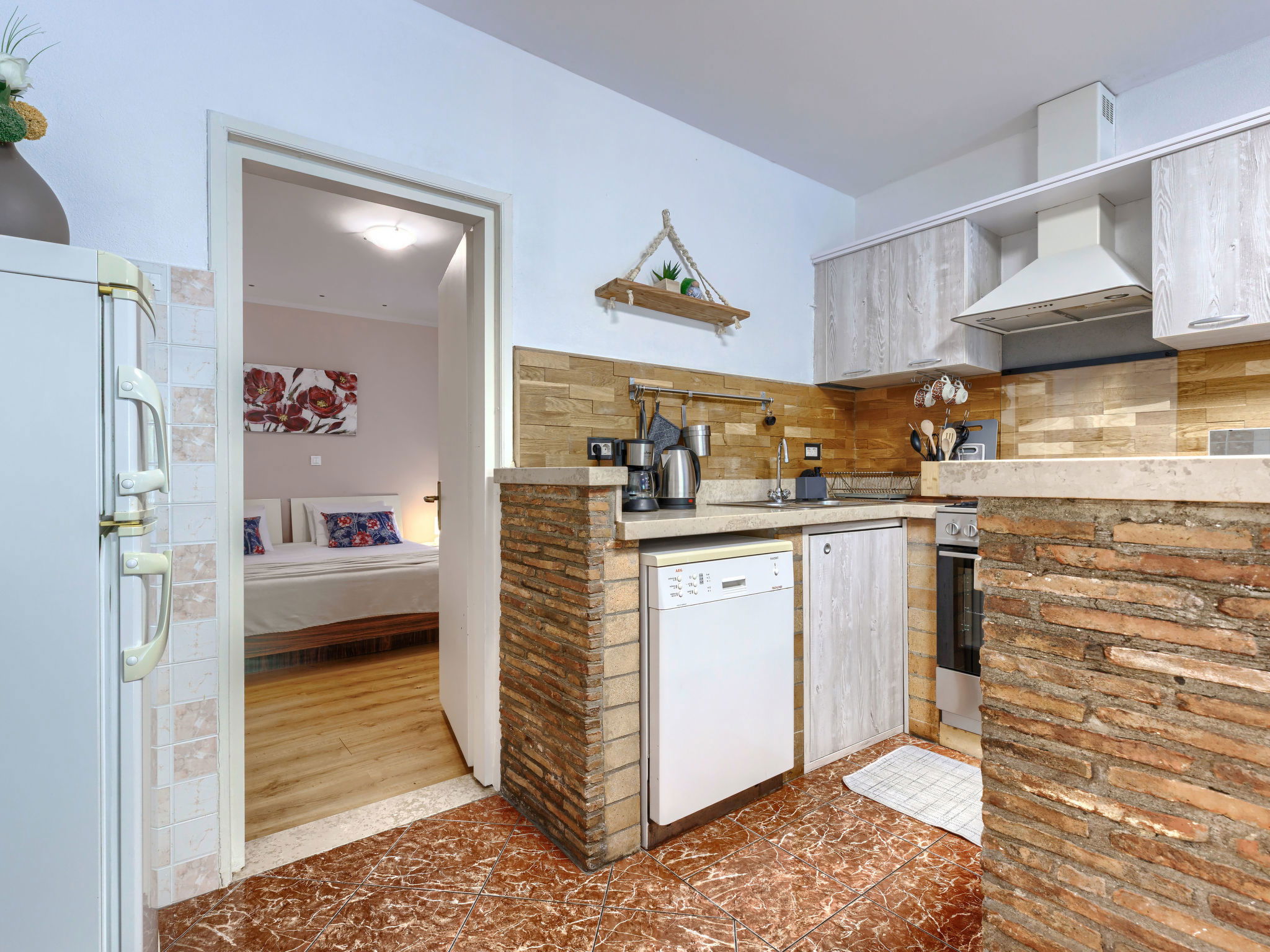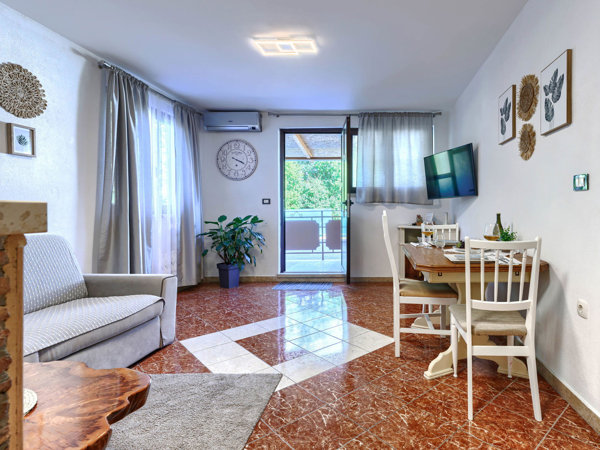 "Viliam", 2-room apartment 50 m2, on the lower ground floor. Living/sleeping room with 1 sofabed, dining table, satellite TV, electric heater and air conditioning. Exit to the terrace. 1 double bedroom. Exit to the terrace. Open kitchen (1 hot plate, oven, dishwasher, 3 gas rings, toaster, kettle, microwave, freezer, electric coffee machine). Shower/WC. Terrace 30 m2 partly roofed. Terrace furniture, barbecue (portable). Facilities: washing machine. Internet (WiFi, free). Please note: non-smokers only. Maximum 1 pet/ dog allowed.