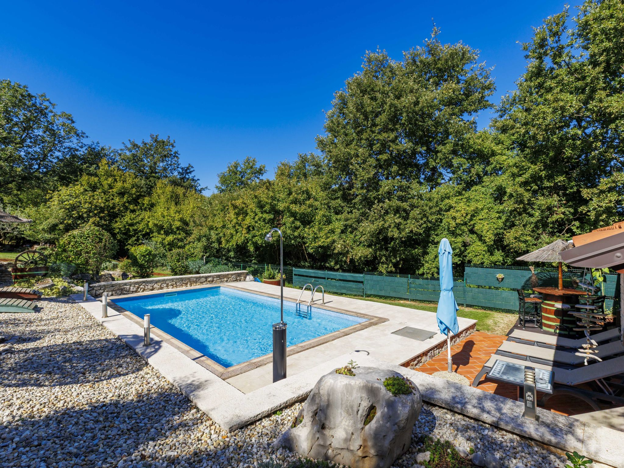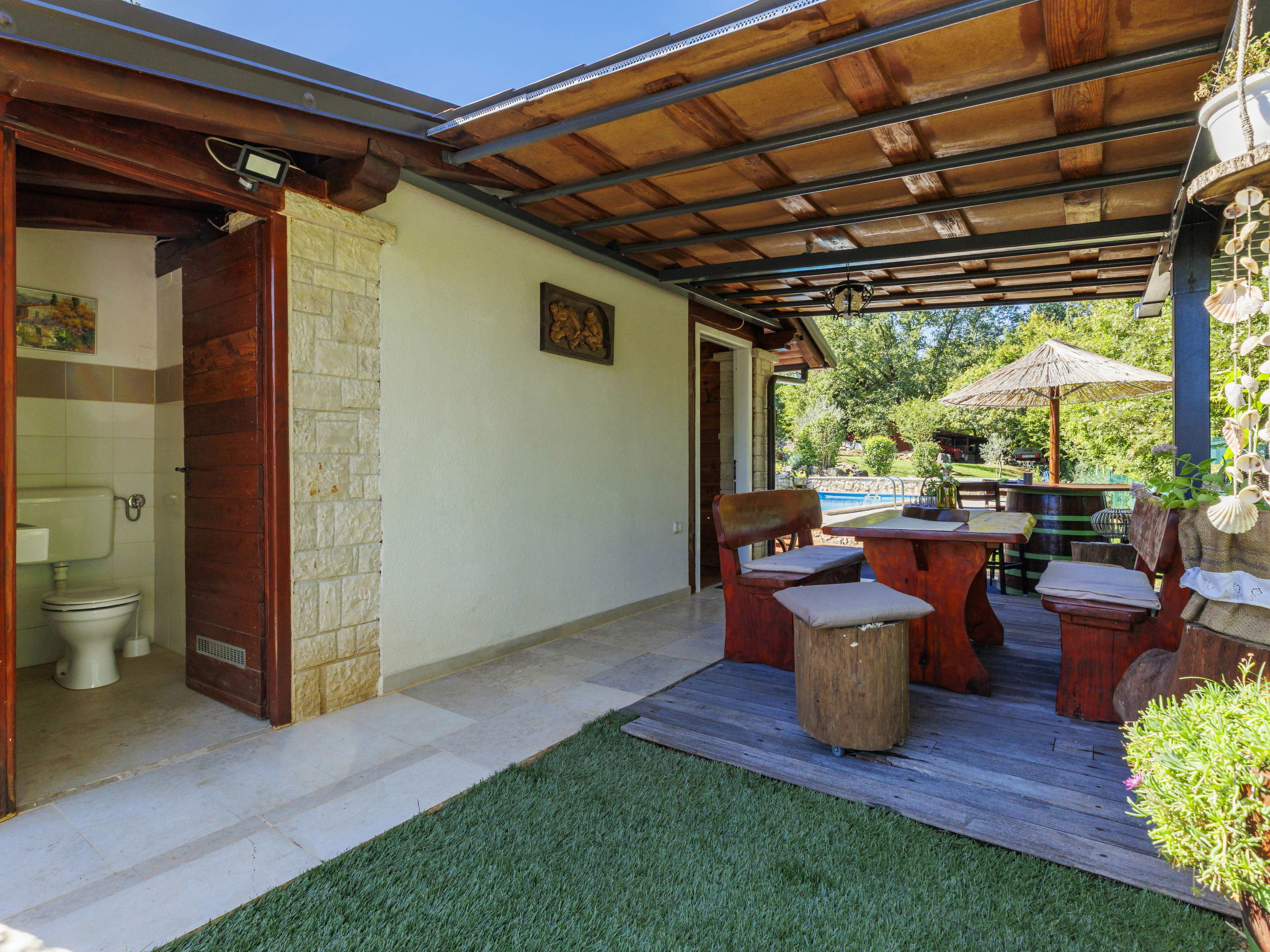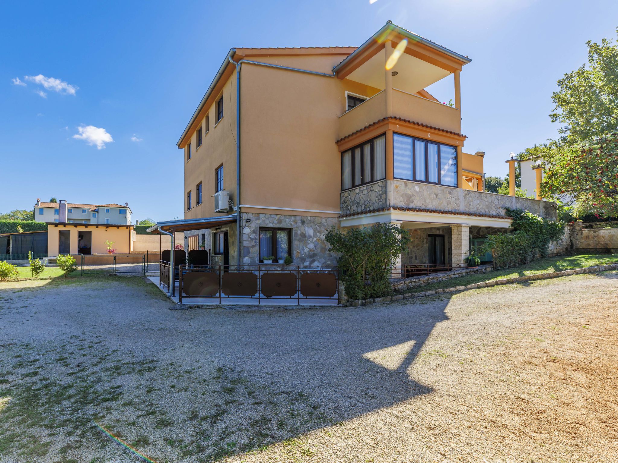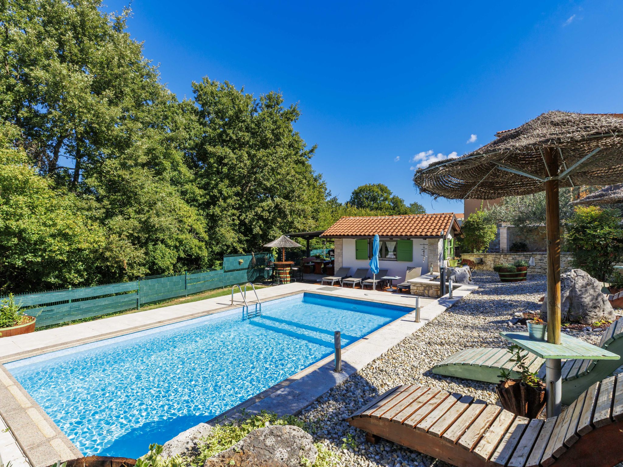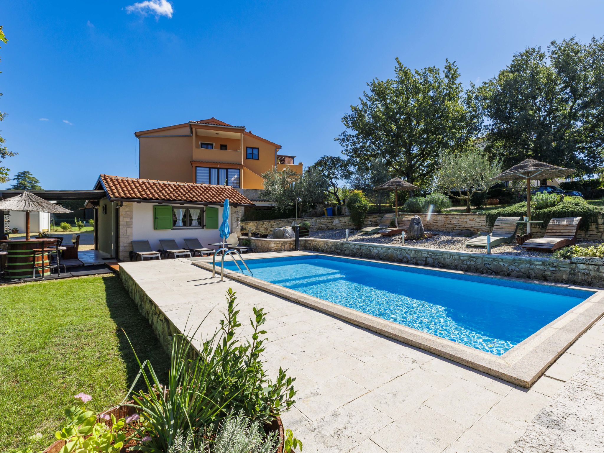 Apartment house "Viliam". 6 apartments in the residence. 100 m from the centre of Sošići, 3 km from the centre of Rovinjsko Selo, 11 km from the centre of Rovinj, 3 km from the sea. For shared use: property 3'500 m2 with lawn and trees, swimming pool angular (8 x 3 m, depth 130 cm, seasonal availability: 01.May. - 08.Oct.). Outdoor shower, terrace (30 m2), garden furniture, barbecue. In the house: internet access. Parking on the premises. Shop 1 km, supermarket 3 km, bus stop 700 m, rocky beach 11 km.