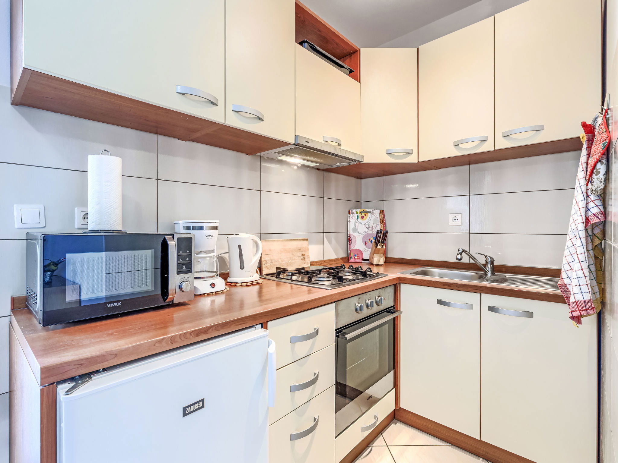 3-room apartment 68 m2 on 1st floor. Cosy furnishings: living/dining room with satellite TV and air conditioning. Exit to the terrace. 1 room with 1 french bed (160 cm, length 200 cm). 1 room with 1 french bed (180 cm, length 200 cm). Exit to the terrace. Open kitchen (1 ceramic glass hob hotplate, 3 gas rings, toaster, kettle, microwave, freezer, electric coffee machine). Shower/WC. Electric heating. Terrace 5 m2, roofed. Terrace furniture. Facilities: hair dryer. Internet (WiFi, free). Please note: maximum 1 pet/ dog allowed. Private entrance.