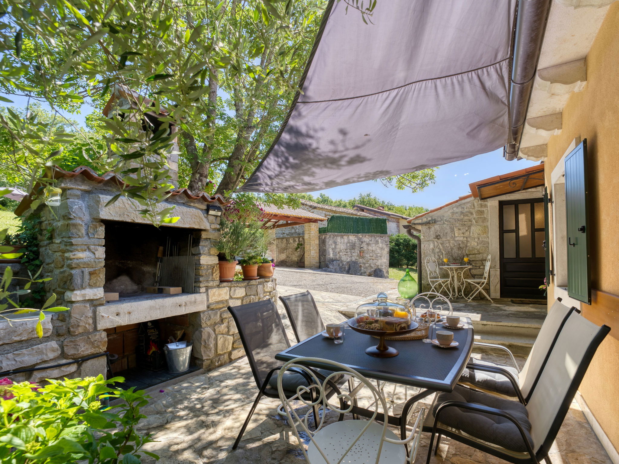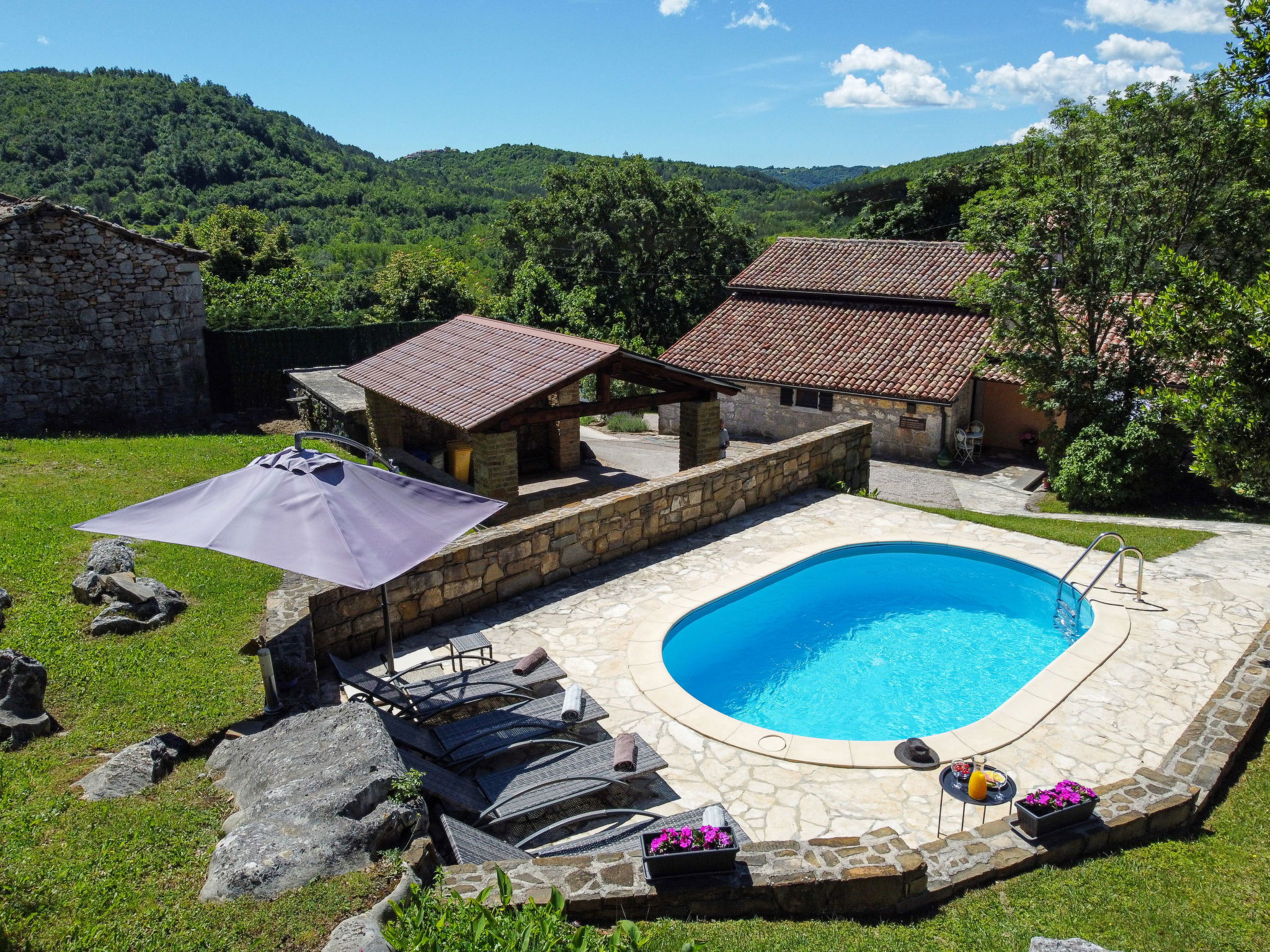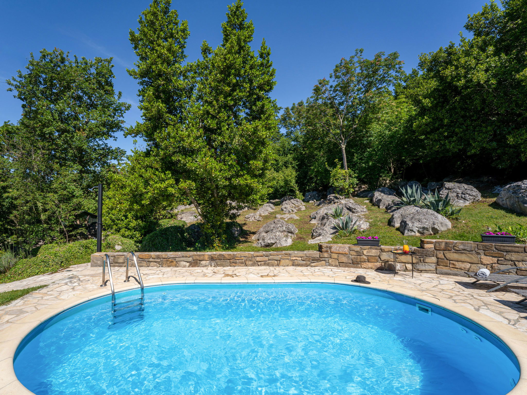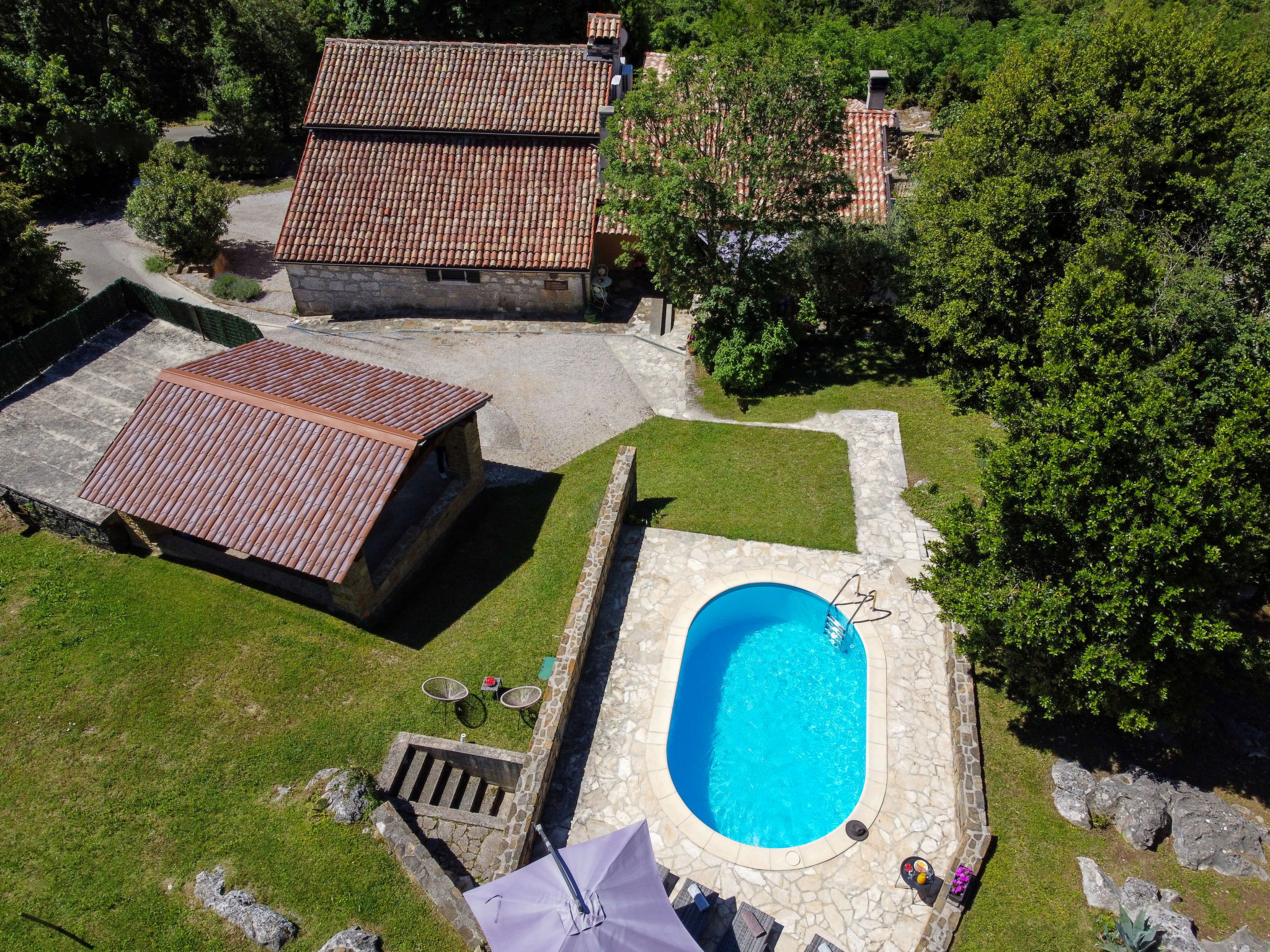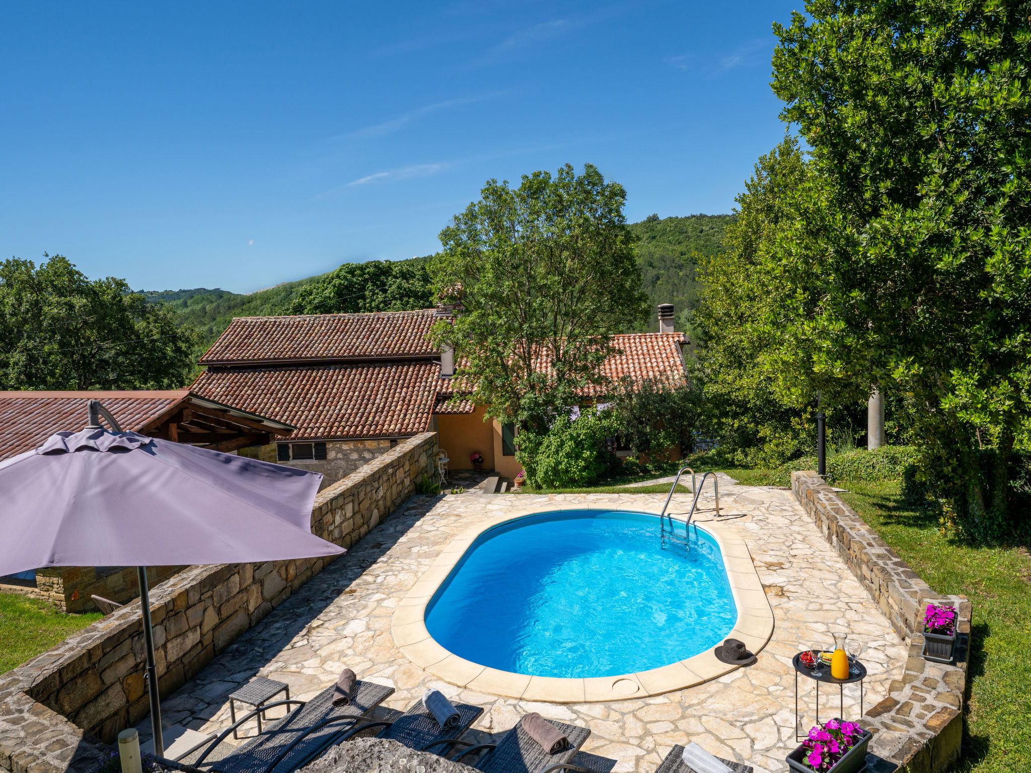 Semi-detached house "Kapitani", 2 storeys, surrounded by trees. In the hamlet Brnobići 2.5 km from the centre of Hum, 5 km from the centre of Roč, 11 km from the centre of Buzet, in a quiet, sunny, elevated position, 40 km from the sea, in a cul-de-sac, in the countryside. Private: property 900 m2, swimming pool (20 m2, depth 130 cm, seasonal availability: 01.Jun. - 30.Sep.). Barbecue. In the house: internet access, washing machine. Parking at the house on the premises. Shop 5 km, restaurant 2.5 km, bus stop 5.1 km, pebble beach 40 km. Ground floor is closed and not occupied.